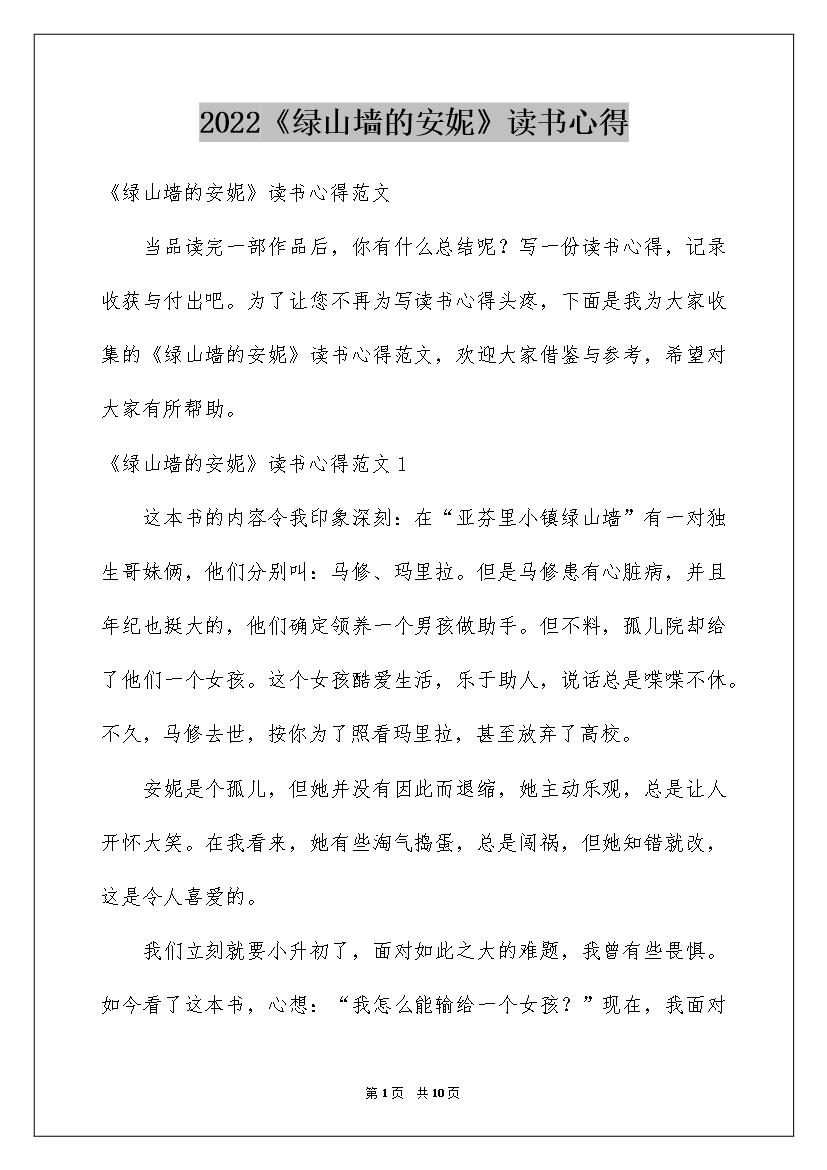 2022《绿山墙的安妮》读书心得《绿山墙的安妮》读书心得范文当品读完一部作品后你有什么总结呢?写一份读书心得记录收获与付出吧。为了让您不再为写读书心得头疼下面是我为大家收集的《绿山墙的安妮》读书心得范文欢迎大家借鉴与参考希望对
