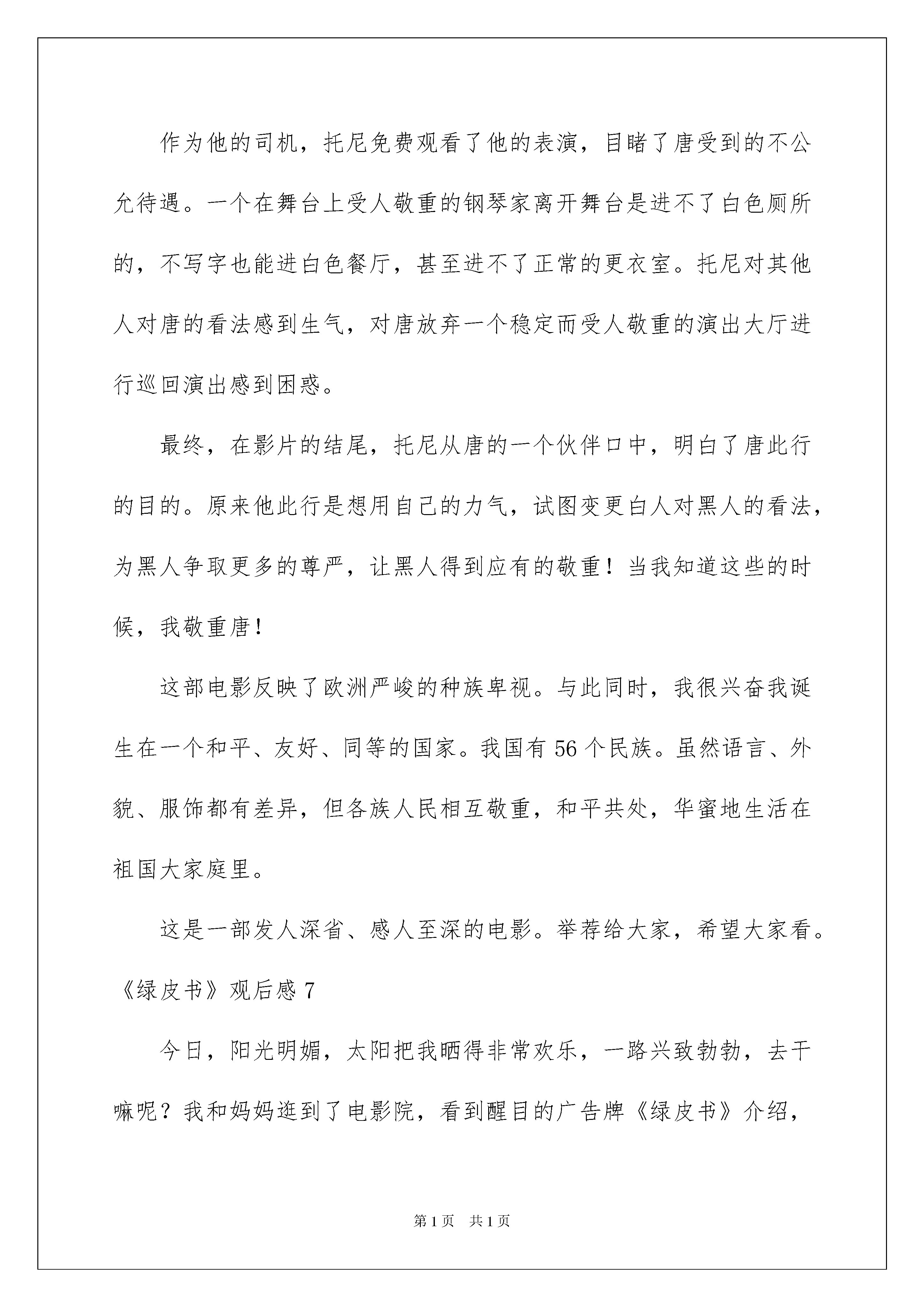 2022《绿皮书》观后感《绿皮书》观后感(15篇)当观看完一部影视作品后,信任大家增长不少见闻吧,不妨坐下来好好写写观后感吧。快来参考观后感是怎么写的吧,以下是我为大家整理的《绿皮书》观后感,欢迎大家共享。《绿皮书》观后感1当看到这部电影的名字时,我在想可能电影讲解并描述的是一个人得到了一本表皮是绿颜色的书,书中有一张藏宝图。然后围绕这本书绽开寻宝
