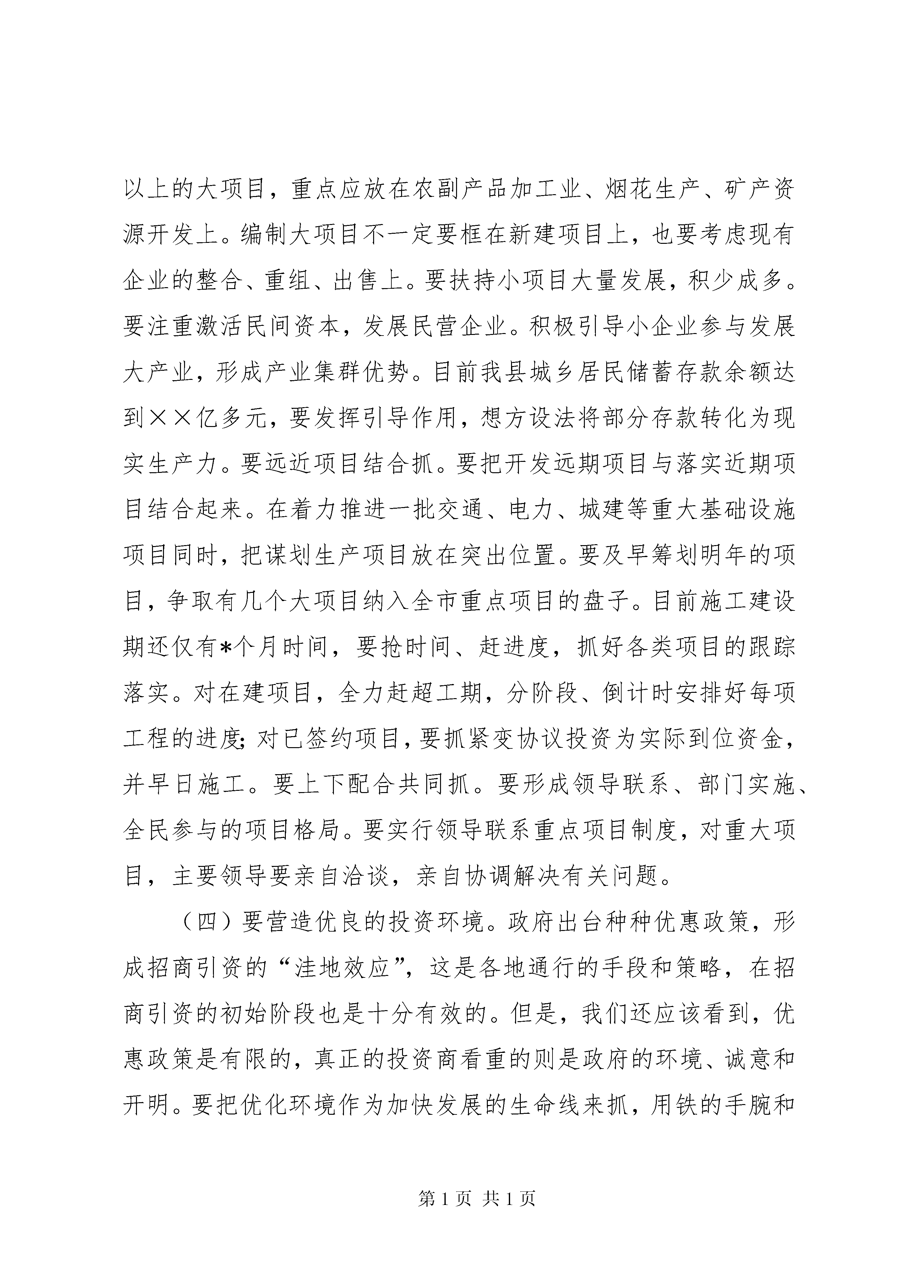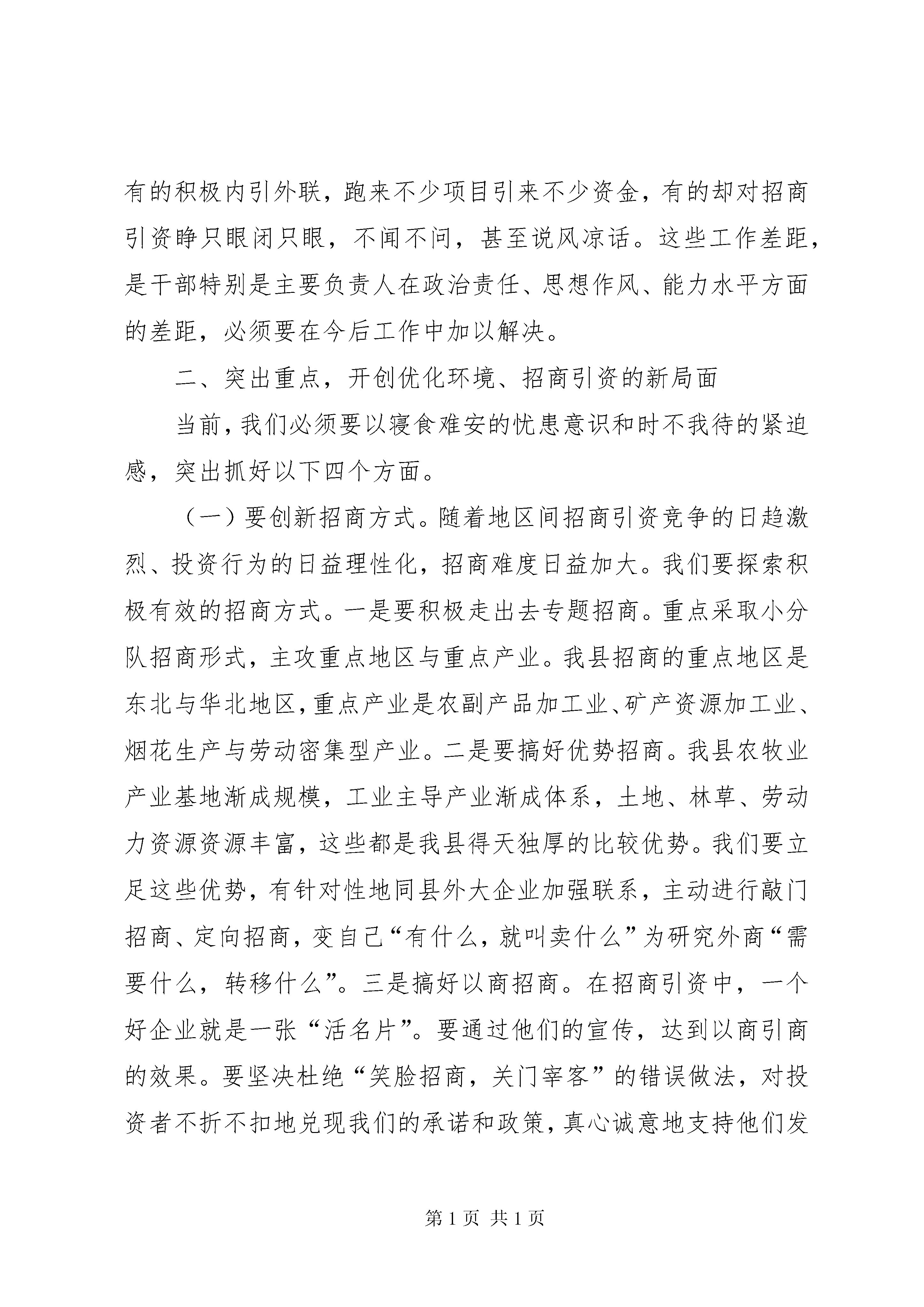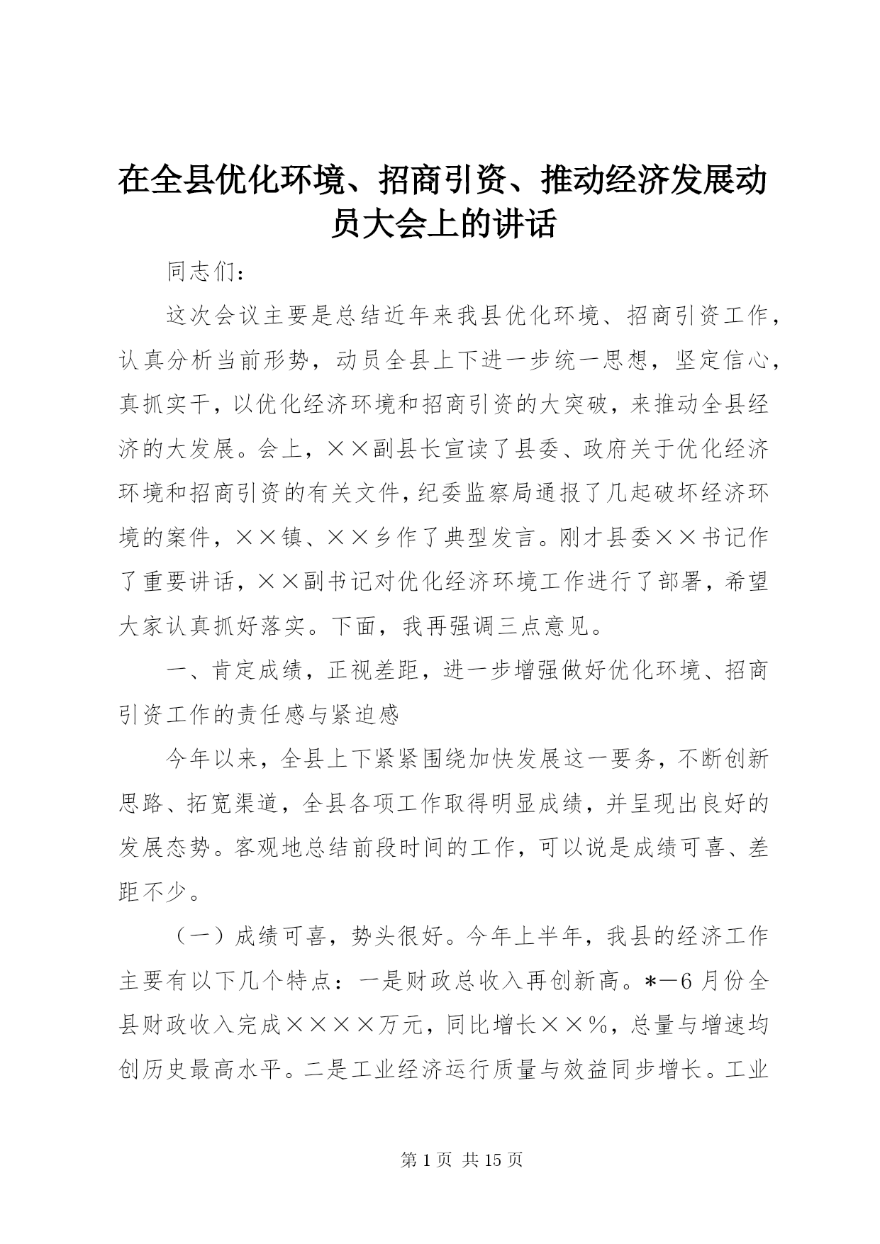 第PAGE\*Arabic\*MERGEFORMAT15页共NUMPAGES\*MERGEFORMAT15页在全县优化环境、招商引资、推动经济发展动员大会上的讲话同志们:这次会议主要是总结近年来我县优化环境、招商引资工作,认真分析当前形势,动员全县上下进一步统一思想,坚定信心,真抓实干,以优化经济环境和招商引资的大突破,来推动全县经济的大发展。会上,××副县长宣读了县委、政府关于优化经济环境和招商引资的有关文件,纪委监察局通报了几起破坏经济环境的案件,××镇、××乡作了典型发言。刚才县委××书