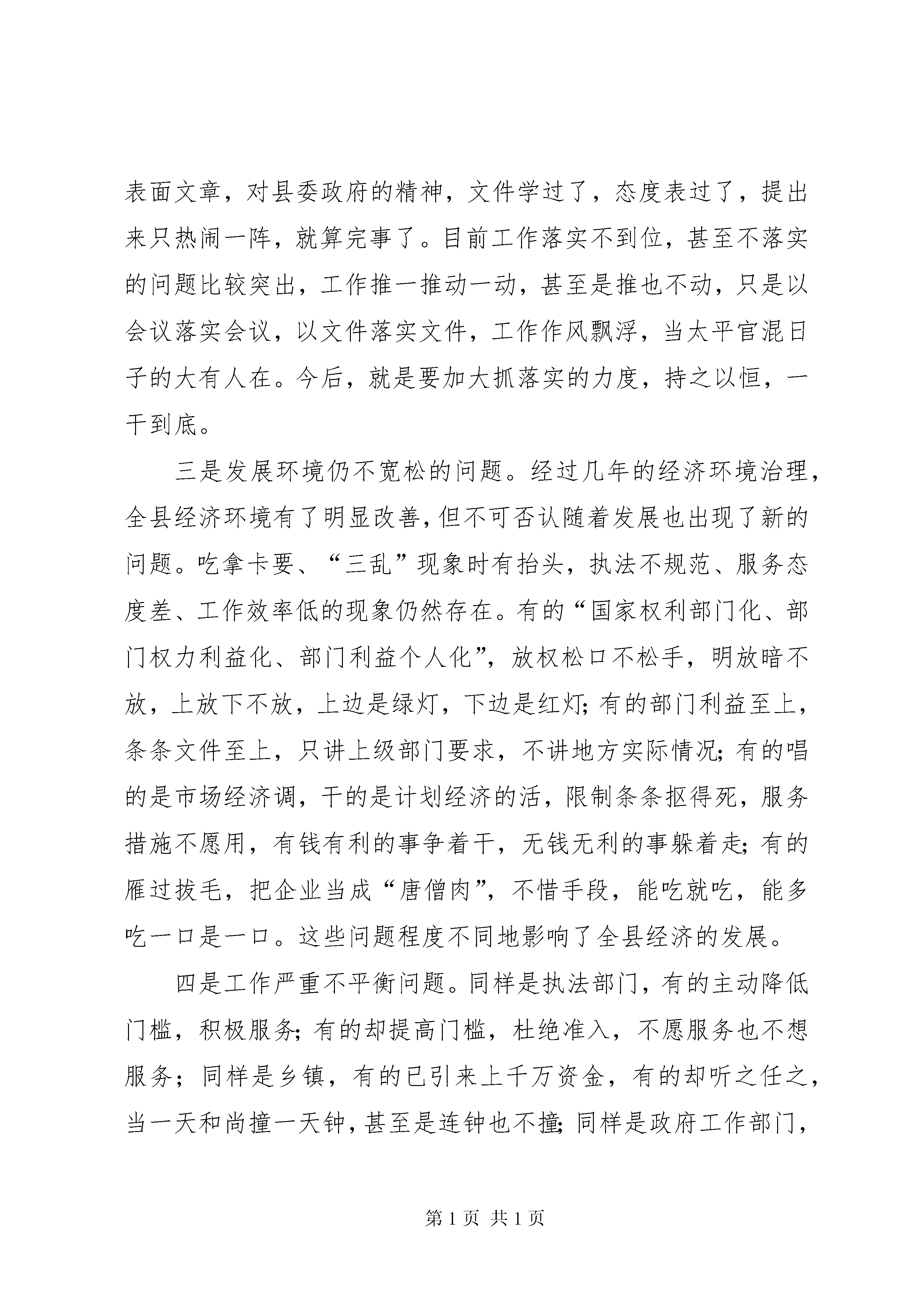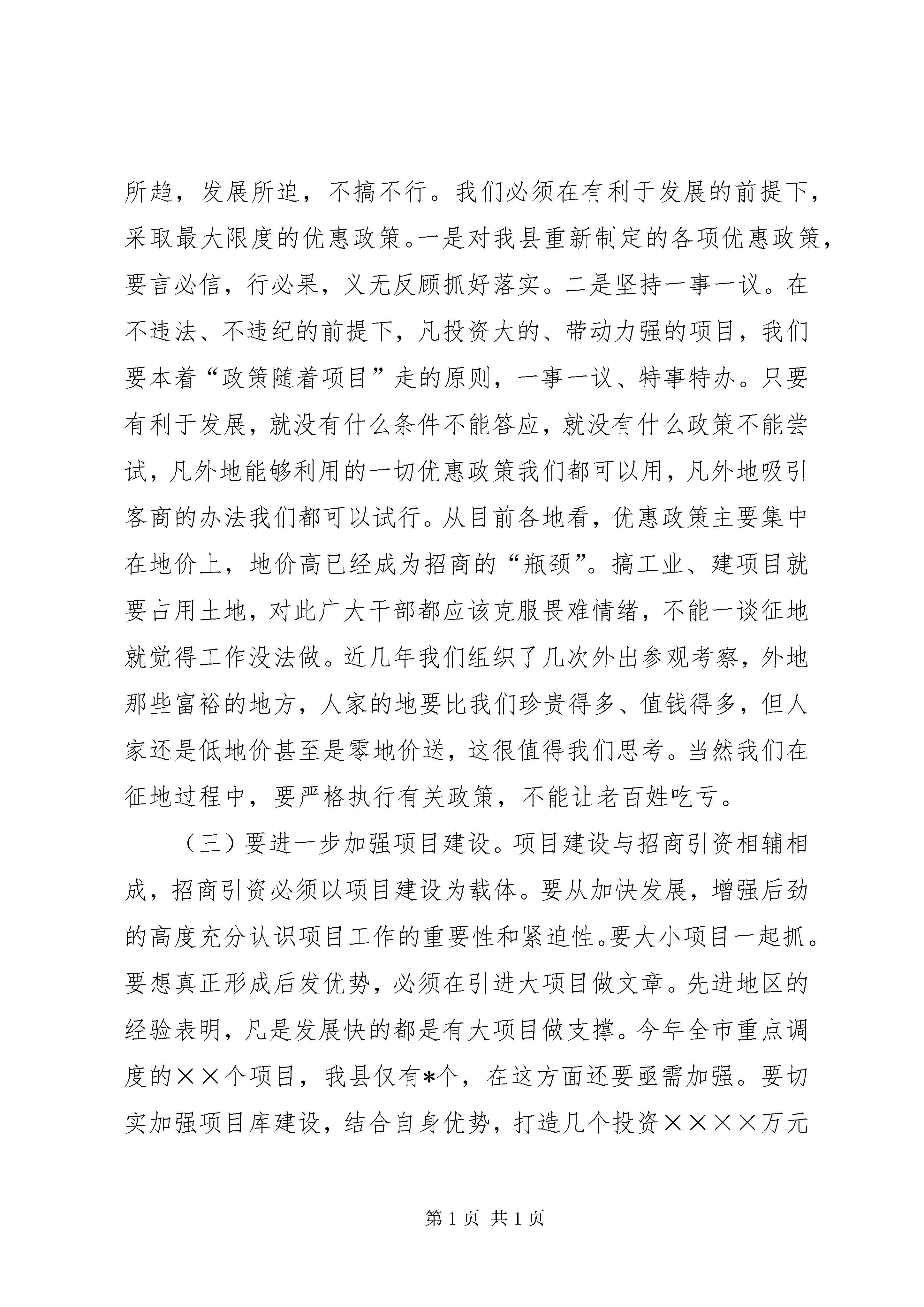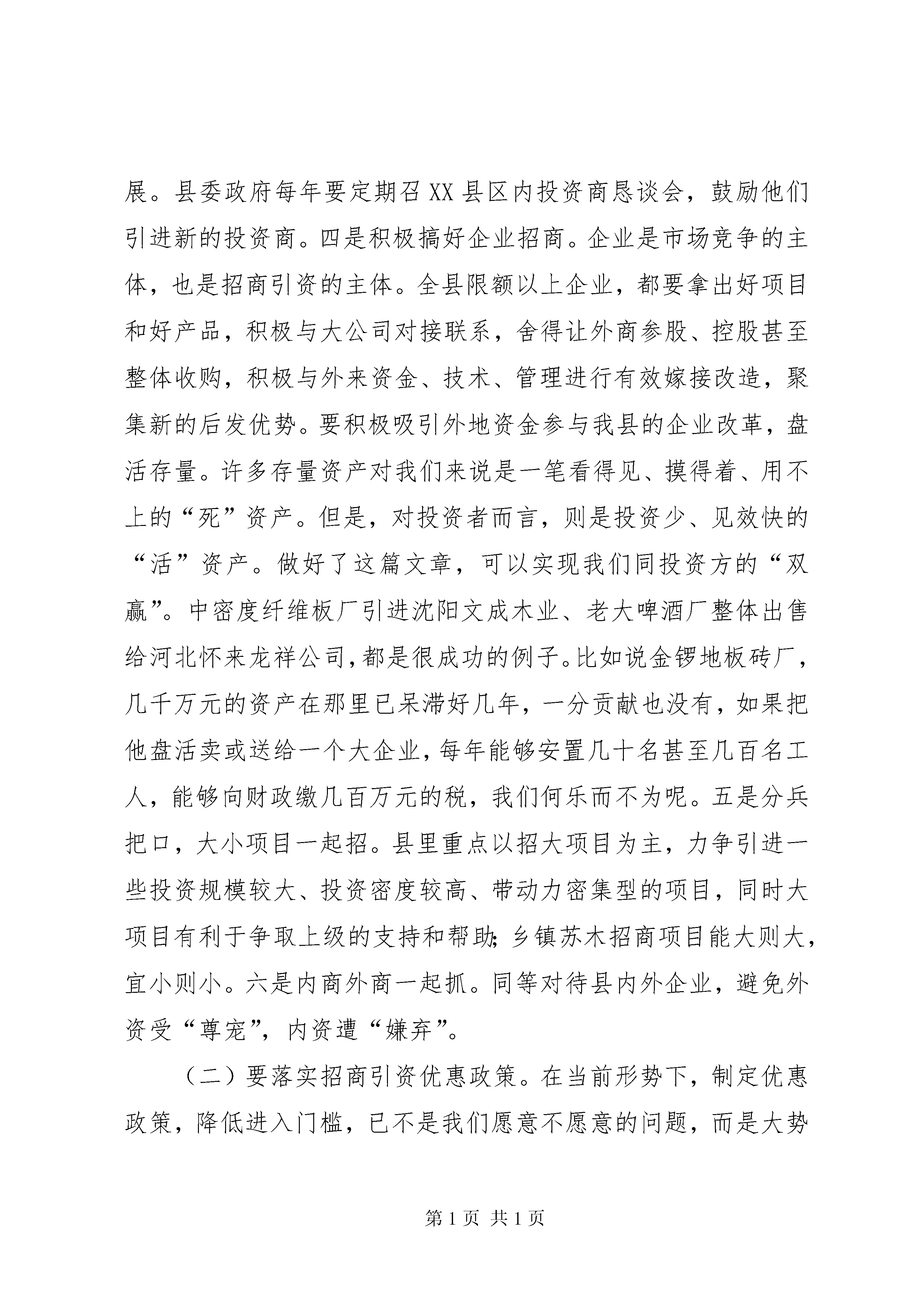 第PAGE\*Arabic\*MERGEFORMAT15页共NUMPAGES\*MERGEFORMAT15页在全县优化环境、招商引资、推动经济发展动员大会上的讲话同志们:这次会议主要是总结近年来我县优化环境、招商引资工作,认真分析当前形势,动员全县上下进一步统一思想,坚定信心,真抓实干,以优化经济环境和招商引资的大突破,来推动全县经济的大发展。会上,××副县长宣读了县委、政府关于优化经济环境和招商引资的有关文件,纪委监察局通报了几起破坏经济环境的案件,××镇、××乡作了典型发言。刚才县委××书