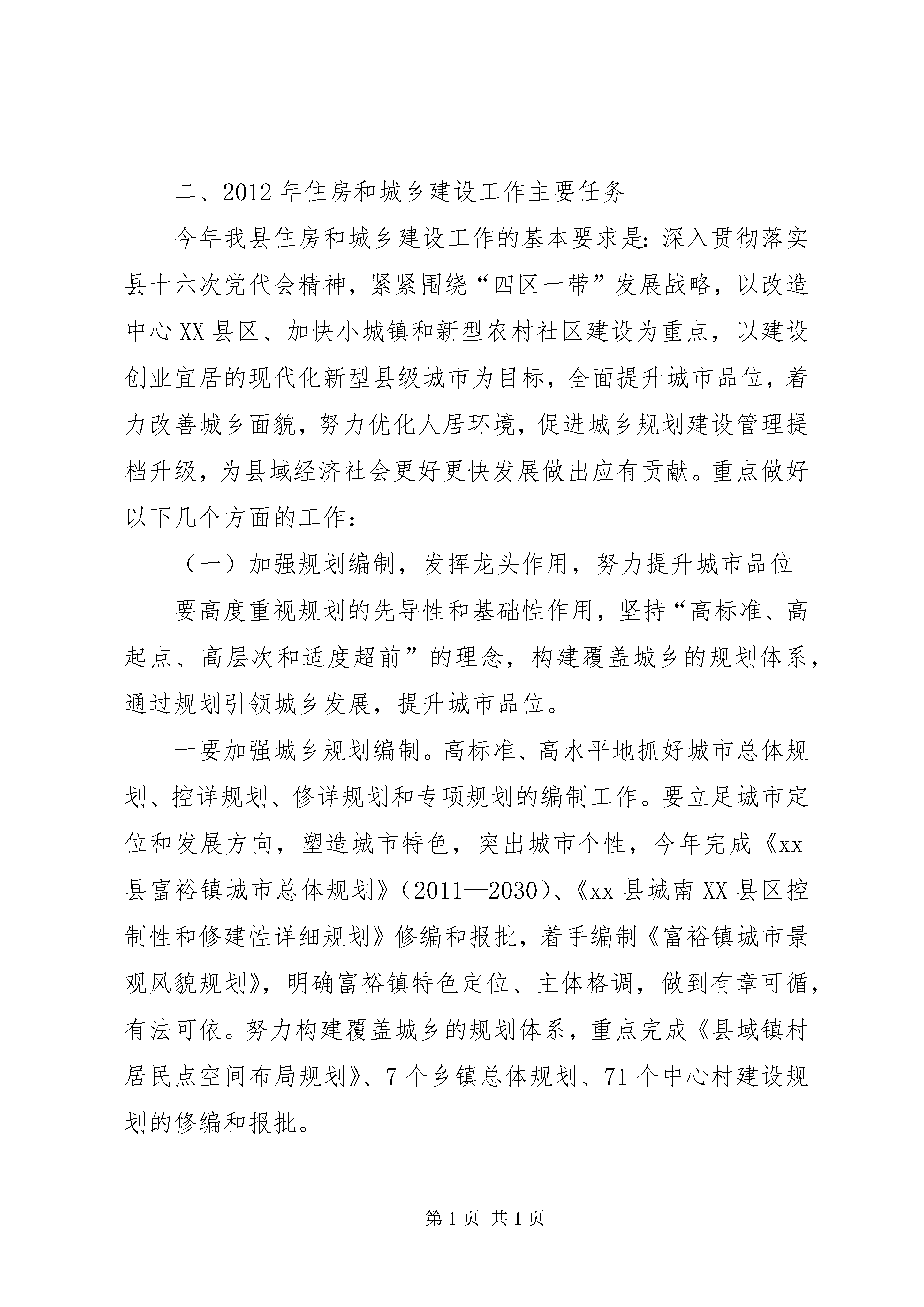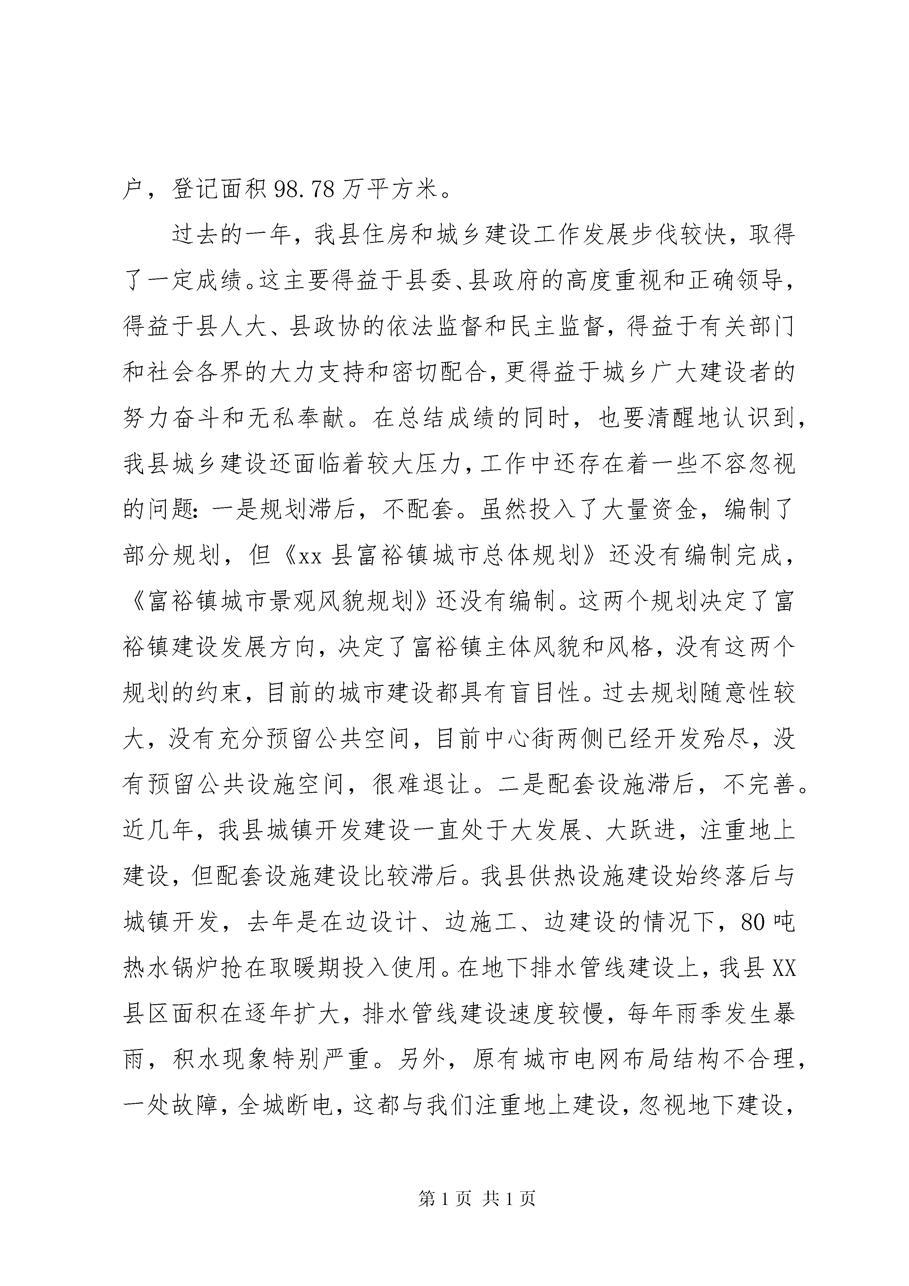 在全县住房和城乡建设工作会议上的讲话同志们:这次会议是县委县政府决定召开的一次重要会议,会议的主要任务是,深入贯彻落实省市县相关会议精神,总结工作,查找问题,部署任务,组织和动员全县广大干部群众,进一步解放思想,把握机遇,攻坚克难,狠抓落实,推动我县住房和城乡建设工作再上新台阶。县委、县政府对召开这次会议高度重视,专门责成住建局等相关部门对我县城乡建设工作和房地产开发工作进行了深入的调查研究。同时,市委常委、县委书记陈宏伟同志亲自带队,率领有关部门赴我省城乡建设较好的饶河、宝清、
