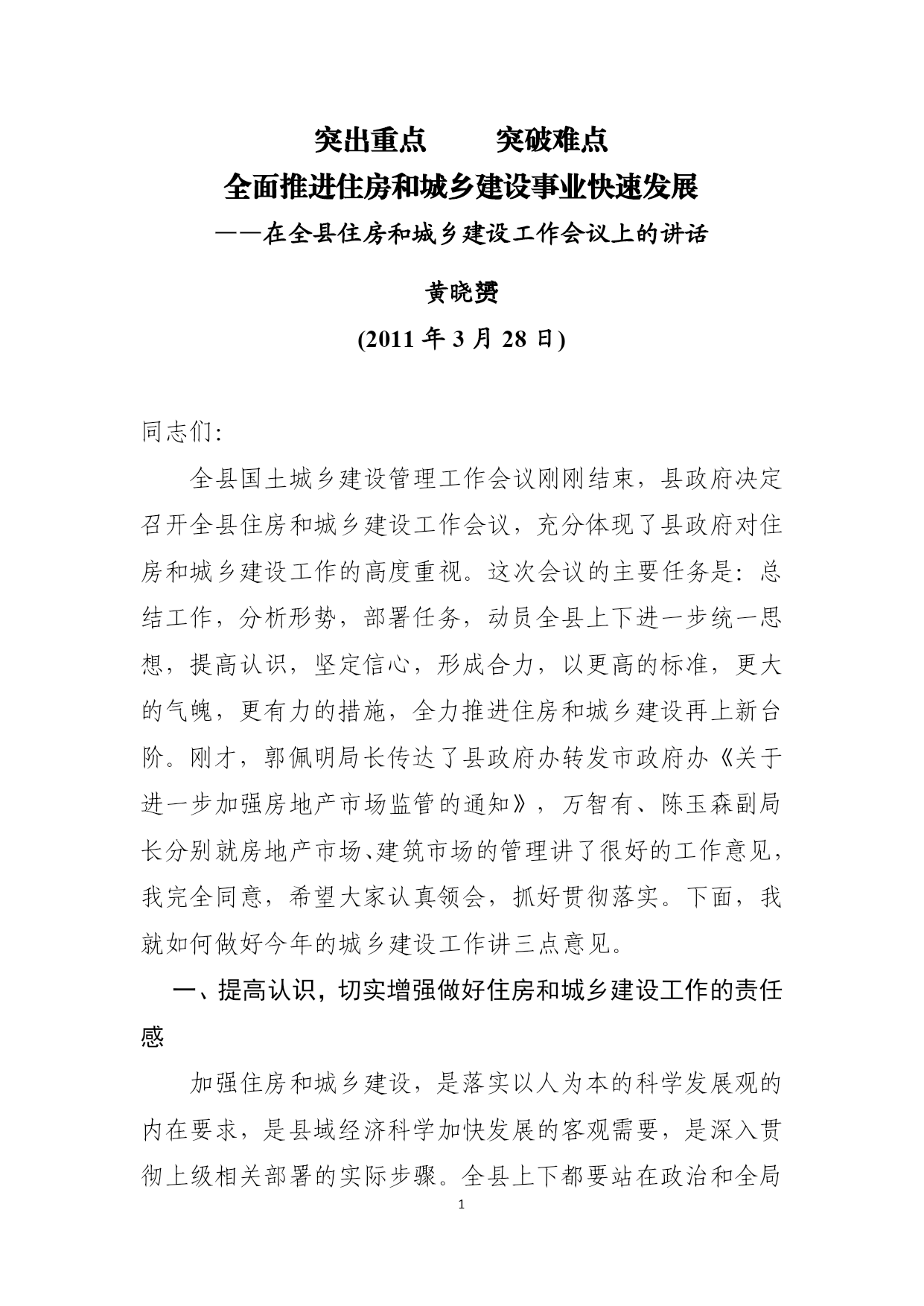 在全县住房和城乡建设工作会议上的讲话突出重点突破难点全面推进住房和城乡建设事业快速发展——在全县住房和城乡建设工作会议上的讲话黄晓赟(2011年3月28日)同志们:全县国土城乡建设管理工作会议刚刚结束县政府决定召开全县住房和城乡建设工作会议充分体现了县政府对住房和城乡建设工作的高度重视。这次会议的主要任务是:总结工作分析形势部署任务动员全县上下进一步统一思想提高认识坚定信心形成合力以更高的标准更大的气魄更有力的措施全力推进住房和城