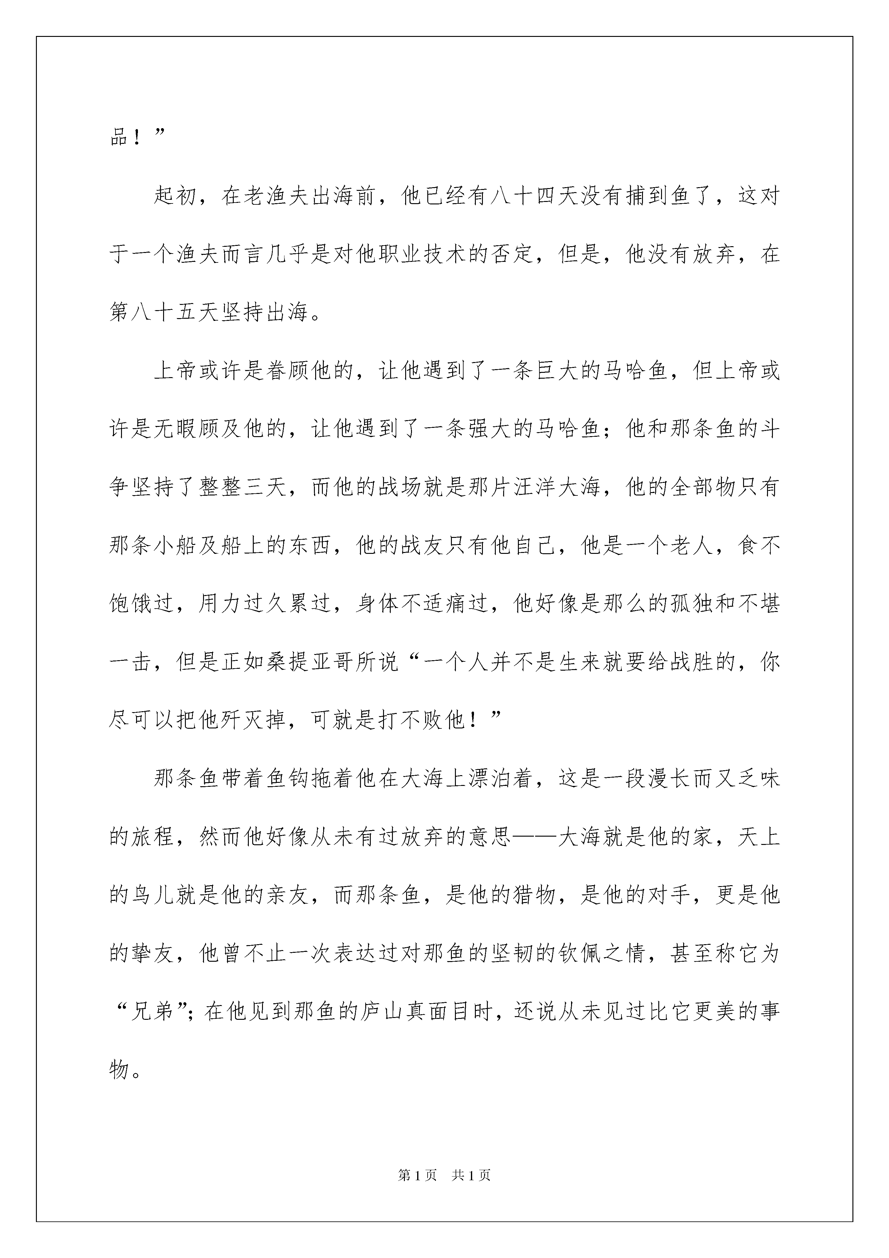 2022《老人与海》读书心得《老人与海》读书心得集锦15篇当我们积累了新的体会时,就很有必要写一篇心得体会,这样能够让人头脑更加醒悟,目标更加明确。那么如何写心得体会才能更有感染力呢?下面是我帮大家整理的《老人与海》读书心得,供大家参考借鉴,希望可以帮助到有须要的挚友。《老人与海》读书心得1这篇文章讲解并描述了老人视海鸥为儿女,给它们起名字,喂饼干