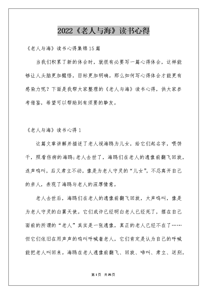 2022《老人与海》读书心得《老人与海》读书心得集锦15篇当我们积累了新的体会时,就很有必要写一篇心得体会,这样能够让人头脑更加醒悟,目标更加明确。那么如何写心得体会才能更有感染力呢?下面是我帮大家整理的《老人与海》读书心得,供大家参考借鉴,希望可以帮助到有须要的挚友。《老人与海》读书心得1这篇文章讲解并描述了老人视海鸥为儿女,给它们起名字,喂饼干,