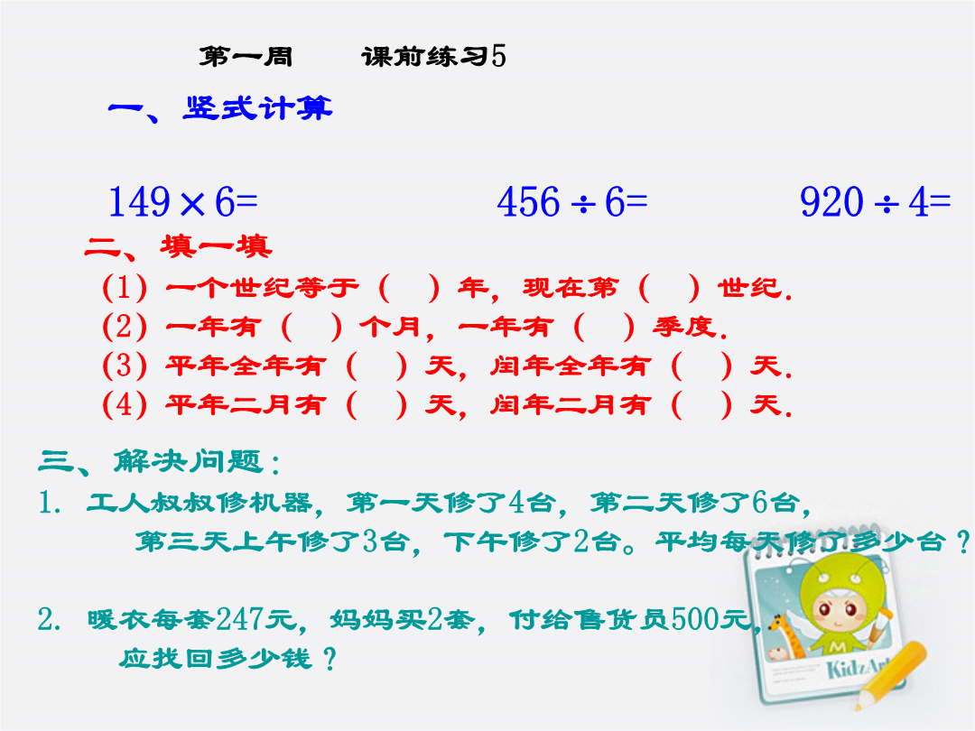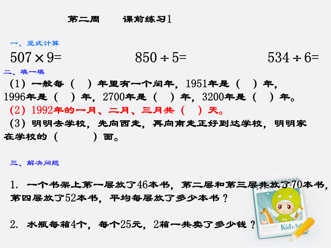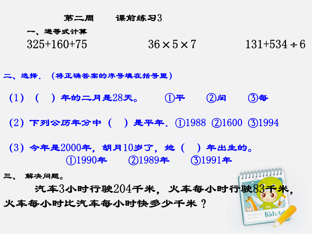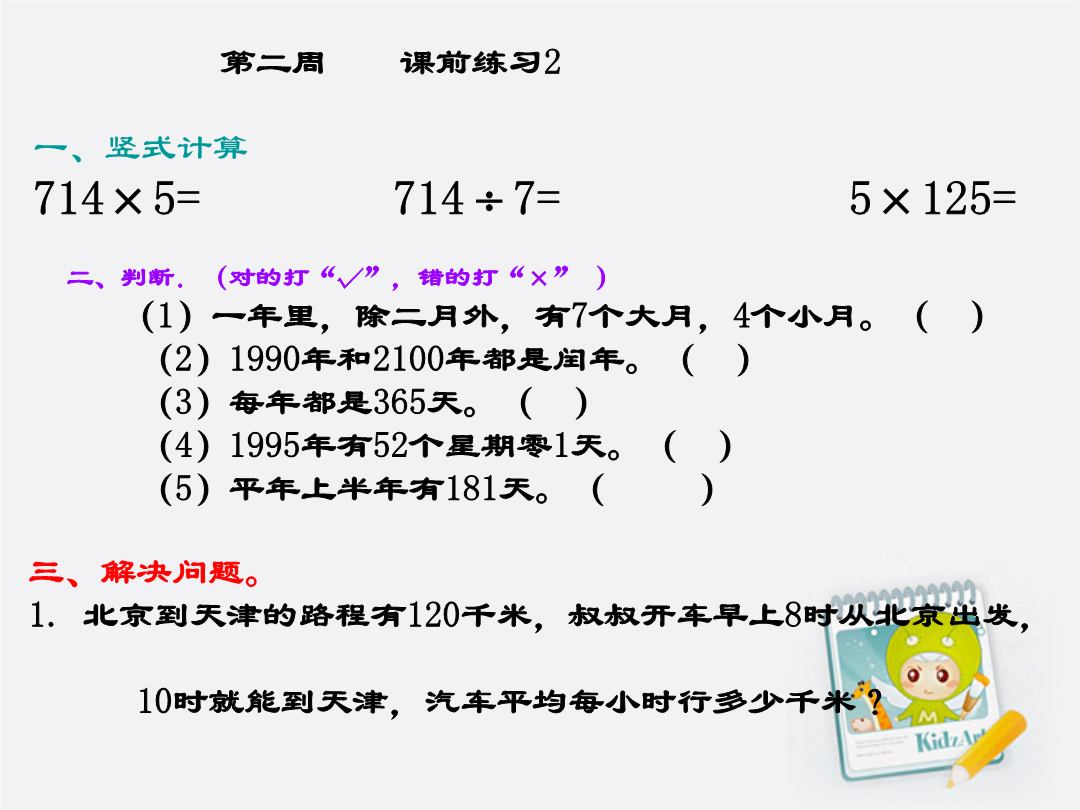 人教新课标三年级数学下册学习目标第一周课前练习1第一周课前练习4第一周课前练习5一、竖式计算507×9=850÷5=534÷6=二、判断.(对的打“√”错的打“×”)(1)一年里除二月外有7个大月4个小月。()(2)1990年和2100年都是闰年。()(3)每年都是365天。()(4)1995年有52个星期零1天。()(5)平年上半年有181天。()一、递等式计算325+160+75