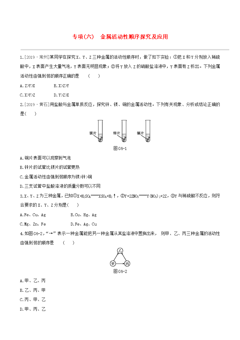 专项(六)金属活动性顺序探究及应用1.[2019·常州]某同学在探究X、Y、Z三种金属的活动性顺序时做了如下实验:①把X和Y分别放入稀硫酸中X表面产生大量气泡Y表面无明显现象;②将Y放入Z的硝酸盐溶液中Y表面有Z析出。下列金属活动性由强到弱的顺序正确的是()A.Z>Y>XB.X>Z>YC.X>Y>ZD.Y>Z>X2.[2019·黄石]用盐酸与金属单质反应探究锌、镁、铜的金属活动性。下列有关现象、分析或结论正确的是()图G6-1A.铜片表面可以观察到气泡B.锌片的试管比镁片的试管更热C.金属活动性