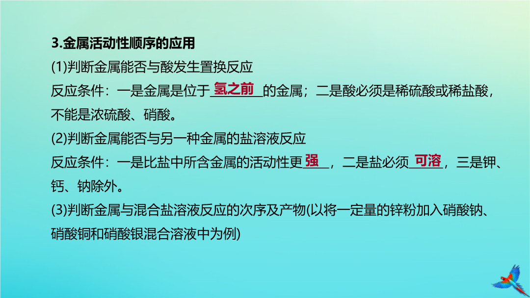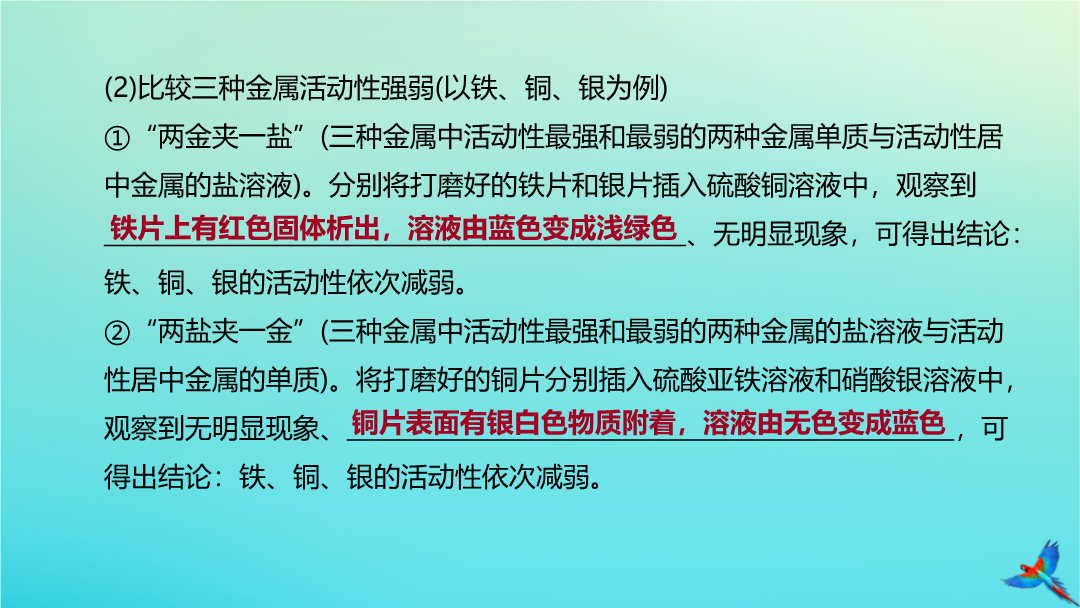 1.实验设计方案实验一比较两种金属活动性的方法(续表)实验二比较三种金属(Fe、Cu、Ag)的活动性强弱实验二比较三种金属(Fe、Cu、Ag)的活动性强弱2.实验注意事项(1)实验前金属必须打磨,除去表面的氧化膜或污物。(2)判断三种以上金属的活动性顺序时,可先用酸将其分类,再根据以上实验一、实验二提供的方法进行探究。(3)金属与酸反应时,一般选用稀硫酸或稀盐酸,不用硝酸或浓硫酸。(4)金属与盐的反应,盐必须。(5)并不是所有排在前面的金属都能将排在后面的金属从其盐溶液中置换出来,如钾、钙、