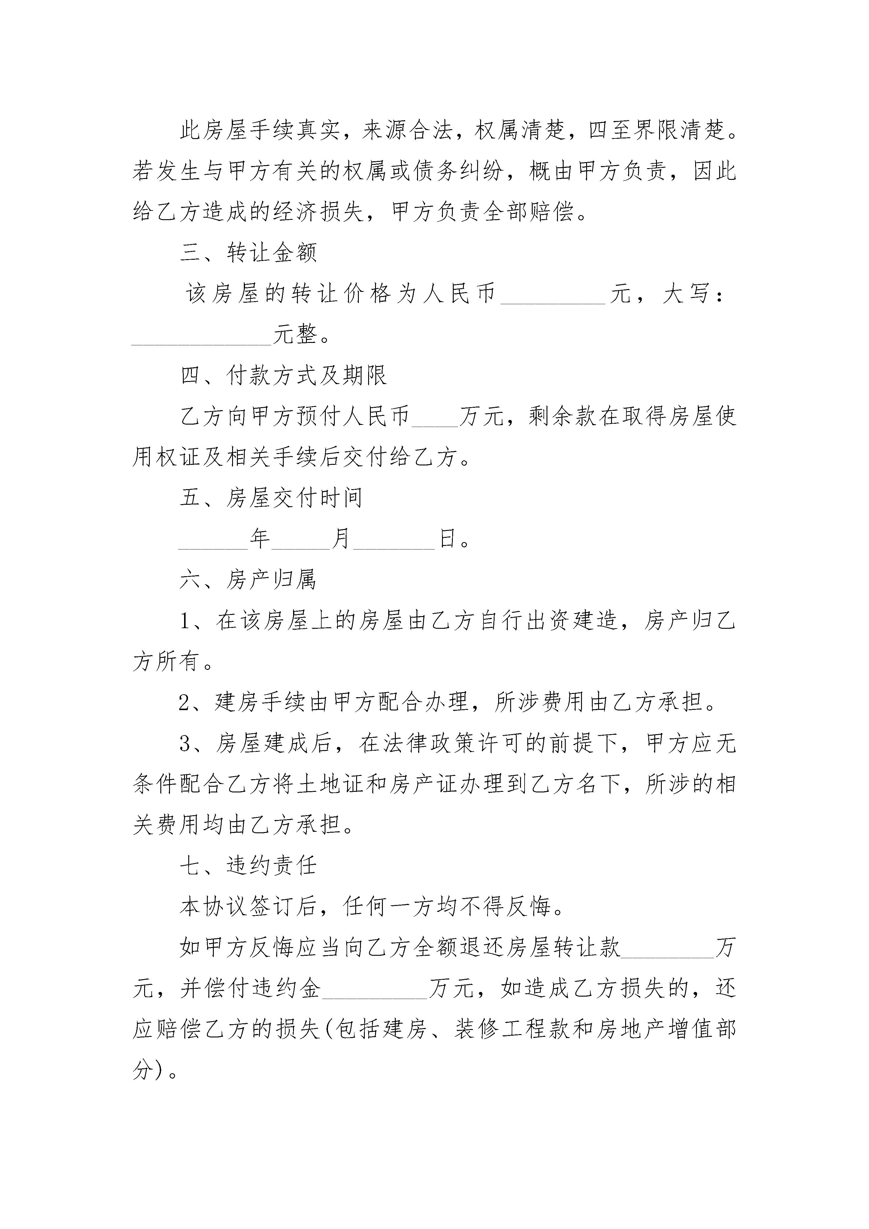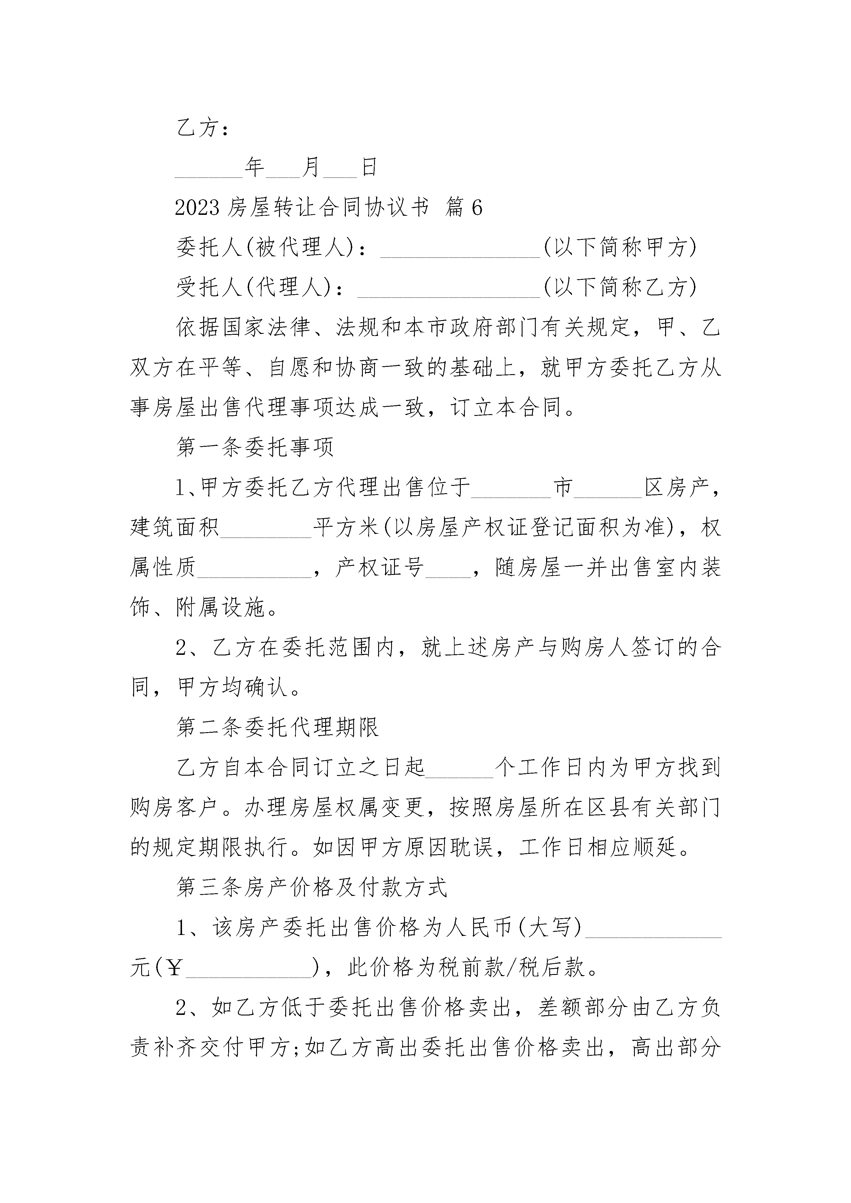 房屋转让合同协议书2023房屋转让合同协议书2023(精选24篇)房屋转让合同协议书2023篇1转让方(以下简称甲方):工作单位:住址:身份证号:受让方(以下简称乙方):工作单位:住址:身份证号:经自愿协商达成一致,甲方将自己合法拥有的一套房屋转让给乙方,双方就房屋转让相关事宜达成以下合同条款,以资共同遵守:第一条转让房屋的基本情况。转让房屋(以下简称该房屋)位于兰州市区路号单元层室,房屋结构为,建筑面积平方米(包括卧室、客厅、卫生间、厨房、阳台、及其附属设施),实际使用面积平方米。第二条转让价格。双