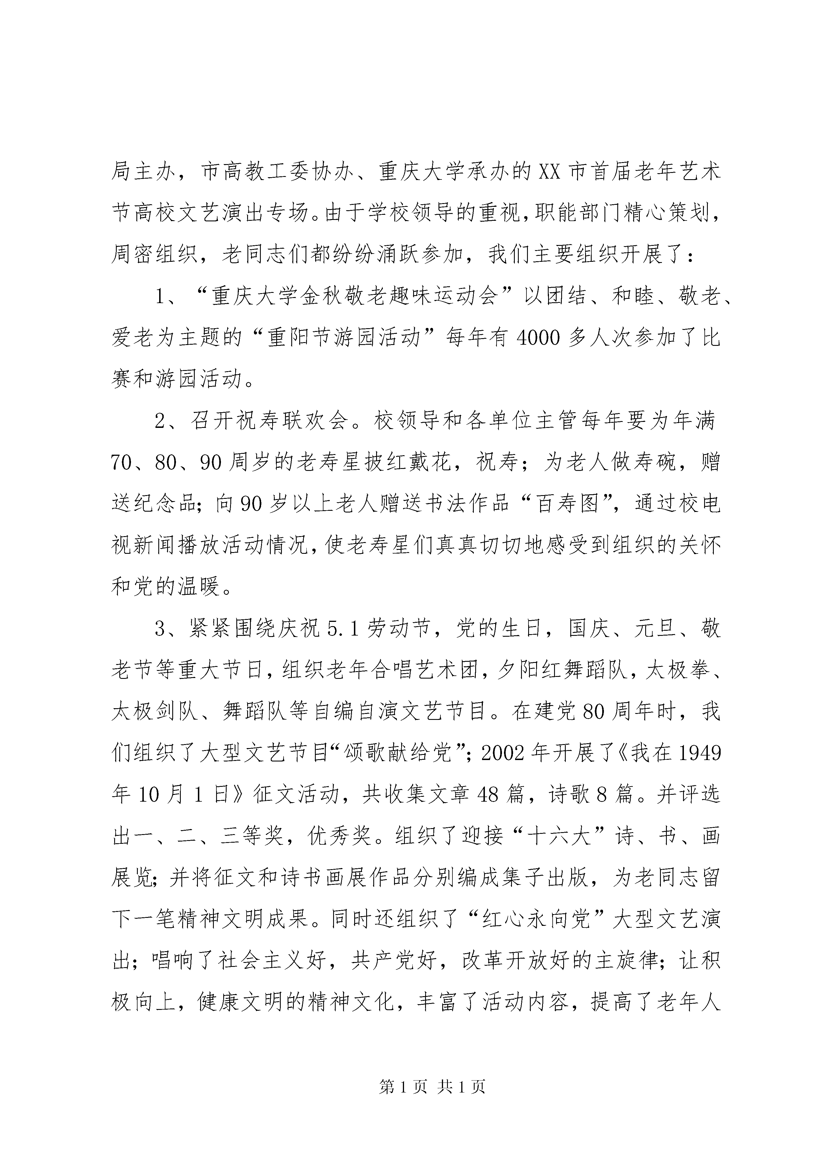 第PAGE\*Arabic\*MERGEFORMAT11页共NUMPAGES\*MERGEFORMAT11页学校尊老敬老爱老工作经验汇报材料我校开展敬老活动的几点做法一个国家对老人的态度,反映一个国家的文明程度,代表着一个国家民族的文化素质。中华民族上下五千年,有着悠久的历史,光辉灿烂的文化。享有文明古国,礼仪之邦的美誉,更有尊老、敬老、爱老的传统美德,华夏儿女继承弘扬了这一优秀文化传统。在新的时期,党中央国务院更加重视国民精神道德建设,提出了“以德治国”的方略,颁布了《公民道德建设实施纲要》
