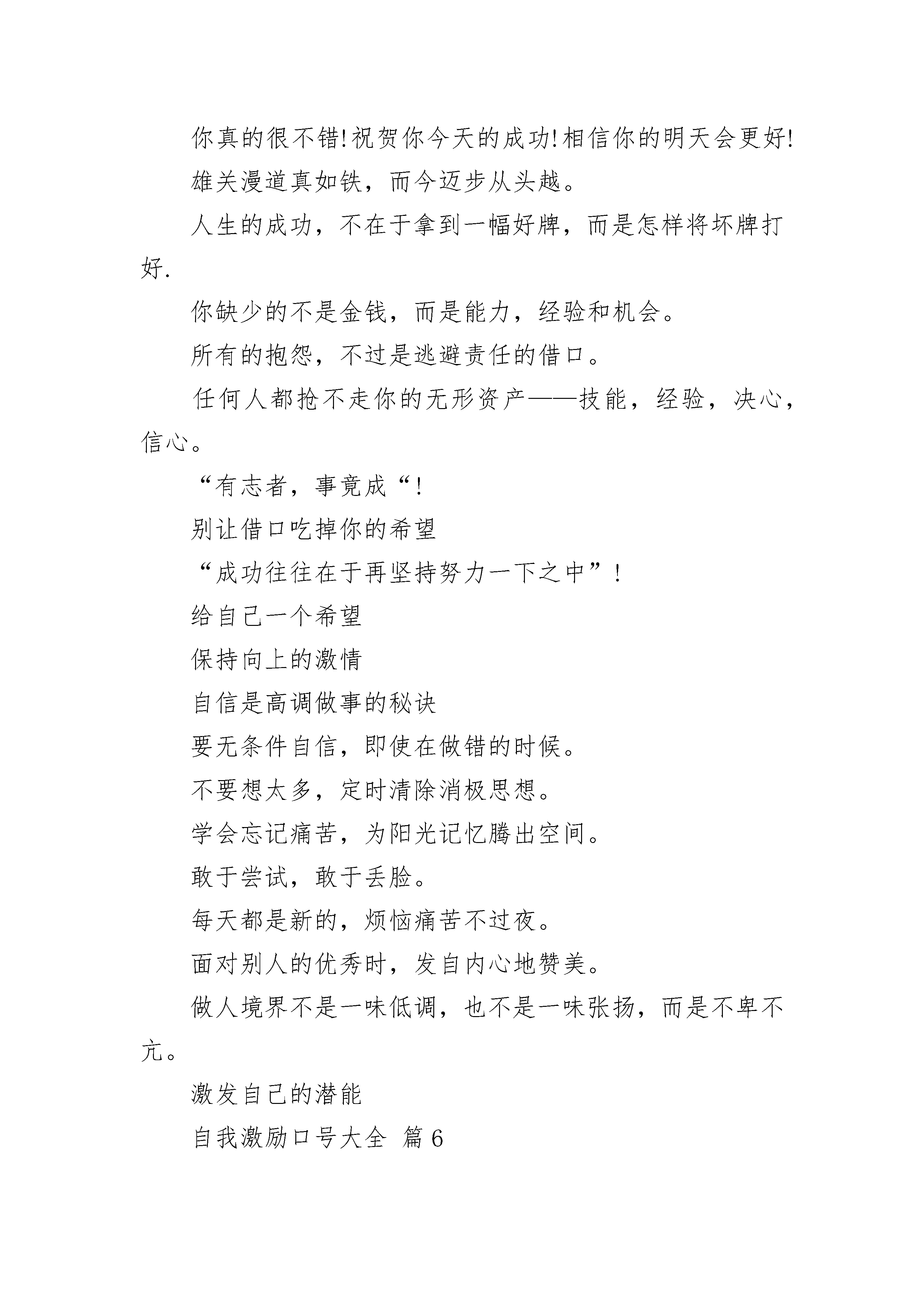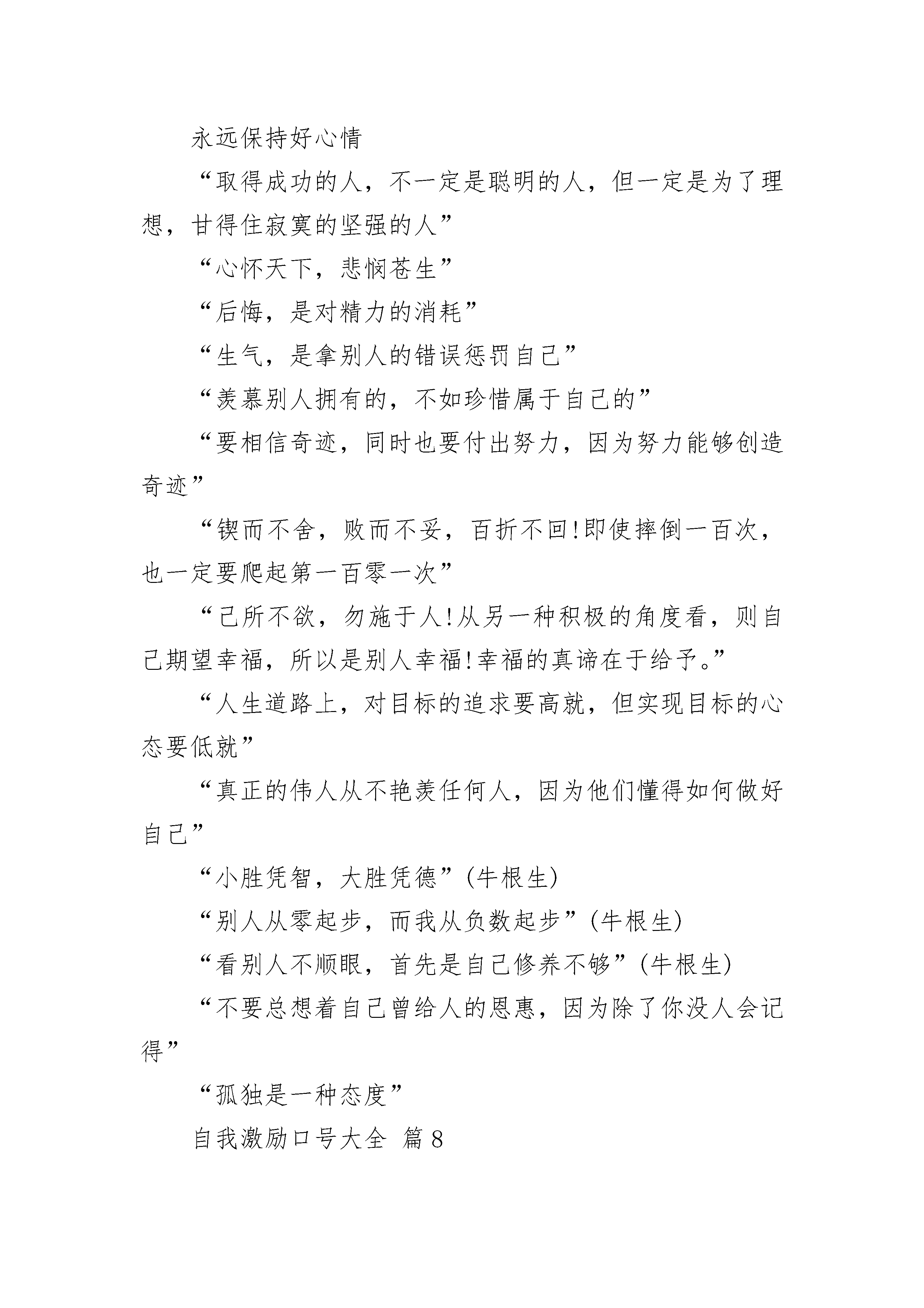 自我激励口号大全自我激励口号大全(通用8篇)自我激励口号大全篇1人人都增员,渠道窄变宽。少走弯路就是走捷径。世界会向那些有目标和远见人让路。奇迹靠人创造,机遇靠人争取。昨晚多几分钟准备,今天少几小时麻烦。没有比脚更长路,没有比人更高山。没有比人更高山,没有比脚更长路。全民健身,利国利民。我成长,我晋升,我是亲人骄傲。团队荣誉高于一切。你不努力,永远没有人对你公平。奋发拼搏勇于开拓。实施自主创新战略,建设创新型企业。组织架构落实好,增员举绩不得了。今天付出,明天收获。成功都是血汗洗染,无悔走完希望每一天