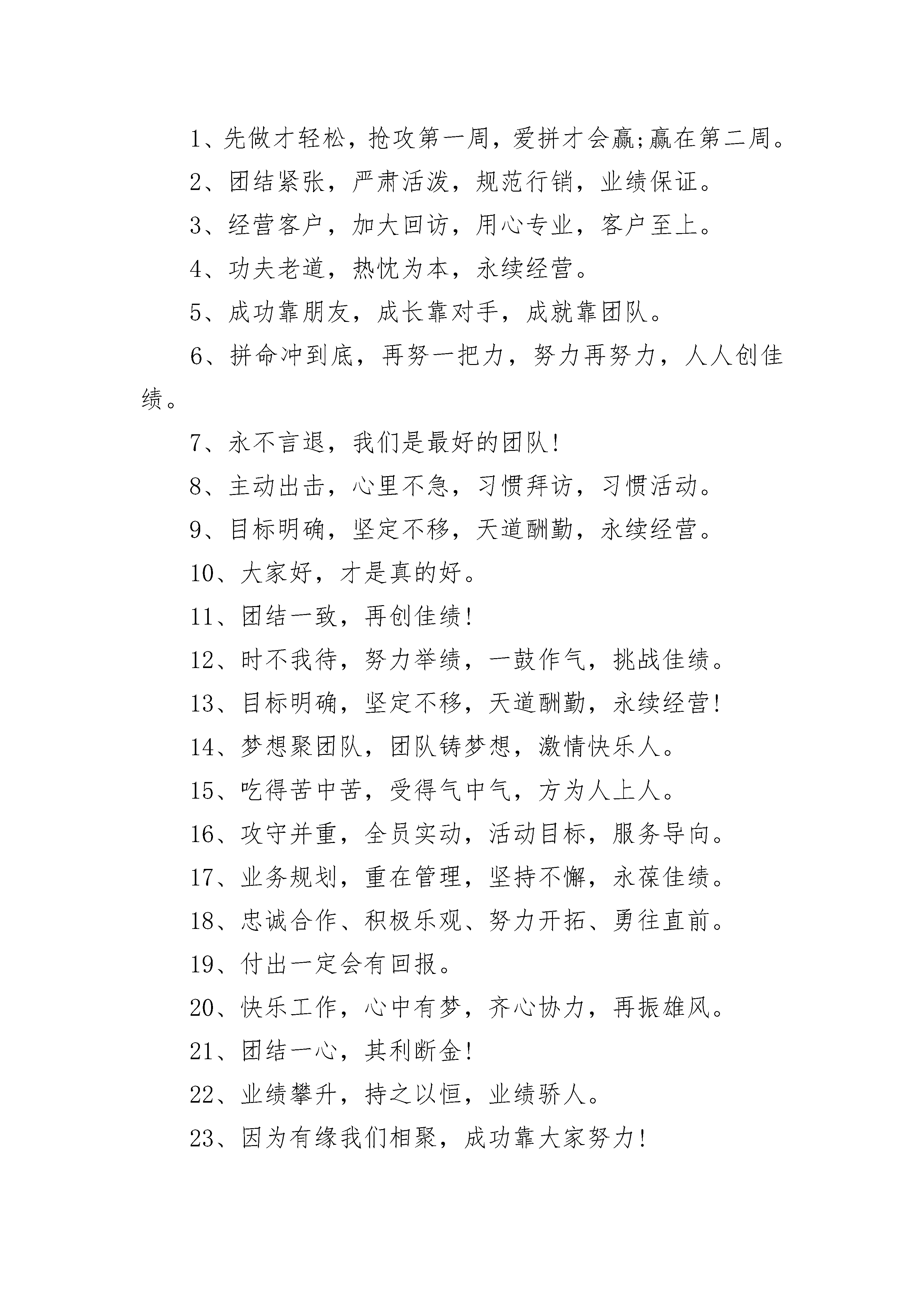 销售自我激励口号大全销售自我激励口号大全销售:是指以销售、租赁或其他任何方式向第三方提供产品或服务的行为,包括为促进该行为进行的有关辅助活动,例如广告、促销、展览、服务等活动。下面是小编为你带来的销售自我激励口号大全,欢迎阅读。1、先做才轻松,抢攻第一周,爱拼才会赢;赢在第二周。2、团结紧张,严肃活泼,规范行销,业绩保证。3、经营客户,加大回访,用心专业,客户至上。4、功夫老道,热忱为本,永续经营。5、成功靠朋友,成长靠对手,成就靠团队。6、拼命冲到底,再努一把力,努力再努力,人人创佳绩。7、永不言退