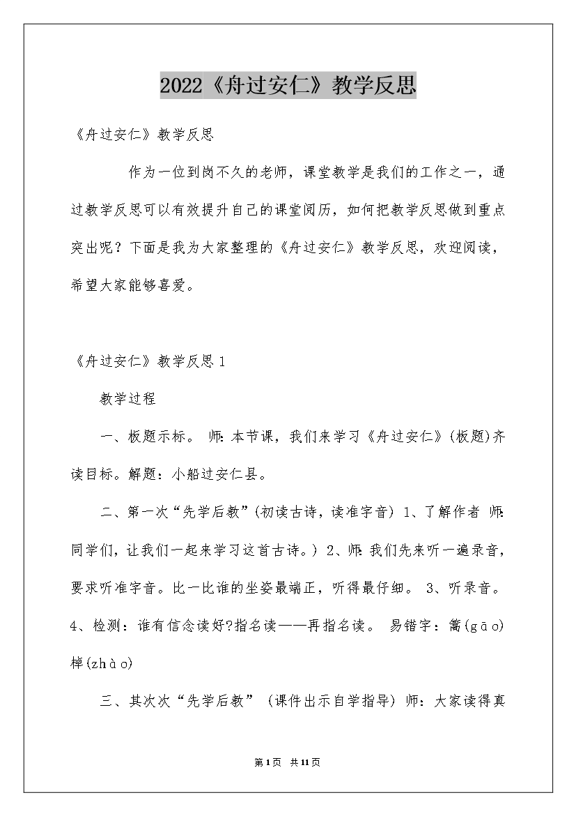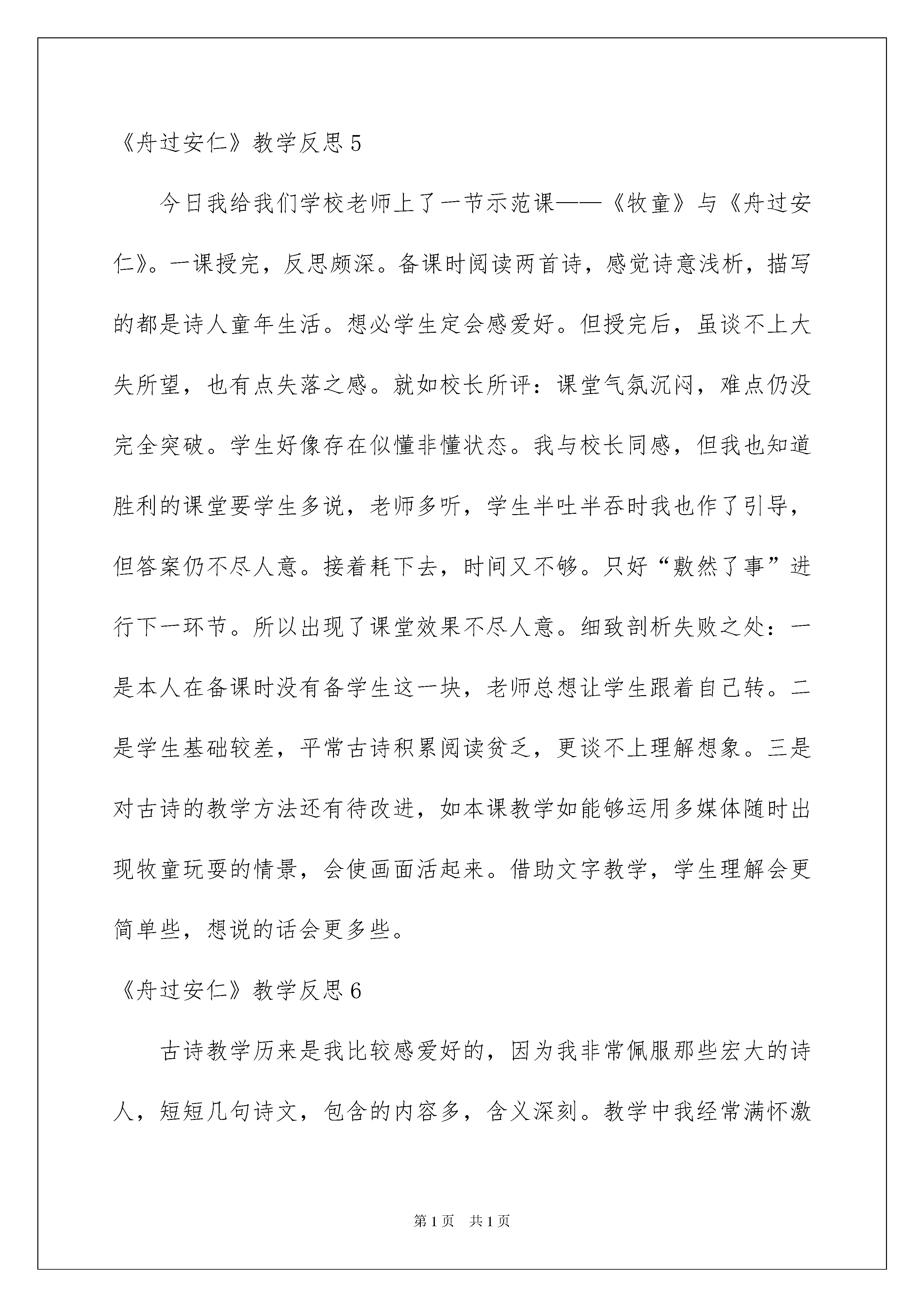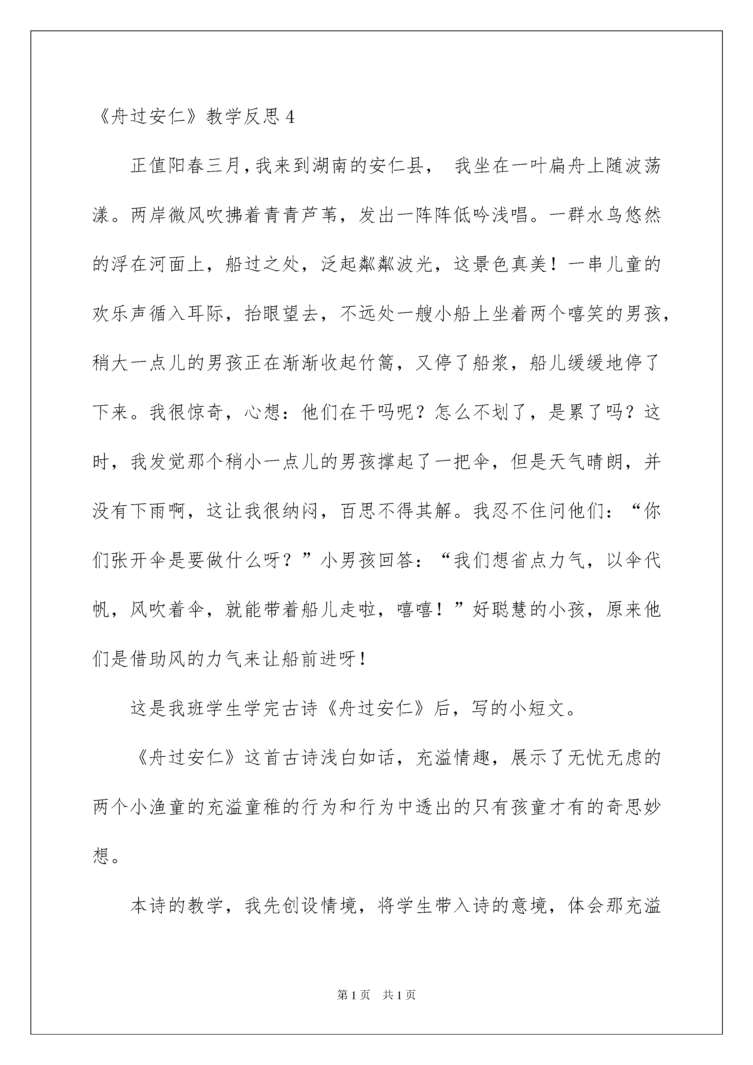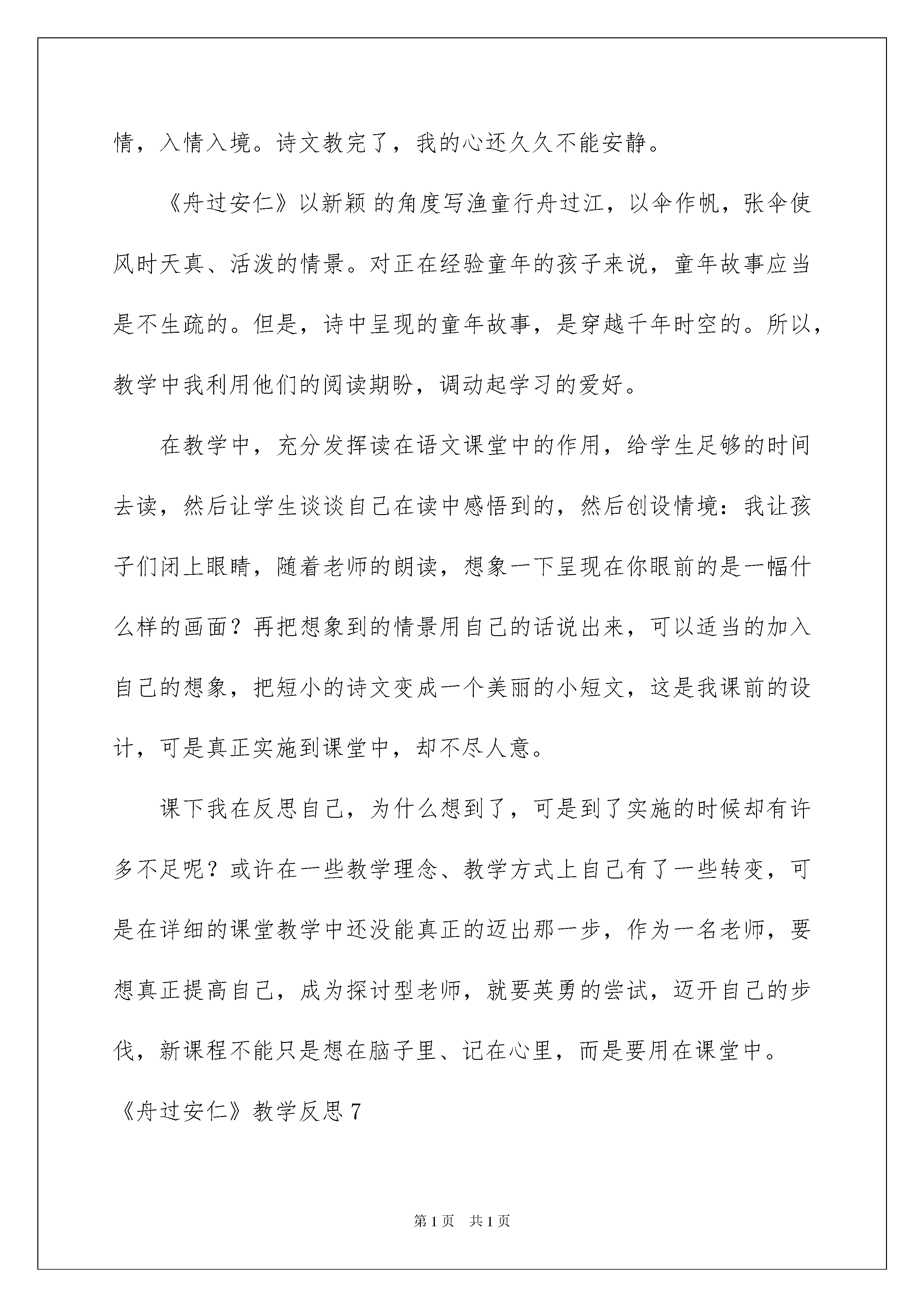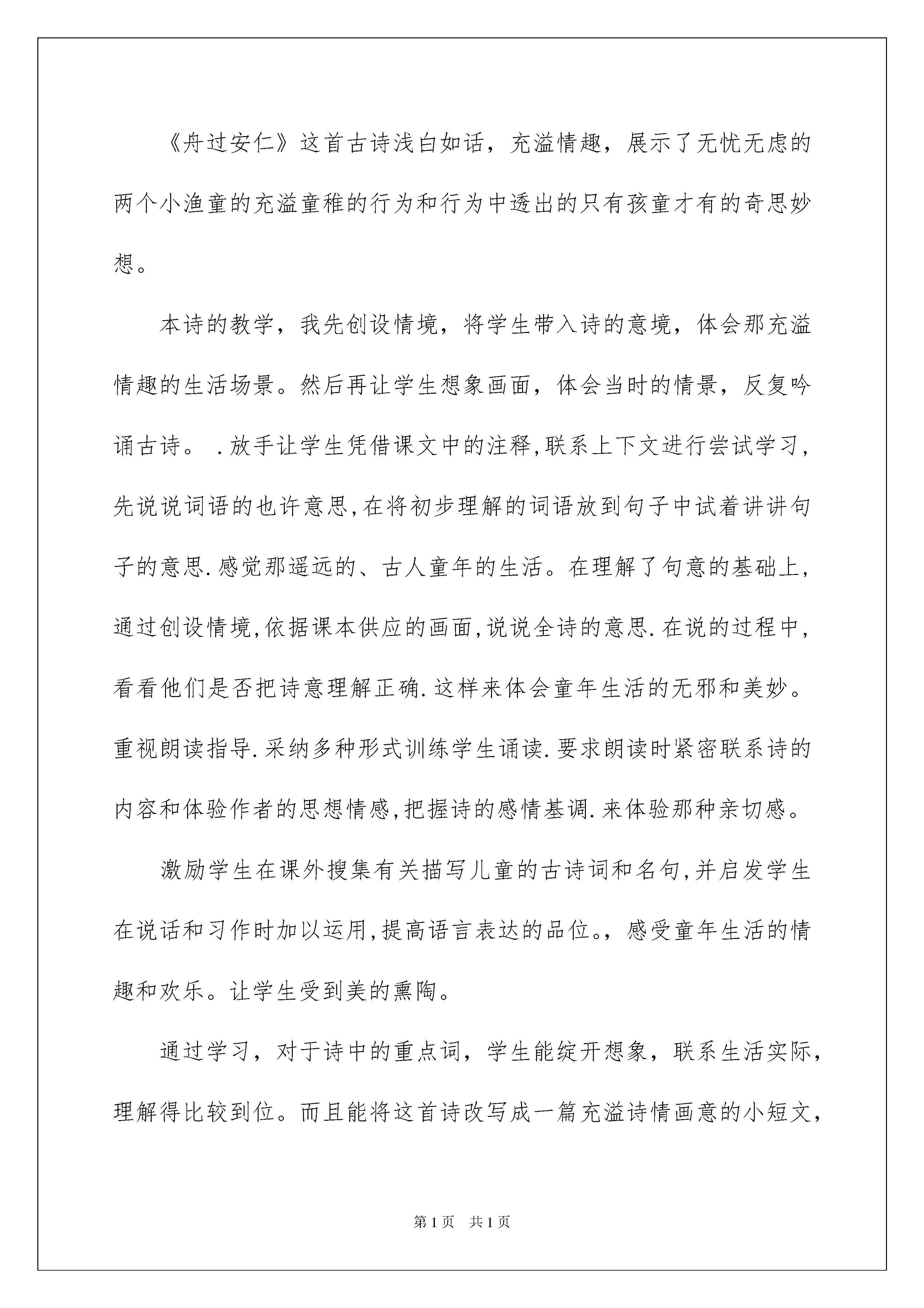 2022《舟过安仁》教学反思《舟过安仁》教学反思作为一位到岗不久的老师,课堂教学是我们的工作之一,通过教学反思可以有效提升自己的课堂阅历,如何把教学反思做到重点突出呢?下面是我为大家整理的《舟过安仁》教学反思,欢迎阅读,希望大家能够喜爱。《舟过安仁》教学反思1教学过程一、板题示标。师:本节课,我们来学习《舟过安仁》(板题)齐读目标。解题:小船过安仁