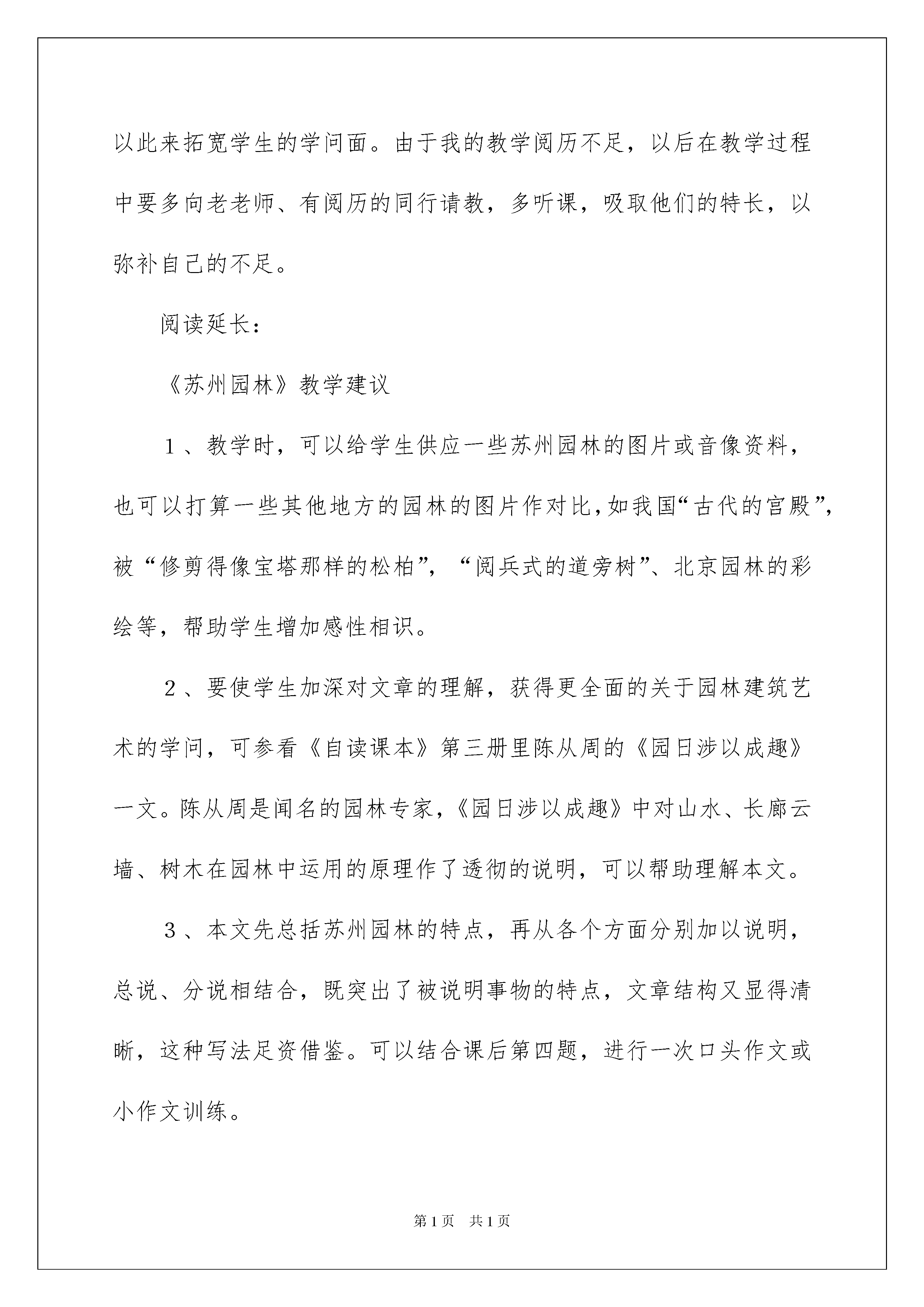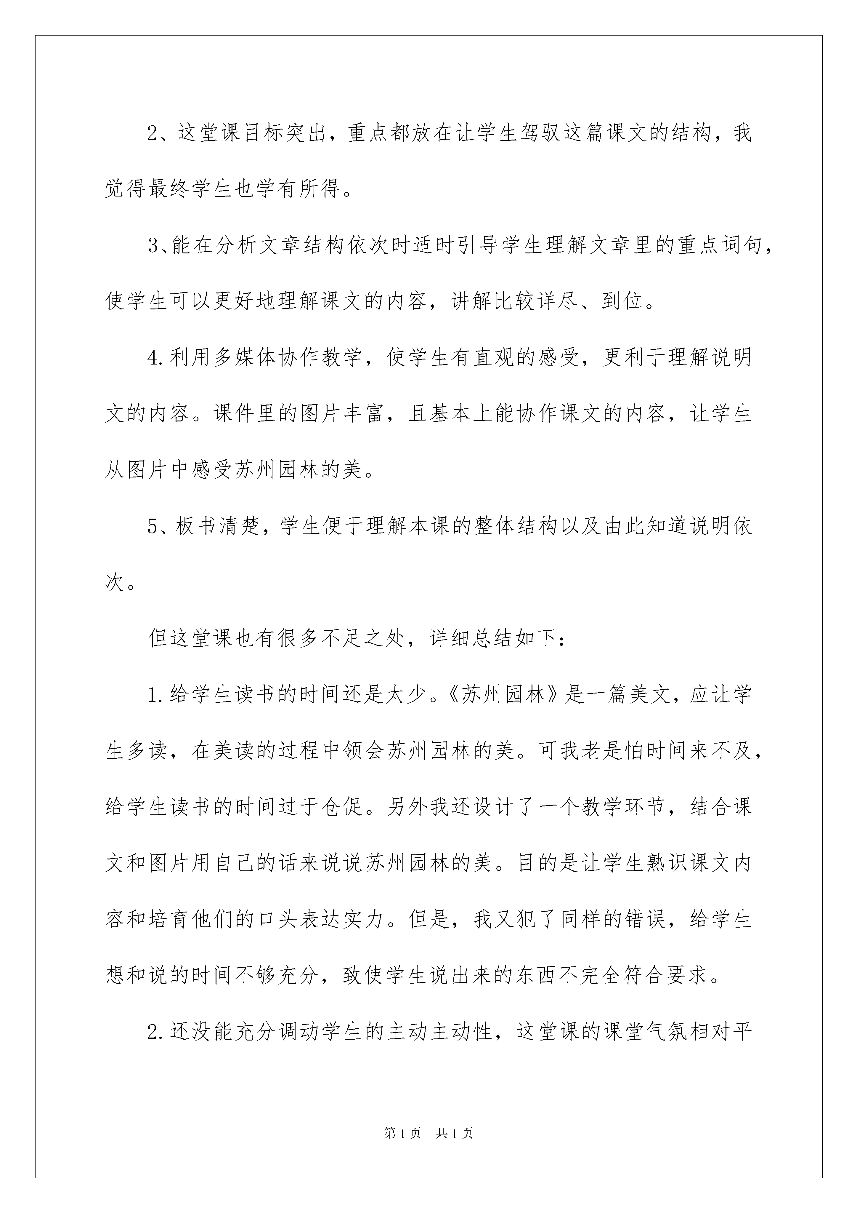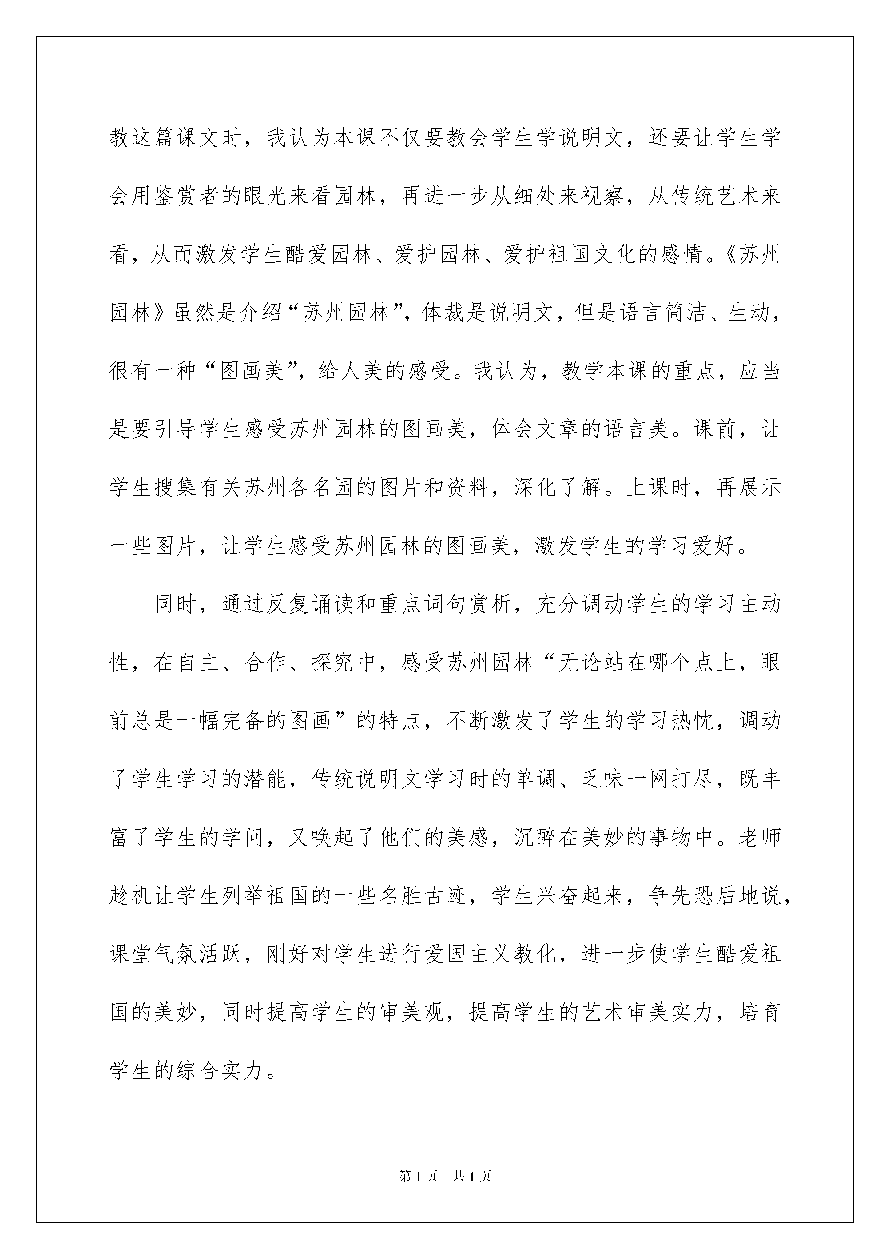 2022《苏州园林》教学反思《苏州园林》教学反思身为一位优秀的老师,课堂教学是重要的任务之一,借助教学反思我们可以快速提升自己的教学实力,那么应当如何写教学反思呢?下面是我整理的《苏州园林》教学反思,希望能够帮助到大家。《苏州园林》教学反思1这堂课的设计主要突出了几个特点:一、变更了以往对课文的设计,抓住“标本”整理文章脉络,驾驭说明对象的特征。抓住