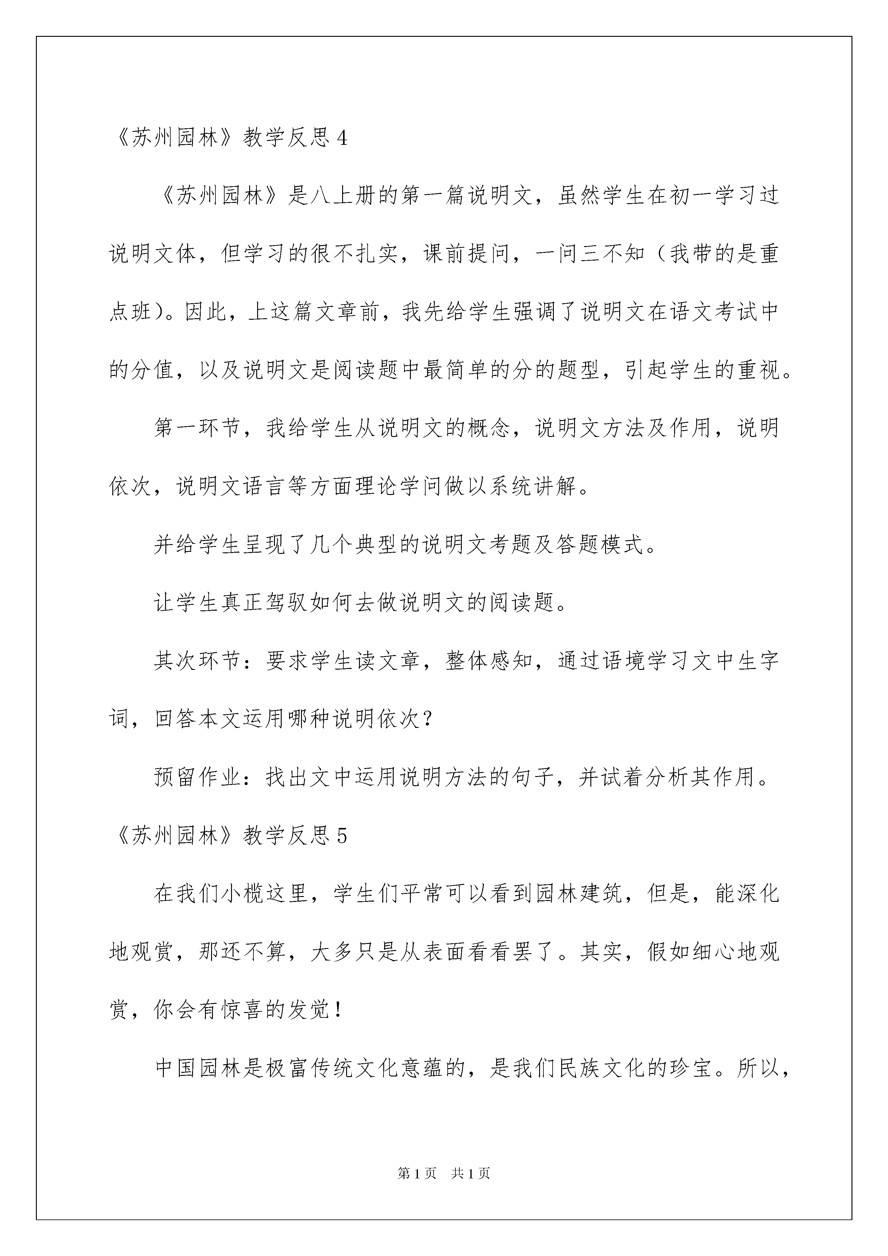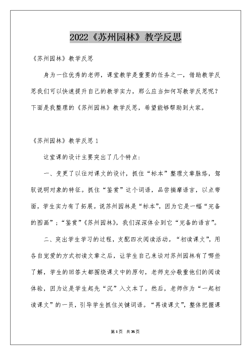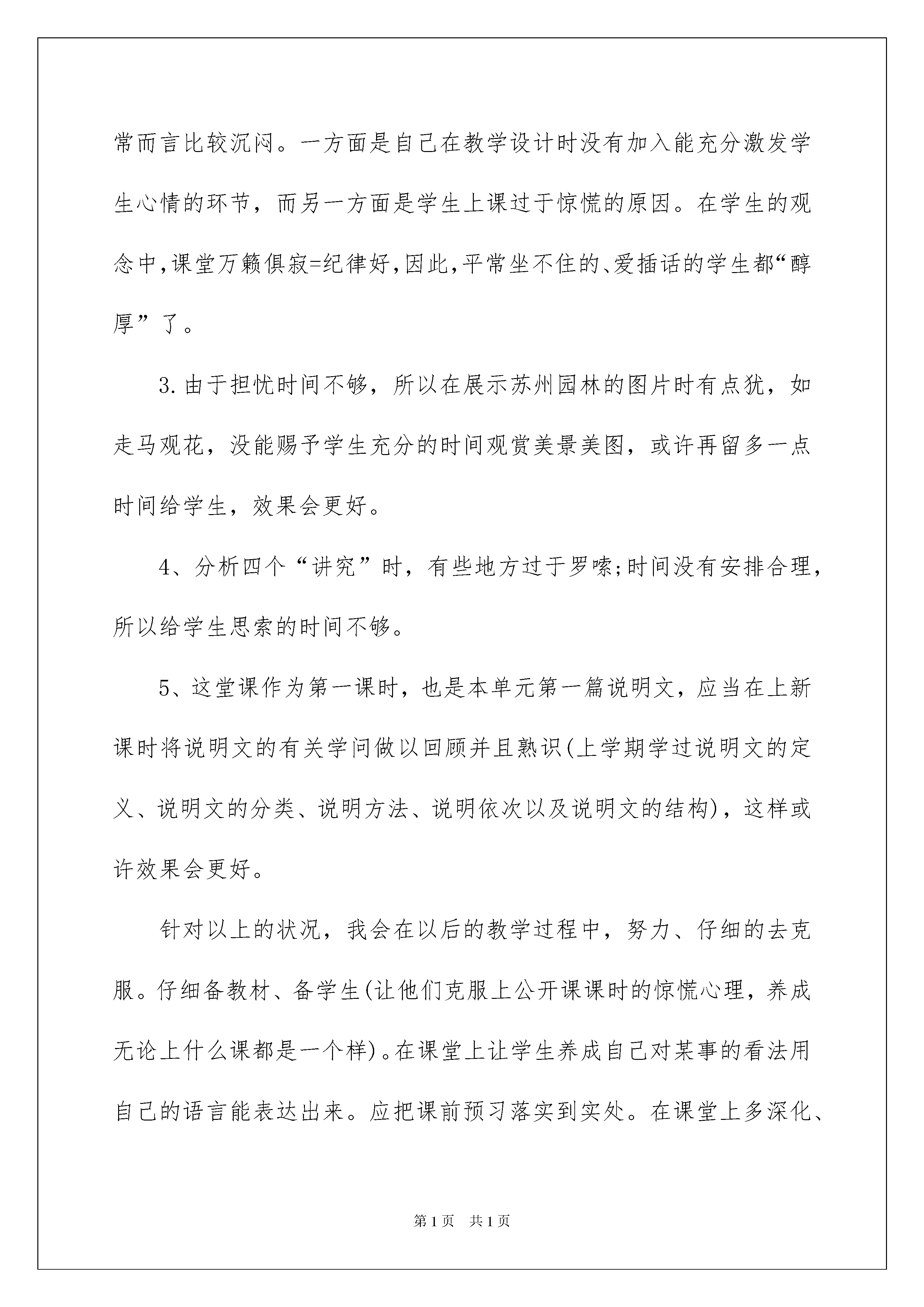 2022《苏州园林》教学反思《苏州园林》教学反思身为一位优秀的老师,课堂教学是重要的任务之一,借助教学反思我们可以快速提升自己的教学实力,那么应当如何写教学反思呢?下面是我整理的《苏州园林》教学反思,希望能够帮助到大家。《苏州园林》教学反思1这堂课的设计主要突出了几个特点:一、变更了以往对课文的设计,抓住“标本”整理文章脉络,驾驭说明对象的特征。抓住
