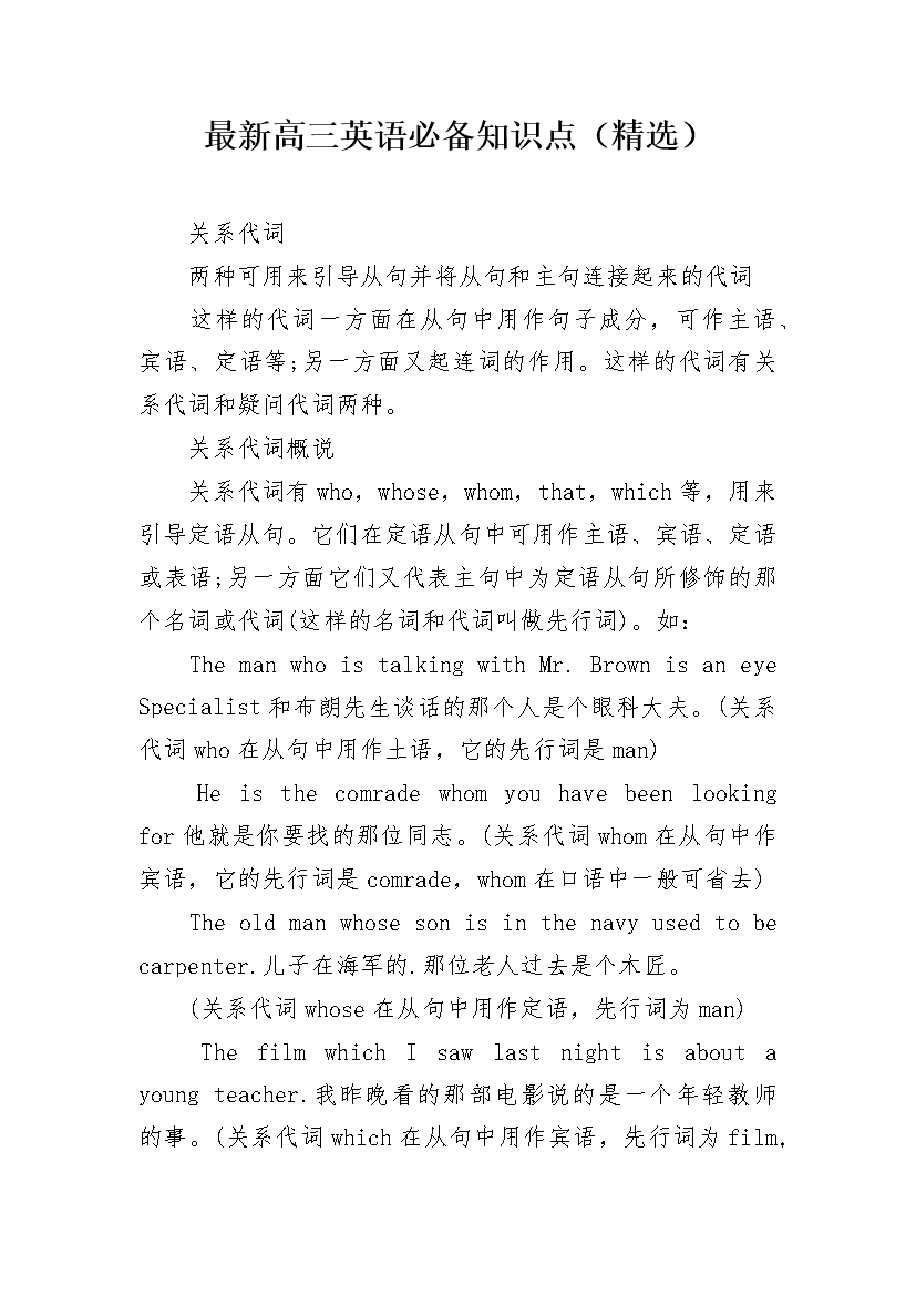 最新高三英语必备知识点(精选)关系代词两种可用来引导从句并将从句和主句连接起来的代词这样的代词一方面在从句中用作句子成分,可作主语、宾语、定语等;另一方面又起连词的作用。这样的代词有关系代词和疑问代词两种。关系代词概说关系代词有who,whose,whom,that,which等,用来引导定语从句。它们在定语从句中可用作主语、宾语、定语或表语;另一方面它们又代表主句中为定语从句所修饰的那个名词或代词(这样的名词和代词叫做先行词)。如:ThemanwhoistalkingwithMr.Brownisaney
