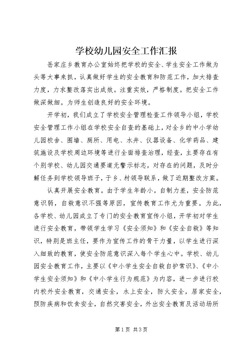 学校幼儿园安全工作汇报岳家庄乡教育办公室始终把学校的安全、学生安全工作做为头等大事来抓,认真做好学生的安全教育和防范工作,加大排查力度,力求整改落实出成效。注重实效,严格制度。把安全工作做深做细。为师生创造良好的安全环境。开学初,我们成立了学校安全管理检查工作领导小组,学校安全管理工作小组在学校安全自查的基础上,对全乡的中小学幼儿园校舍、围墙、厕所、用电、水井、仪器设备、化学药品、建筑施设及学校周边环境等进行全面排查治理,经查,主要存在有个别学校、幼儿园交通要道无警示标志,对存在的问题,及时分解任务到学校