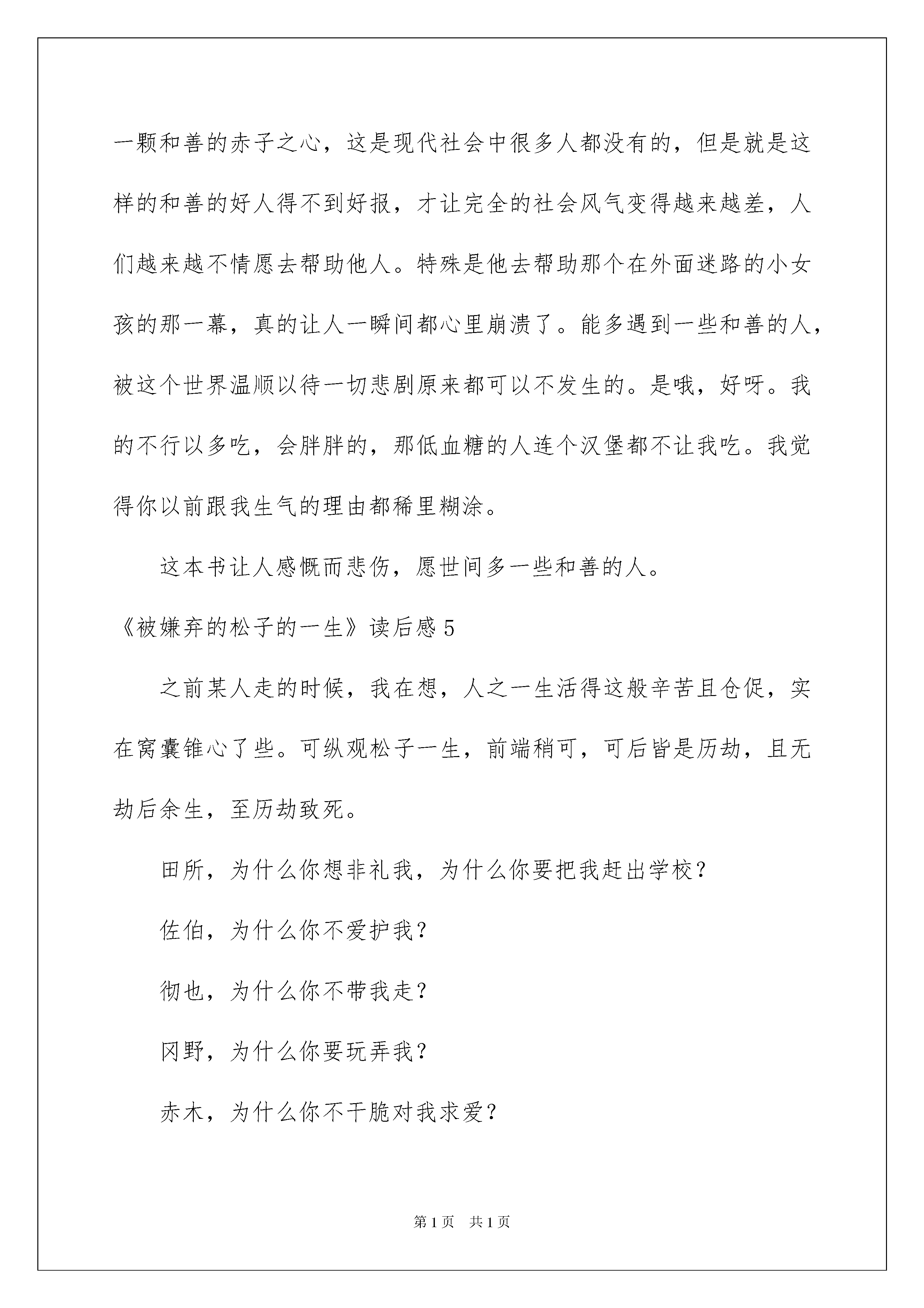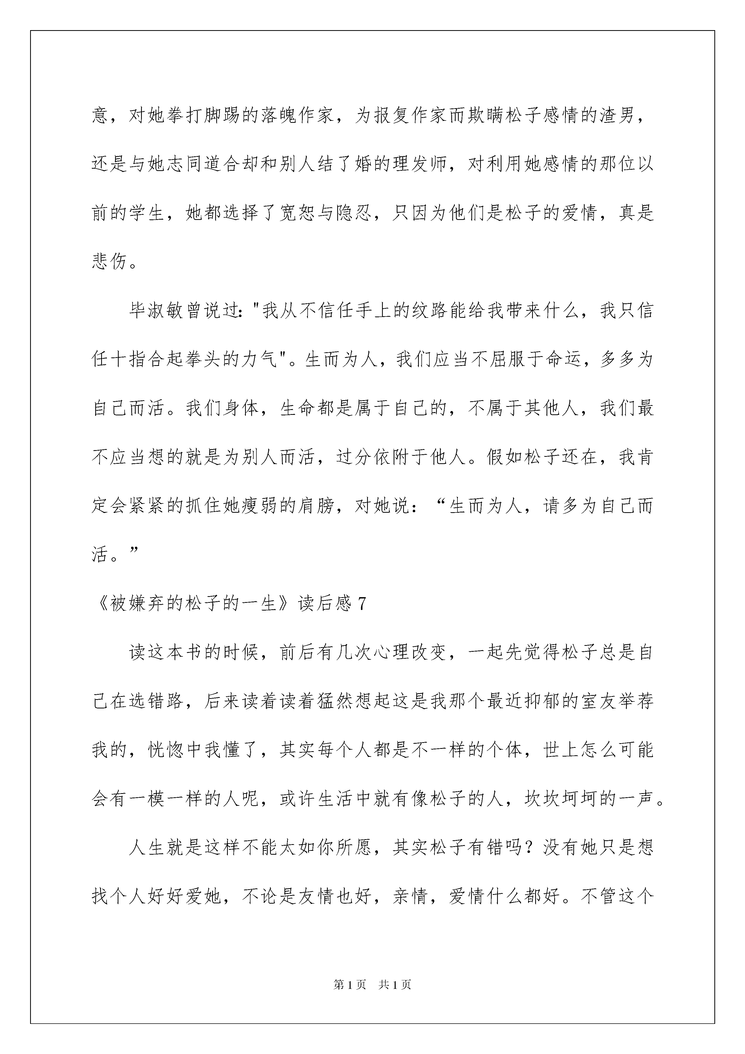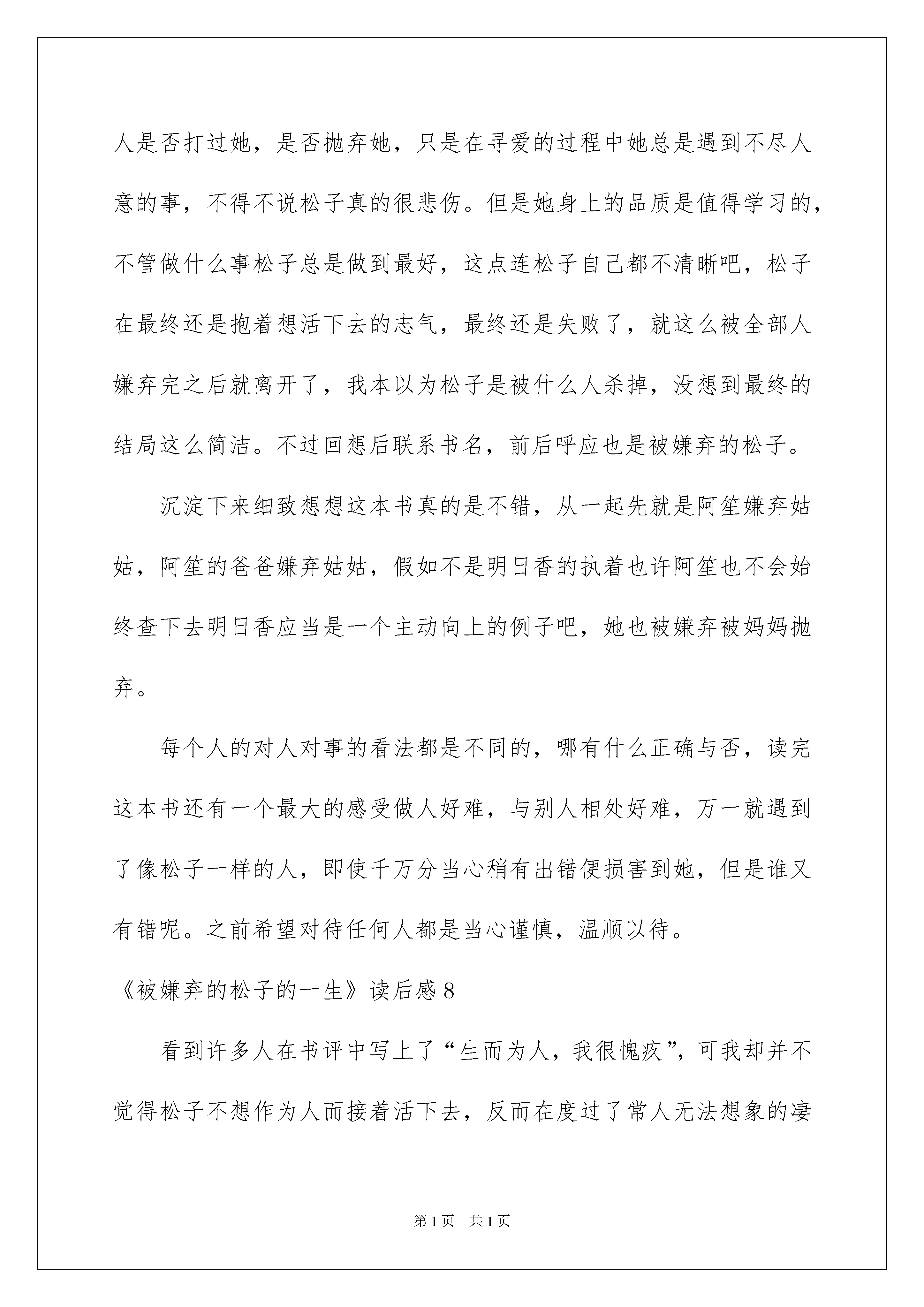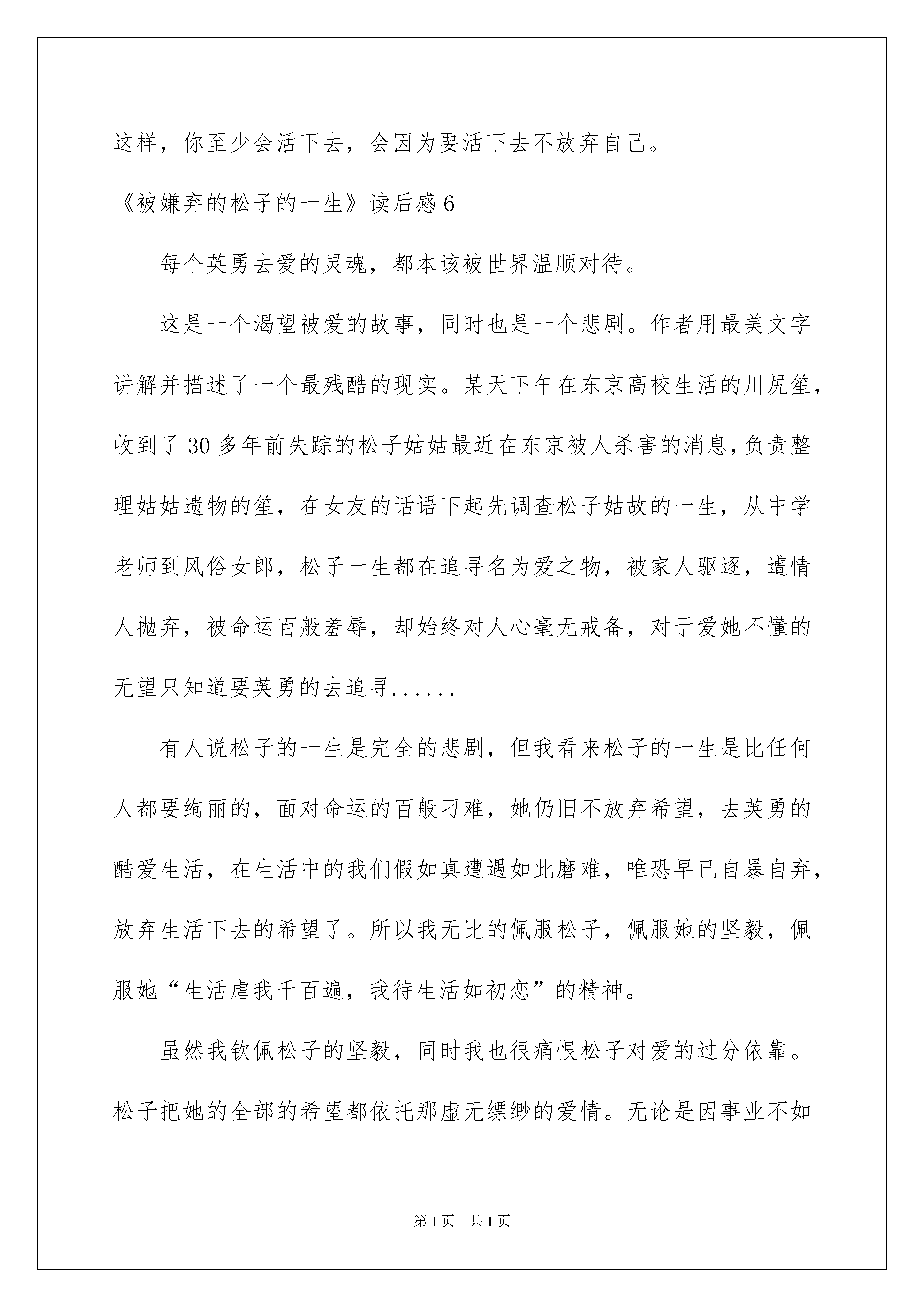 2022《被嫌弃的松子的一生》读后感《被嫌弃的松子的一生》读后感读完一本书以后,大家对人生或者事物肯定产生了很多感想,不能光会读哦,写一篇读后感吧。现在你是否对读后感一筹莫展呢?以下是我为大家整理的《被嫌弃的松子的一生》读后感,欢迎大家共享。《被嫌弃的松子的一生》读后感1以前有个同学看过这个电影,评论有一句我记得很清晰:哀其不幸,怒其不争。联系电影名