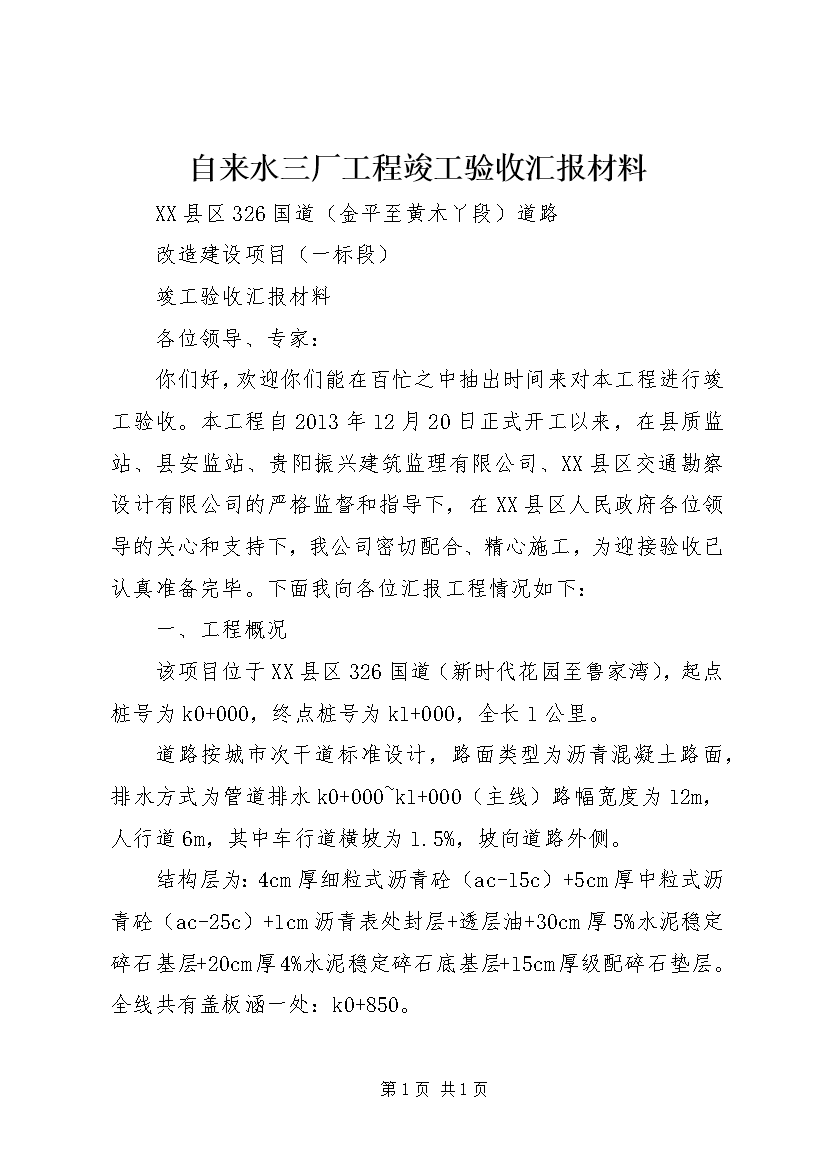 第PAGE\*Arabic\*MERGEFORMAT6页共NUMPAGES\*MERGEFORMAT6页自来水三厂工程竣工验收汇报材料XX县区326国道(金平至黄木丫段)道路改造建设项目(一标段)竣工验收汇报材料各位领导、专家:你们好,欢迎你们能在百忙之中抽出时间来对本工程进行竣工验收。本工程自2013年12月20日正式开工以来,在县质监站、县安监站、贵阳振兴建筑监理有限公司、XX县区交通勘察设计有限公司的严格监督和指导下,在XX县区人民政府各位领导的关心和支持下,我公司密切配合、精心施工,为