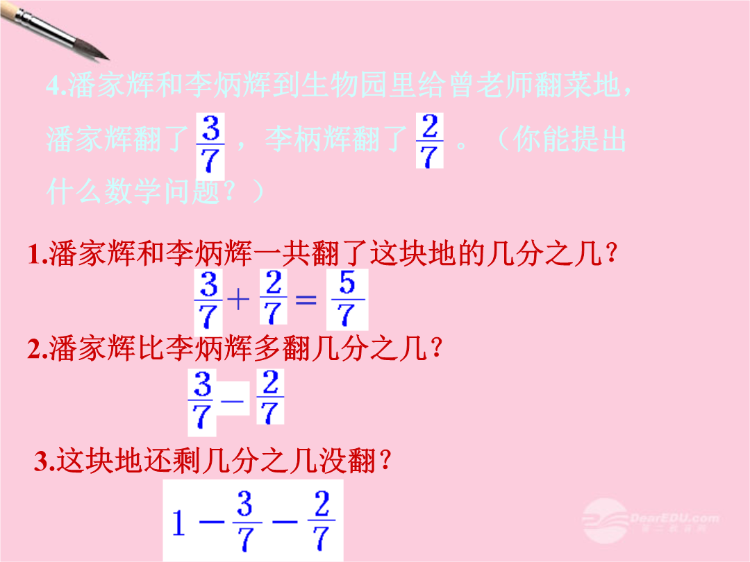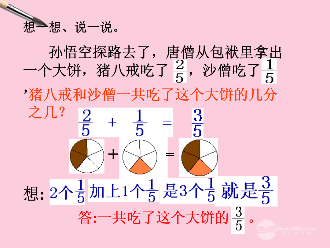 简单的分数加法教学目标一、复习,填空。是5个是()个是()个是()个3个就是4个就是9个就是5个就是分数加法一张长方形纸,做纸花用去,做小旗用去,一共用去这张纸的几分之几?分数加法想一想、说一说。孙悟空探路去了,唐僧从包袱里拿出一个大饼,猪八戒吃了,沙僧吃了,折一折、涂一涂、剪一剪、拼一拼、想一想、说一说。3.练一练、比一比,看来我是第一名。4.潘家辉和李炳辉到生物园里给曾老师翻菜地,潘家辉翻了,李柄辉翻了。(你能提出什么数学问题?)本课小结