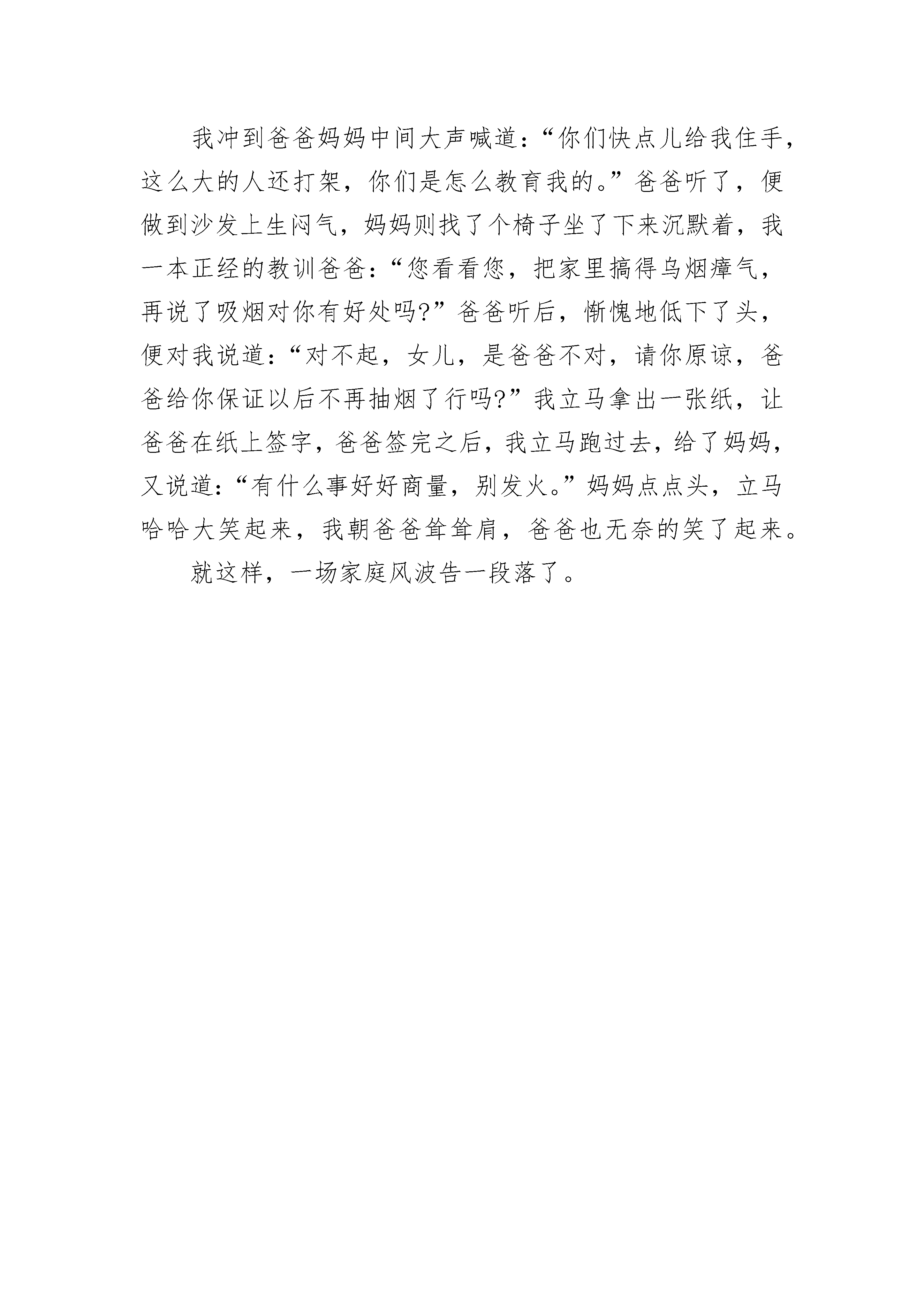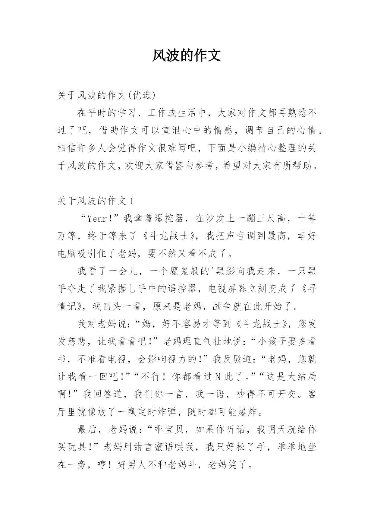 风波的作文关于风波的作文(优选)在平时的学习、工作或生活中,大家对作文都再熟悉不过了吧,借助作文可以宣泄心中的情感,调节自己的心情。相信许多人会觉得作文很难写吧,下面是小编精心整理的关于风波的作文,欢迎大家借鉴与参考,希望对大家有所帮助。关于风波的作文1“Year!”我拿着遥控器,在沙发上一蹦三尺高,十等万等,终于等来了《斗龙战士》,我把声音调到最高,幸好电脑吸引住了老妈,要不然又看不成了。我看了一会儿,一个魔鬼般的'黑影向我走来,一只黑手夺走了我紧握乚手中的遥控器,电视屏幕立刻变成了《寻情记》,我回头一