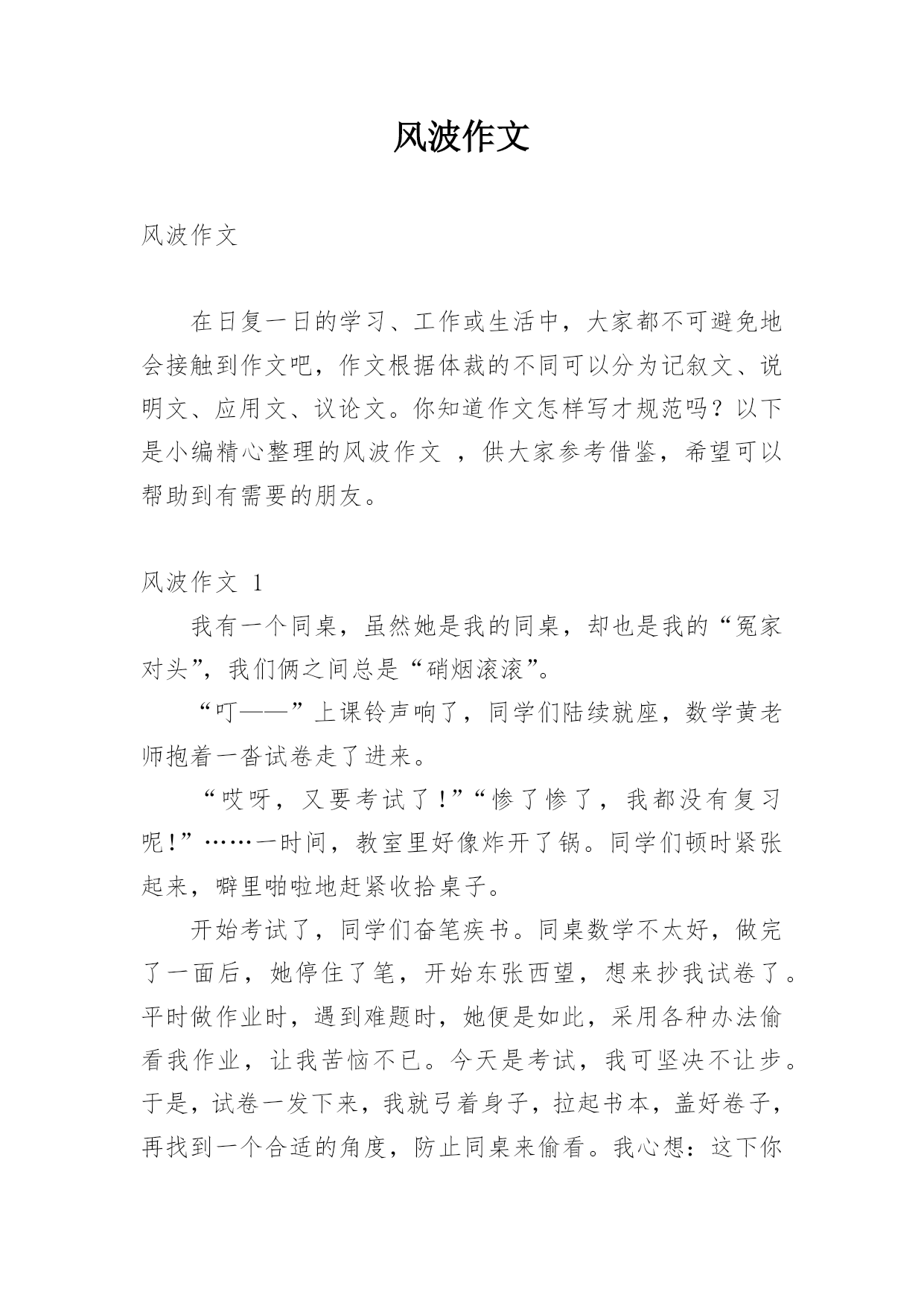 风波作文风波作文在日复一日的学习、工作或生活中,大家都不可避免地会接触到作文吧,作文根据体裁的不同可以分为记叙文、说明文、应用文、议论文。你知道作文怎样写才规范吗?以下是小编精心整理的风波作文,供大家参考借鉴,希望可以帮助到有需要的朋友。风波作文1我有一个同桌,虽然她是我的同桌,却也是我的“冤家对头”,我们俩之间总是“硝烟滚滚”。“叮——”上课铃声响了,同学们陆续就座,数学黄老师抱着一沓试卷走了进来。“哎呀,又要考试了!”“惨了惨了,我都没有复习呢!”……一时间,教室里好像炸开了锅。同学们顿时紧张起来,噼