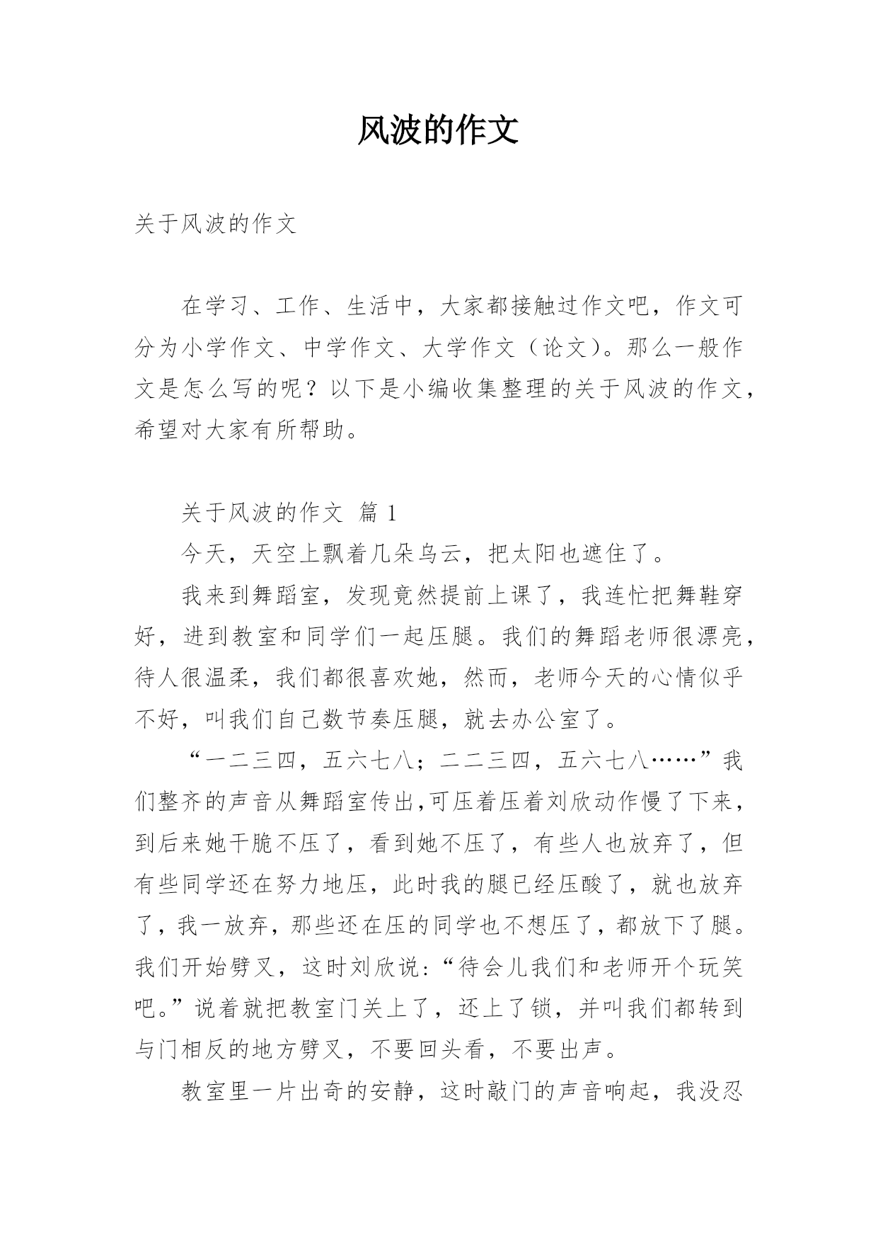 风波的作文关于风波的作文在学习、工作、生活中,大家都接触过作文吧,作文可分为小学作文、中学作文、大学作文(论文)。那么一般作文是怎么写的呢?以下是小编收集整理的关于风波的作文,希望对大家有所帮助。关于风波的作文篇1今天,天空上飘着几朵乌云,把太阳也遮住了。我来到舞蹈室,发现竟然提前上课了,我连忙把舞鞋穿好,进到教室和同学们一起压腿。我们的舞蹈老师很漂亮,待人很温柔,我们都很喜欢她,然而,老师今天的心情似乎不好,叫我们自己数节奏压腿,就去办公室了。“一二三四,五六七八;二二三四,五六七八……”我们整齐的声音
