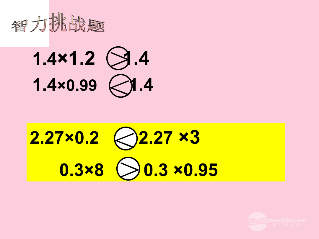 教学目标45×5=22545×5=225小数乘法的计算法则:积的四舍五入:下面每组算式左右两边的结果相等吗?本课小结