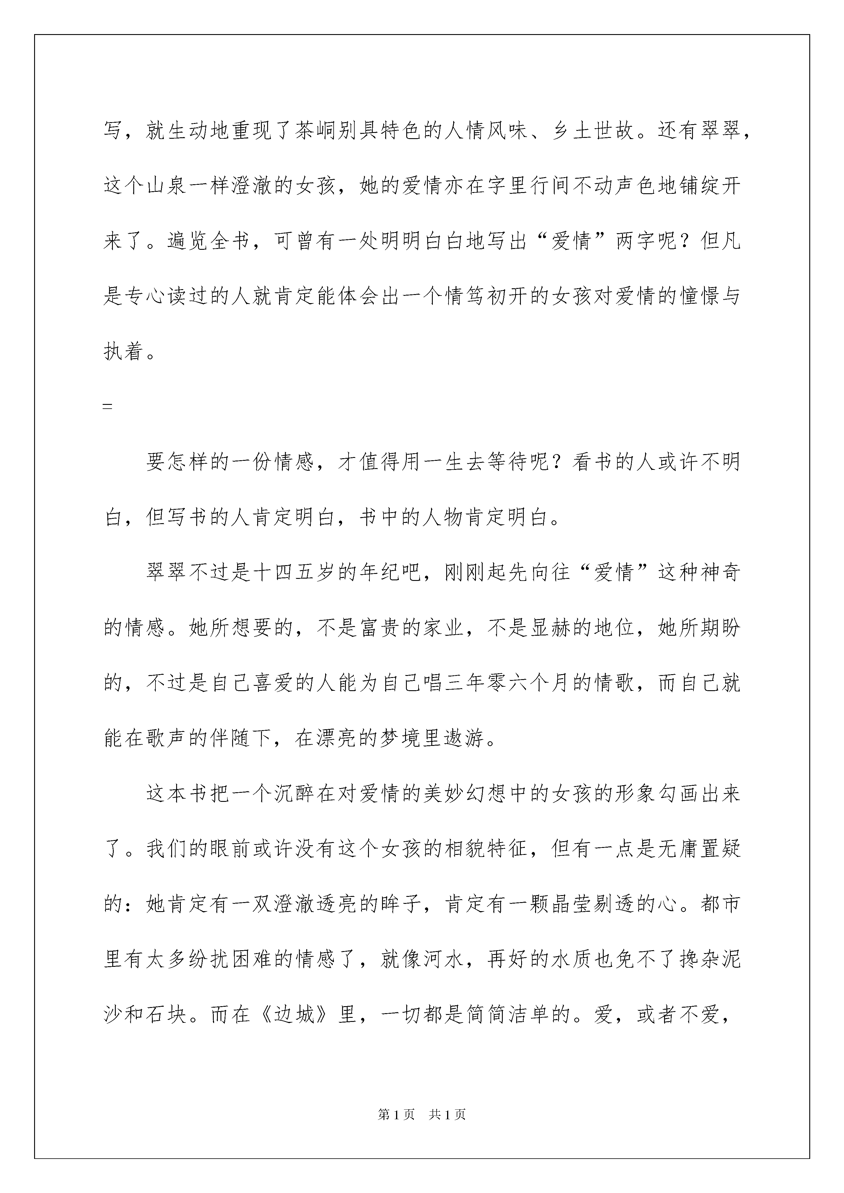 2022《边城》读后感《边城》读后感(集锦15篇)当赏读完一本名著后信任大家肯定领悟了不少东西这时最关键的读后感不能忘了哦。那么我们该怎么去写读后感呢?下面是我整理的《边城》读后感欢迎大家借鉴与参考希望对大家有所帮助。