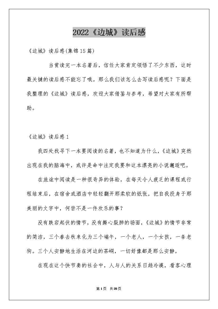 2022《边城》读后感《边城》读后感(集锦15篇)当赏读完一本名著后,信任大家肯定领悟了不少东西,这时最关键的读后感不能忘了哦。那么我们该怎么去写读后感呢?下面是我整理的《边城》读后感,欢迎大家借鉴与参考,希望对大家有所帮助。《边城》读后感1我四处找寻下一本要阅读的名著,也不知道为什么,《边城》突然出现在我的脑海中,或许是命中注定我要和这本漂亮的小说