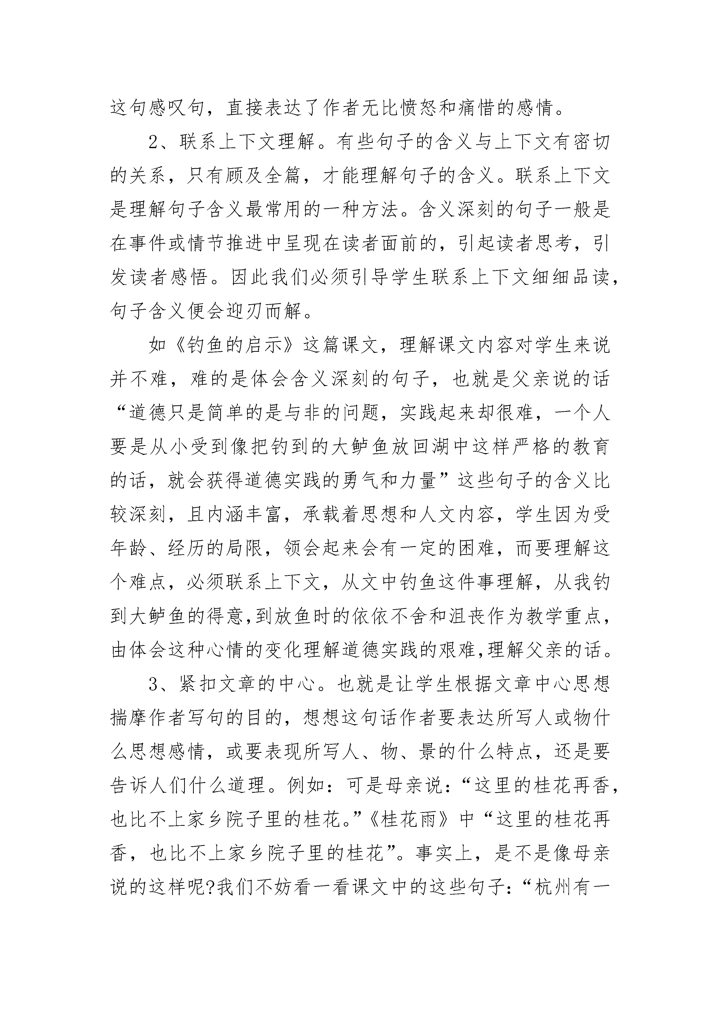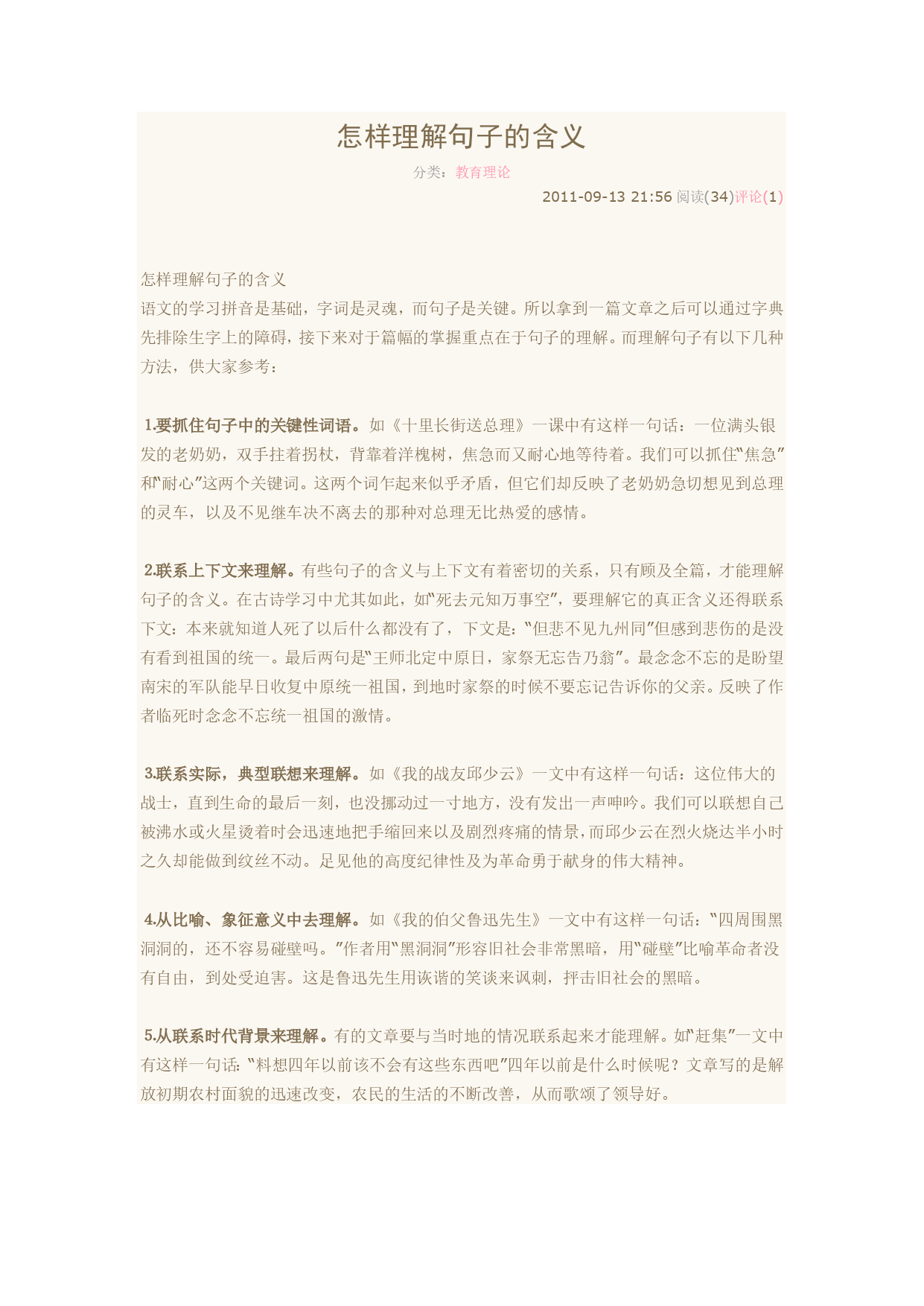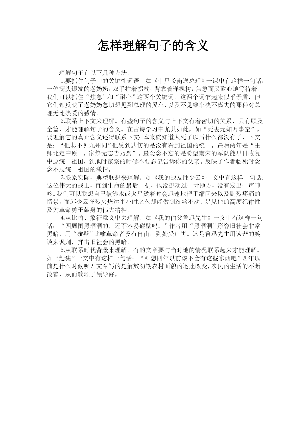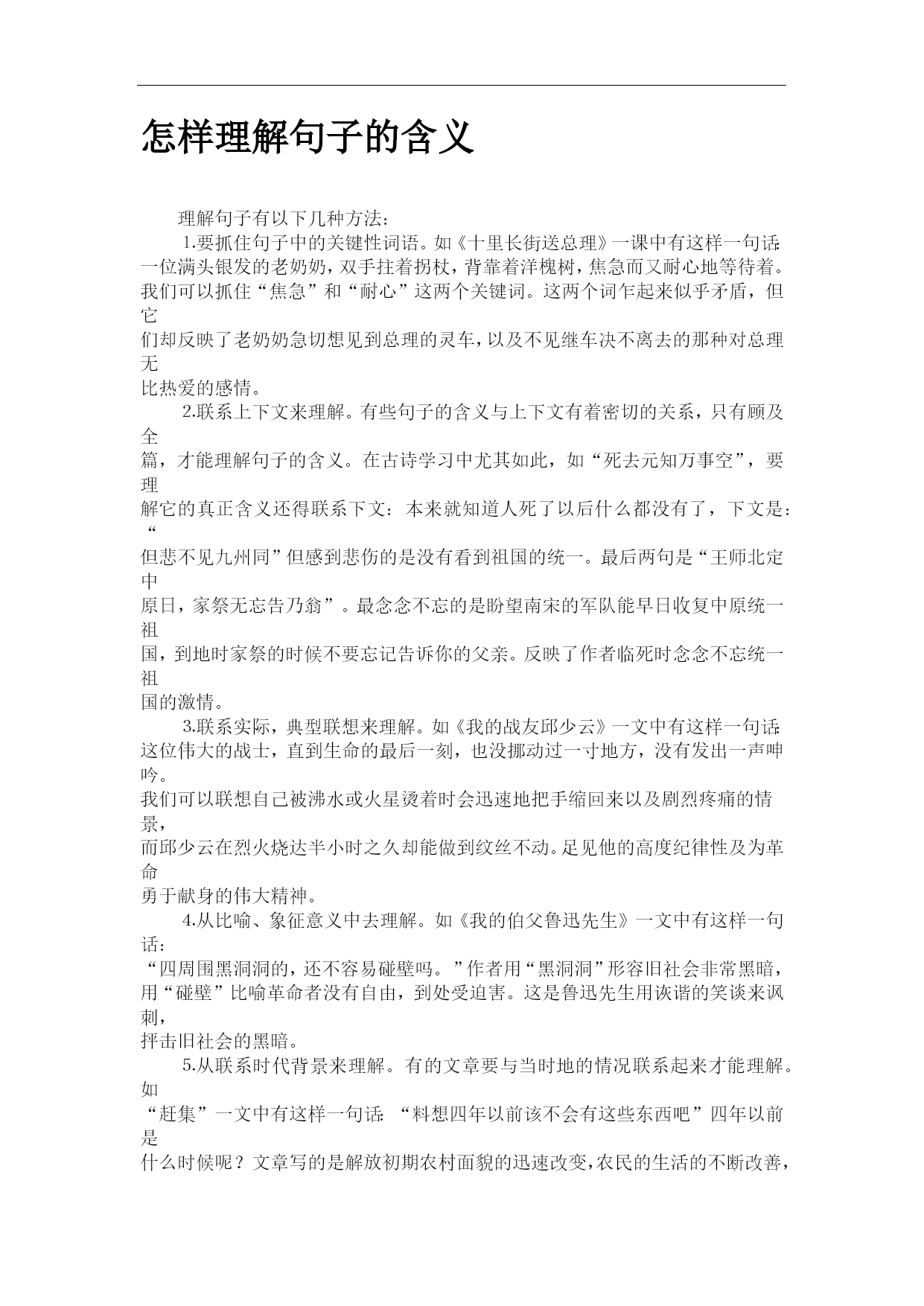 怎样理解句子的含义理解句子有以下几种方法:⒈要抓住句子中的关键性词语。如《十里长街送总理》一课中有这样一句话:一位满头银发的老奶奶,双手拄着拐杖,背靠着洋槐树,焦急而又耐心地等待着。我们可以抓住“焦急”和“耐心”这两个关键词。这两个词乍起来似乎矛盾,但它们却反映了老奶奶急切想见到总理的灵车,以及不见继车决不离去的那种对总理无比热爱的感情。⒉联系上下文来理解。有些句子的含义与上下文有着密切的关系,只有顾及全篇,才能理解句子的含义。在古诗学习中尤其如此,如“死去元知万事空”,要理解它的真正含义还得联系下文:本