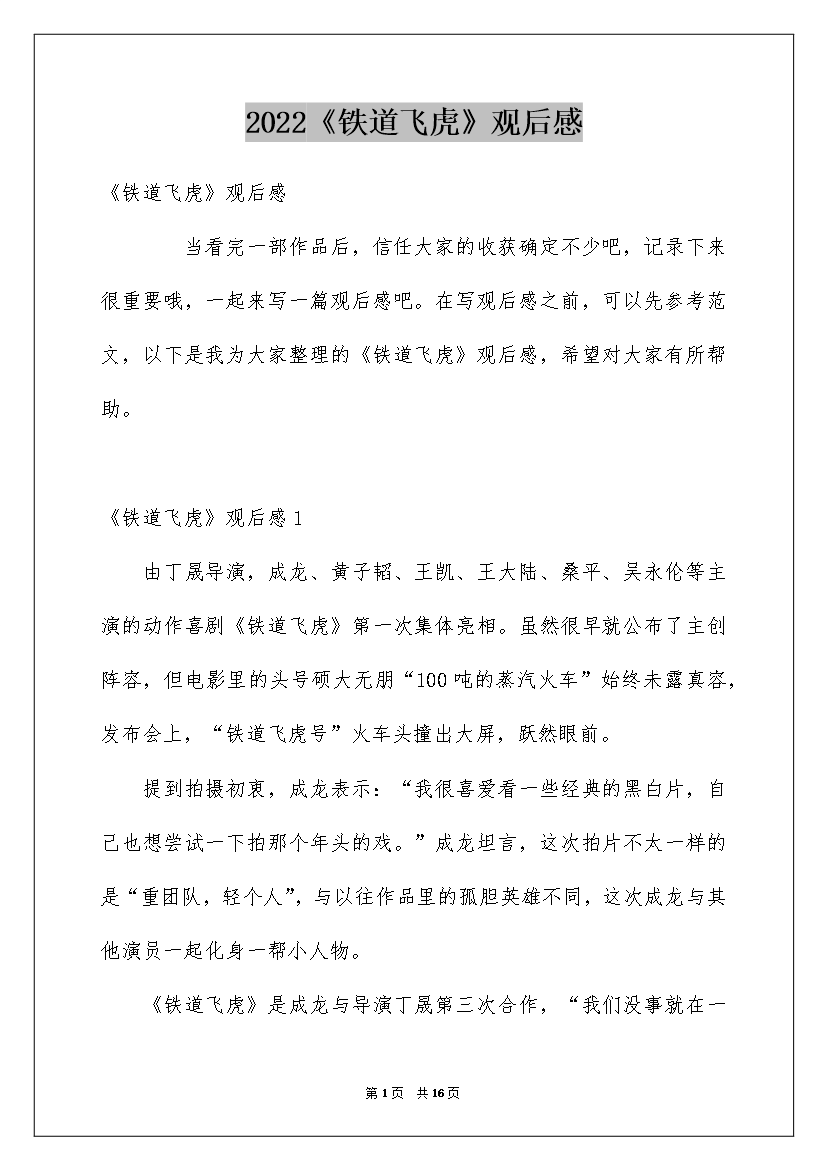 2022《铁道飞虎》观后感《铁道飞虎》观后感当看完一部作品后,信任大家的收获确定不少吧,记录下来很重要哦,一起来写一篇观后感吧。在写观后感之前,可以先参考范文,以下是我为大家整理的《铁道飞虎》观后感,希望对大家有所帮助。《铁道飞虎》观后感1由丁晟导演,成龙、黄子韬、王凯、王大陆、桑平、吴永伦等主演的动作喜剧《铁道飞虎》第一次集体亮相。虽然很早就公布