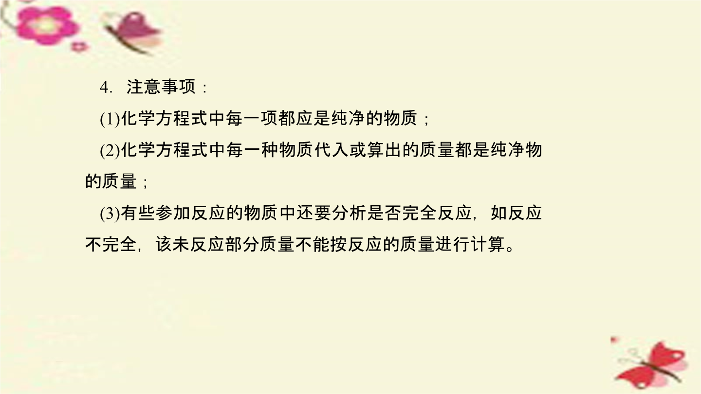 第28讲专题六常见的化学计算题三、根据化学方程式进行纯净物之间的计算1.知道反应物(生成物)的质量求生成物(反应物)的质量。2.根据质量守恒定律应用化学方程式的计算。3.注意事项:(1)根据化学方程式计算要注意解题格式化,准确列出有关反应物或生成物质量比,特别是相对分子质量的计算;(2)设未知量不带单位,求出的未知量应带单位;(3)计算中已知量每步都要带单位。4.注意事项:(1)化学方程式中每一项都应是纯净的物质;(2)化学方程式中每一种物质代入或算出的质量都是纯净物的质量;(3)有些参