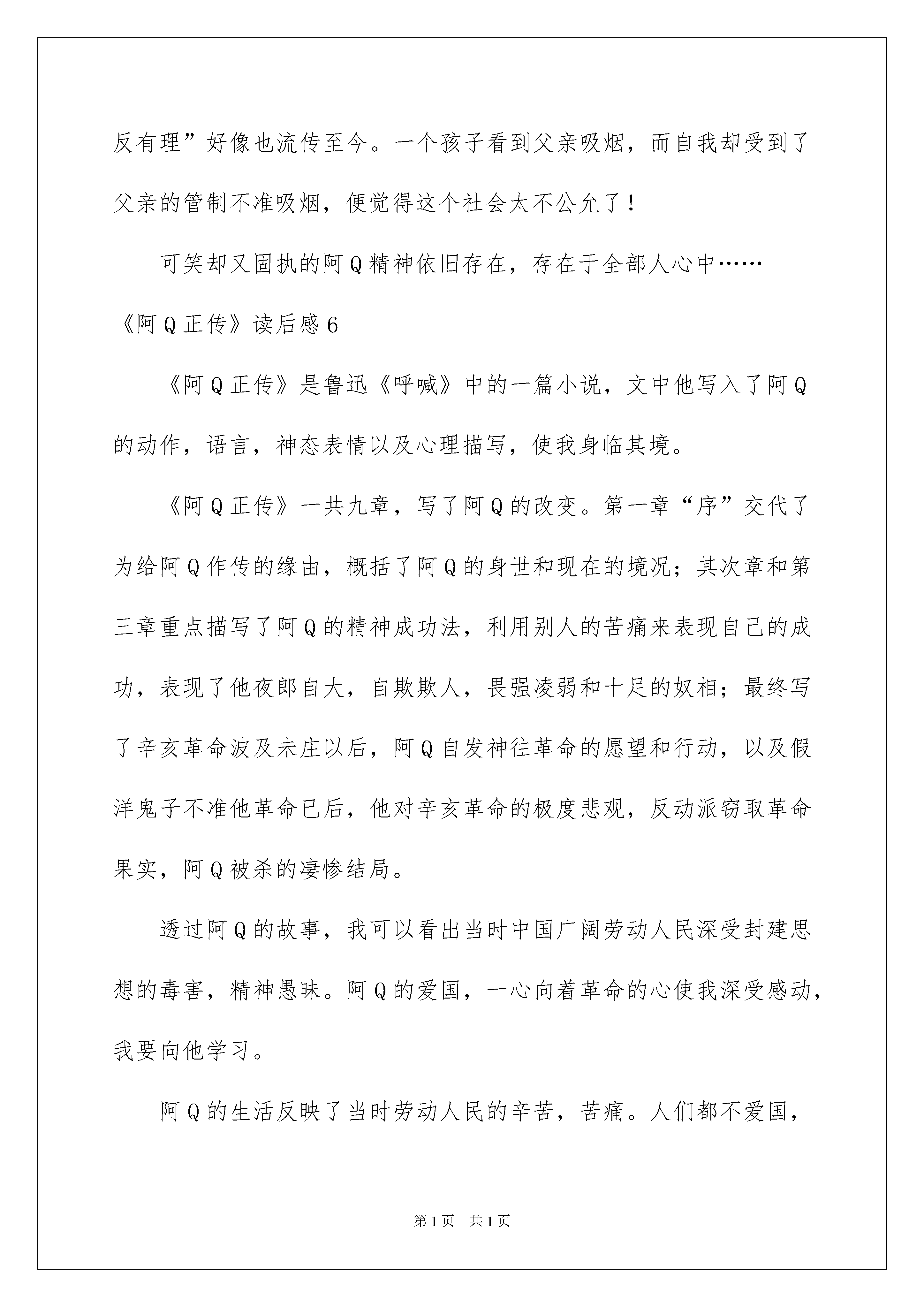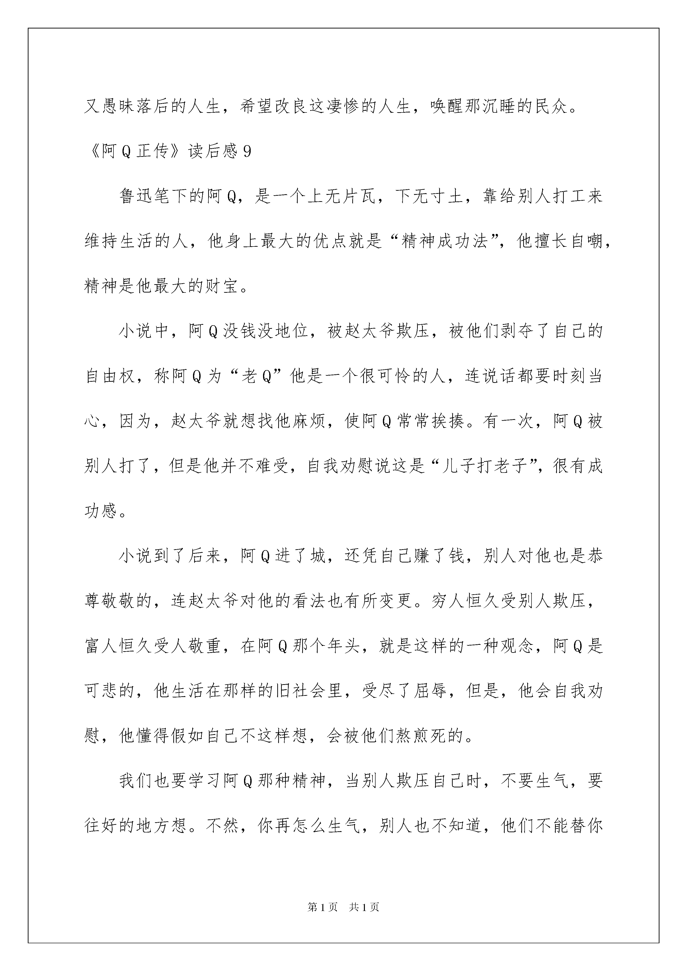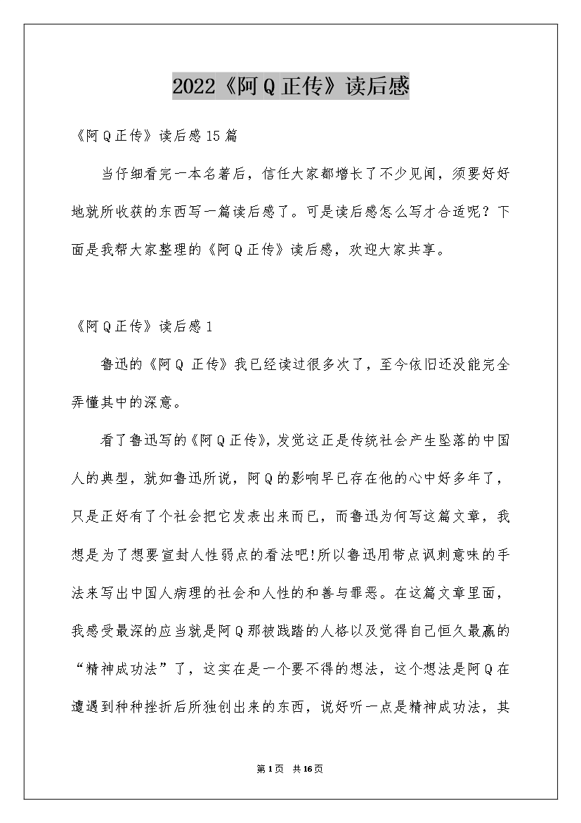 2022《阿Q正传》读后感《阿Q正传》读后感15篇当仔细看完一本名著后信任大家都增长了不少见闻须要好好地就所收获的东西写一篇读后感了。可是读后感怎么写才合适呢?下面是我帮大家整理的《阿Q正传》读后感欢迎大家共享。《阿Q正传》读