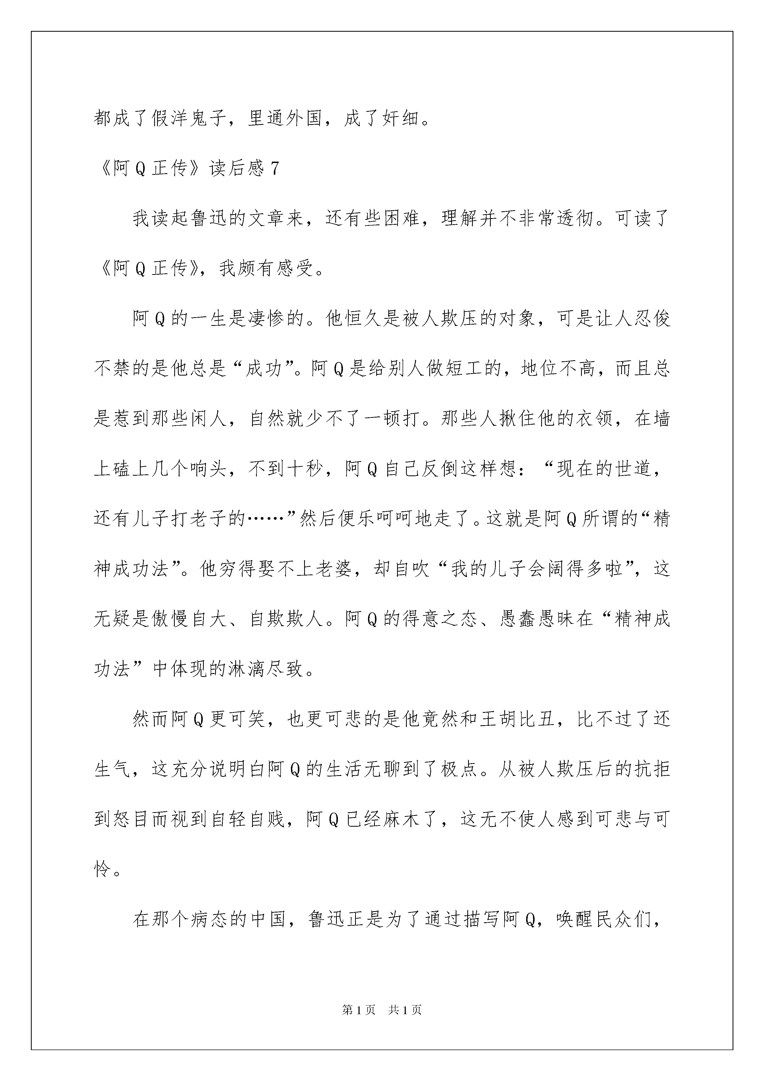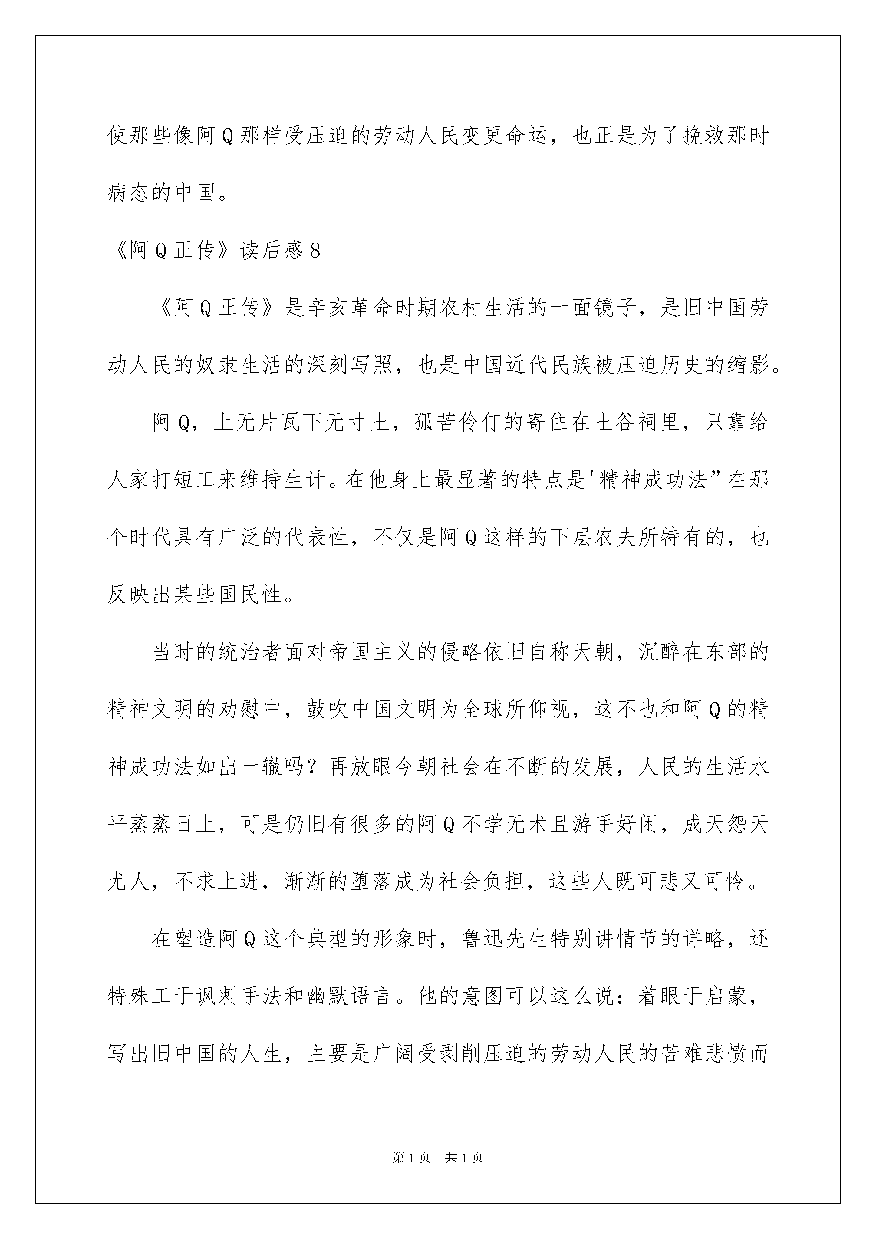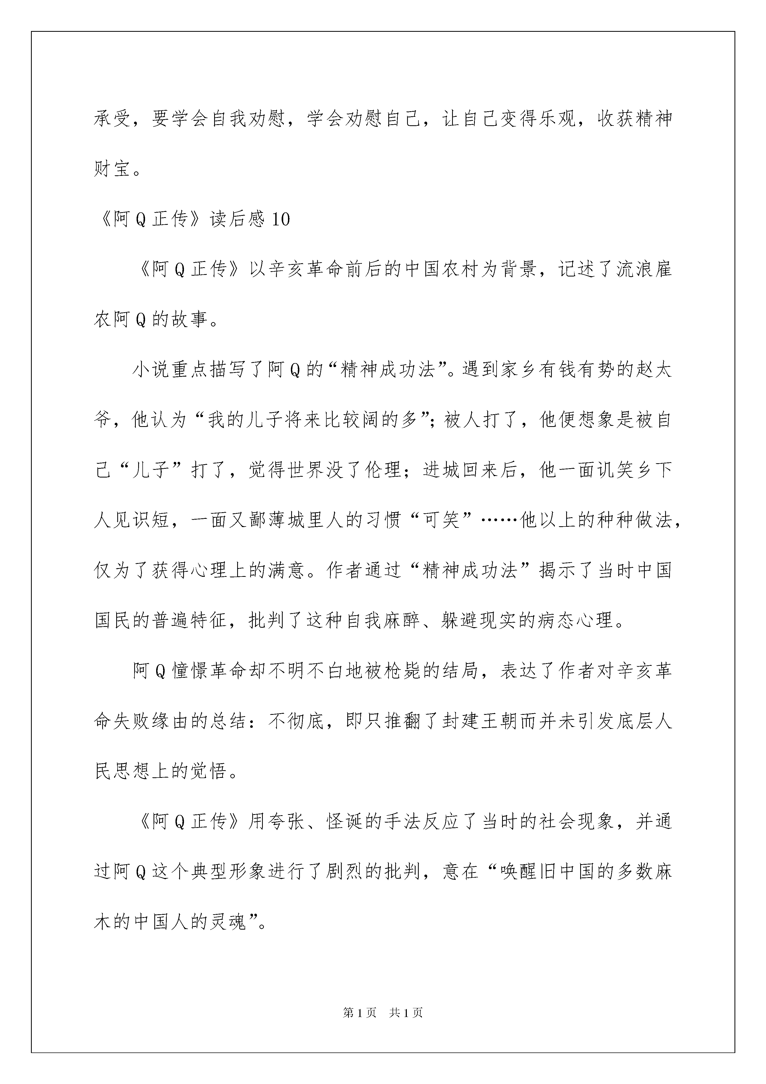 2022《阿Q正传》读后感《阿Q正传》读后感15篇当仔细看完一本名著后信任大家都增长了不少见闻须要好好地就所收获的东西写一篇读后感了。可是读后感怎么写才合适呢?下面是我帮大家整理的《阿Q正传》读后感欢迎大家共享。《阿Q正传》读