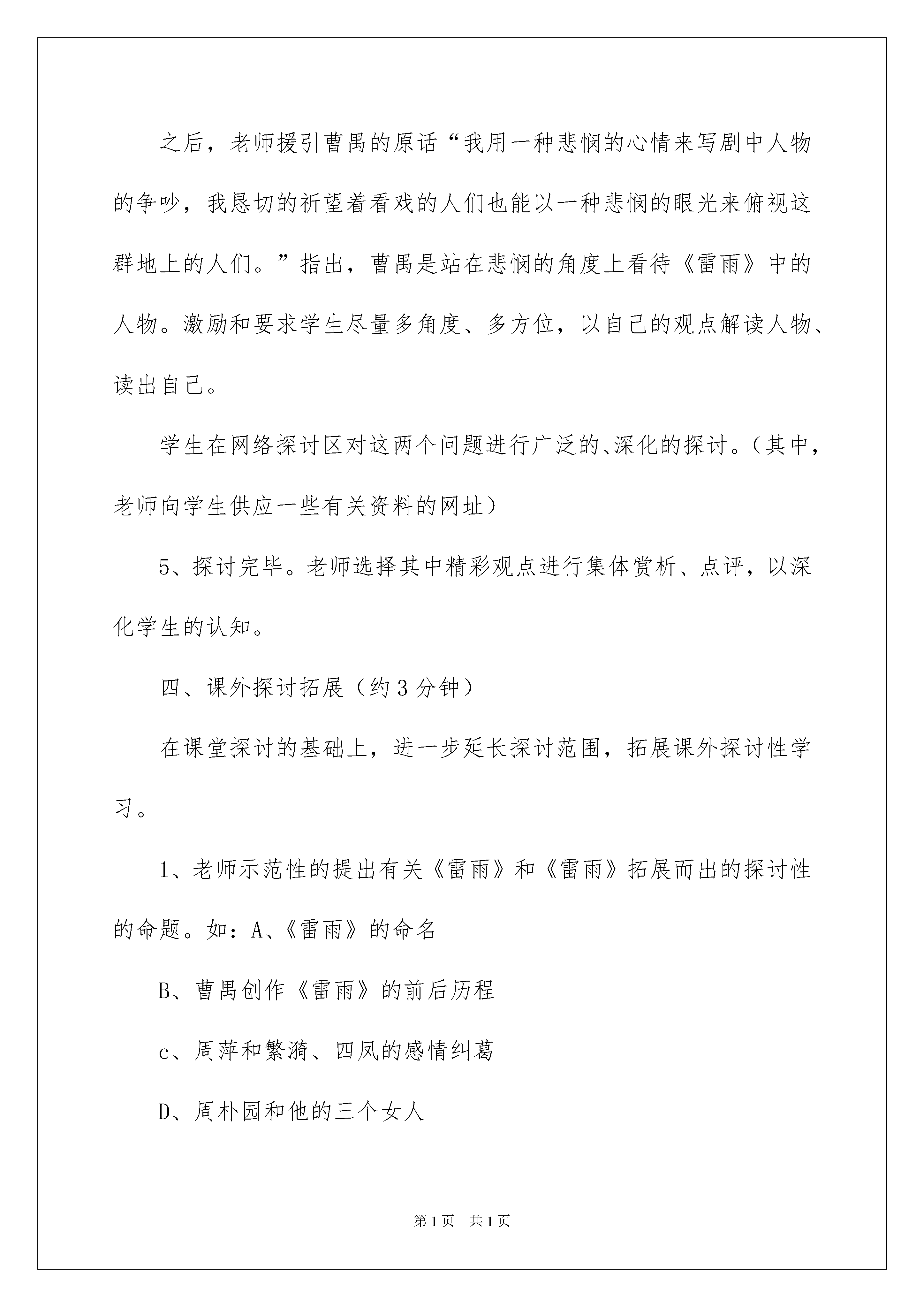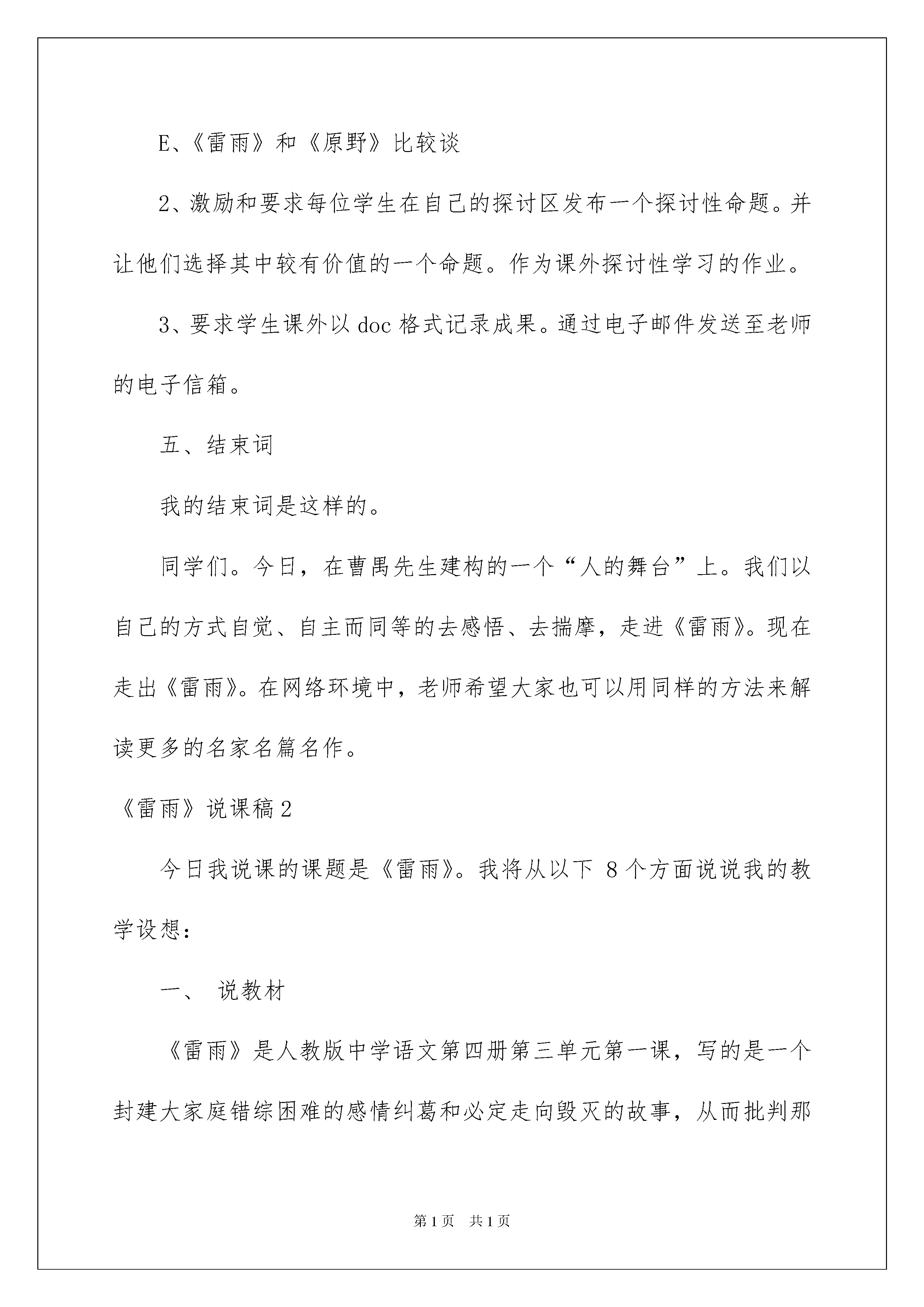 2022《雷雨》说课稿《雷雨》说课稿作为一位杰出的老师有必要进行细致的说课稿打算工作说课稿是进行说课打算的文稿有着至关重要的作用。那么说课稿应当怎么写才合适呢?下面是我为大家整理的《雷雨》说课稿希望能够帮助到大家。《雷雨》说课