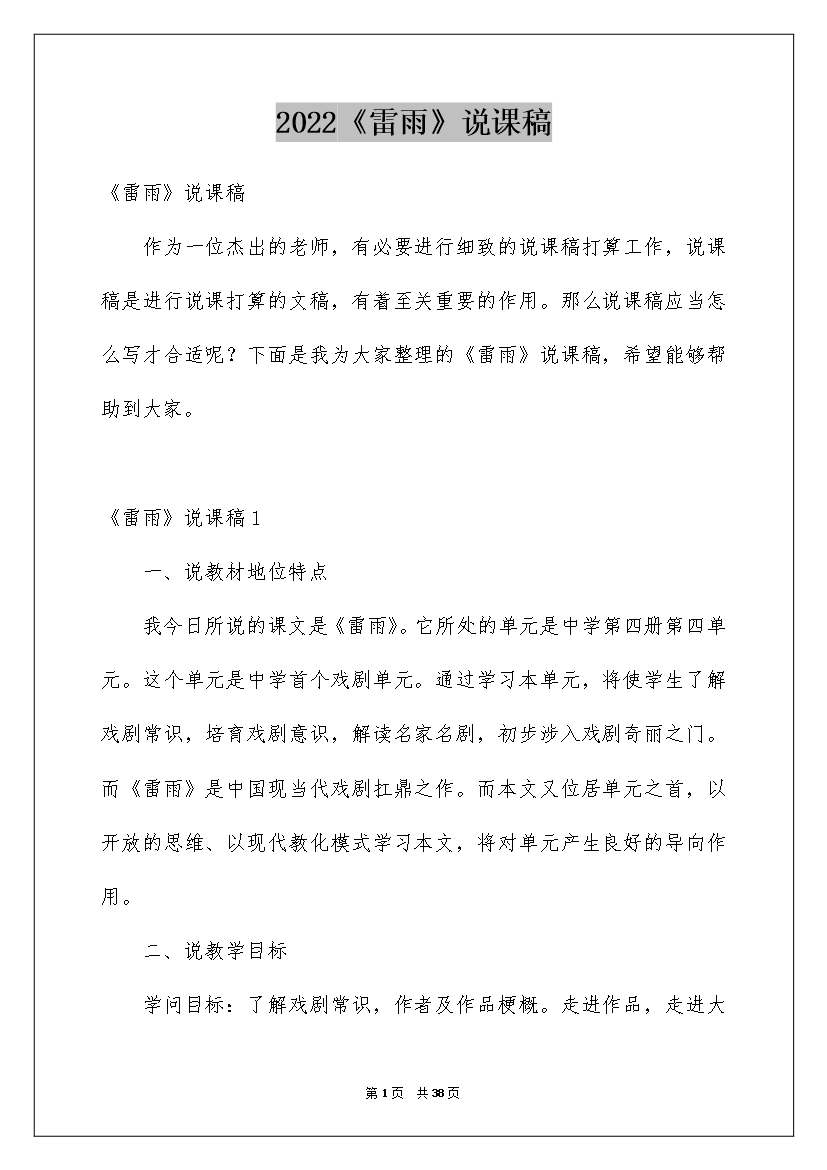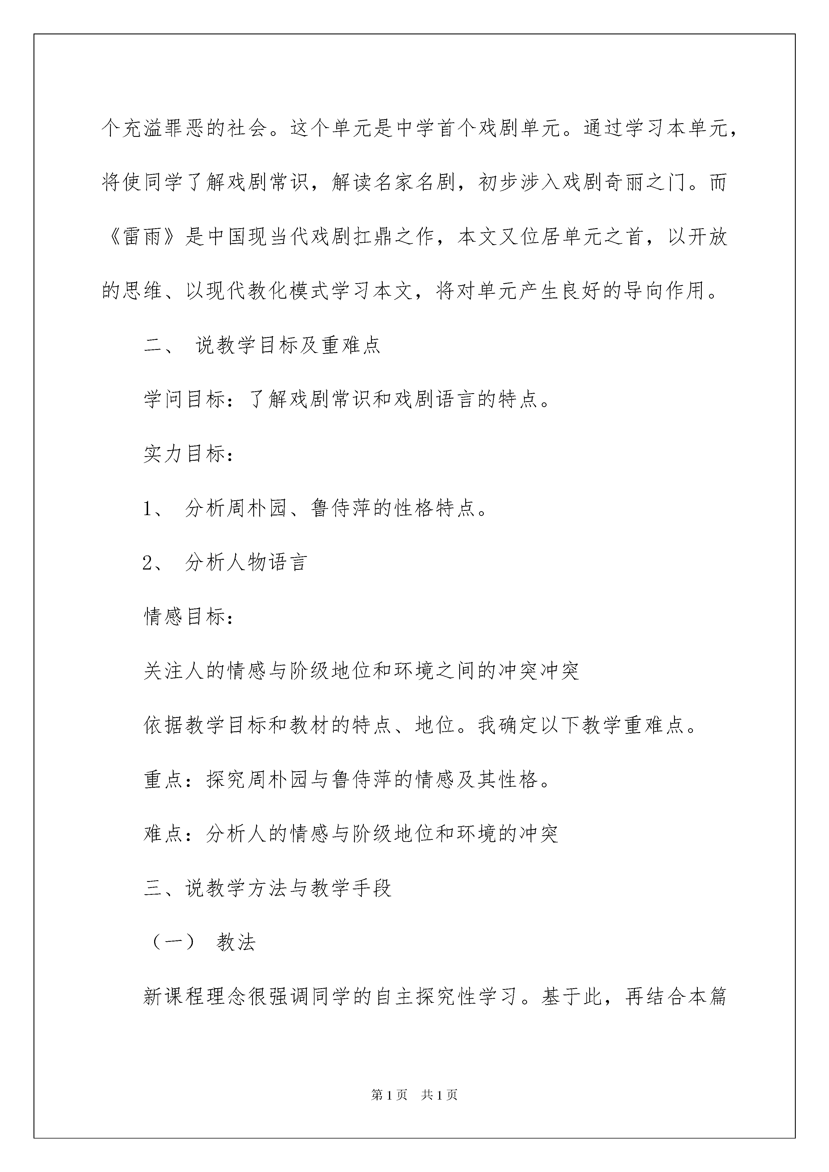 2022《雷雨》说课稿《雷雨》说课稿作为一位杰出的老师,有必要进行细致的说课稿打算工作,说课稿是进行说课打算的文稿,有着至关重要的作用。那么说课稿应当怎么写才合适呢?下面是我为大家整理的《雷雨》说课稿,希望能够帮助到大家。《雷雨》说课稿1一、说教材地位特点我今日所说的课文是《雷雨》。它所处的单元是中学第四册第四单元。这个单元是中学首个戏剧单元。通过