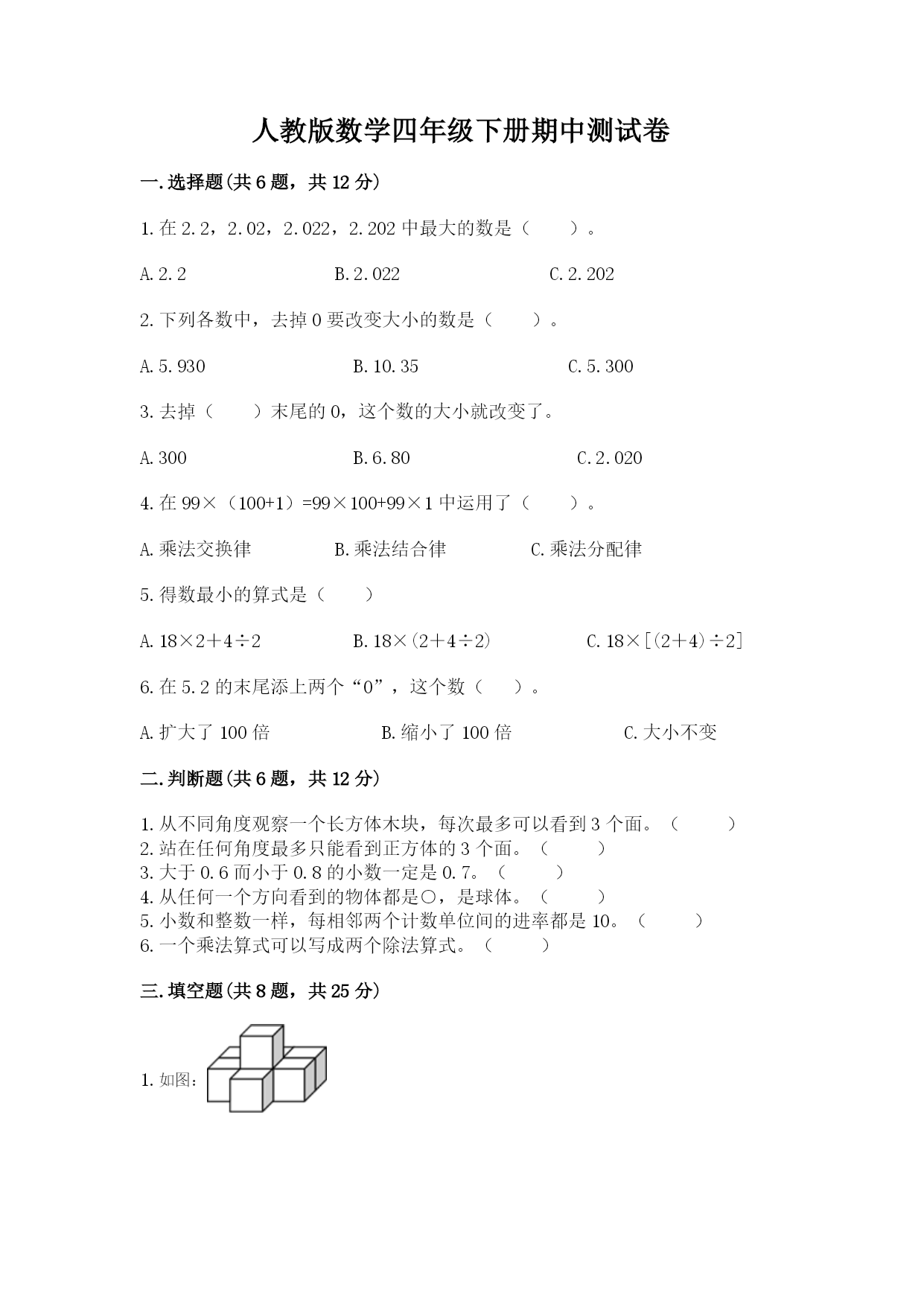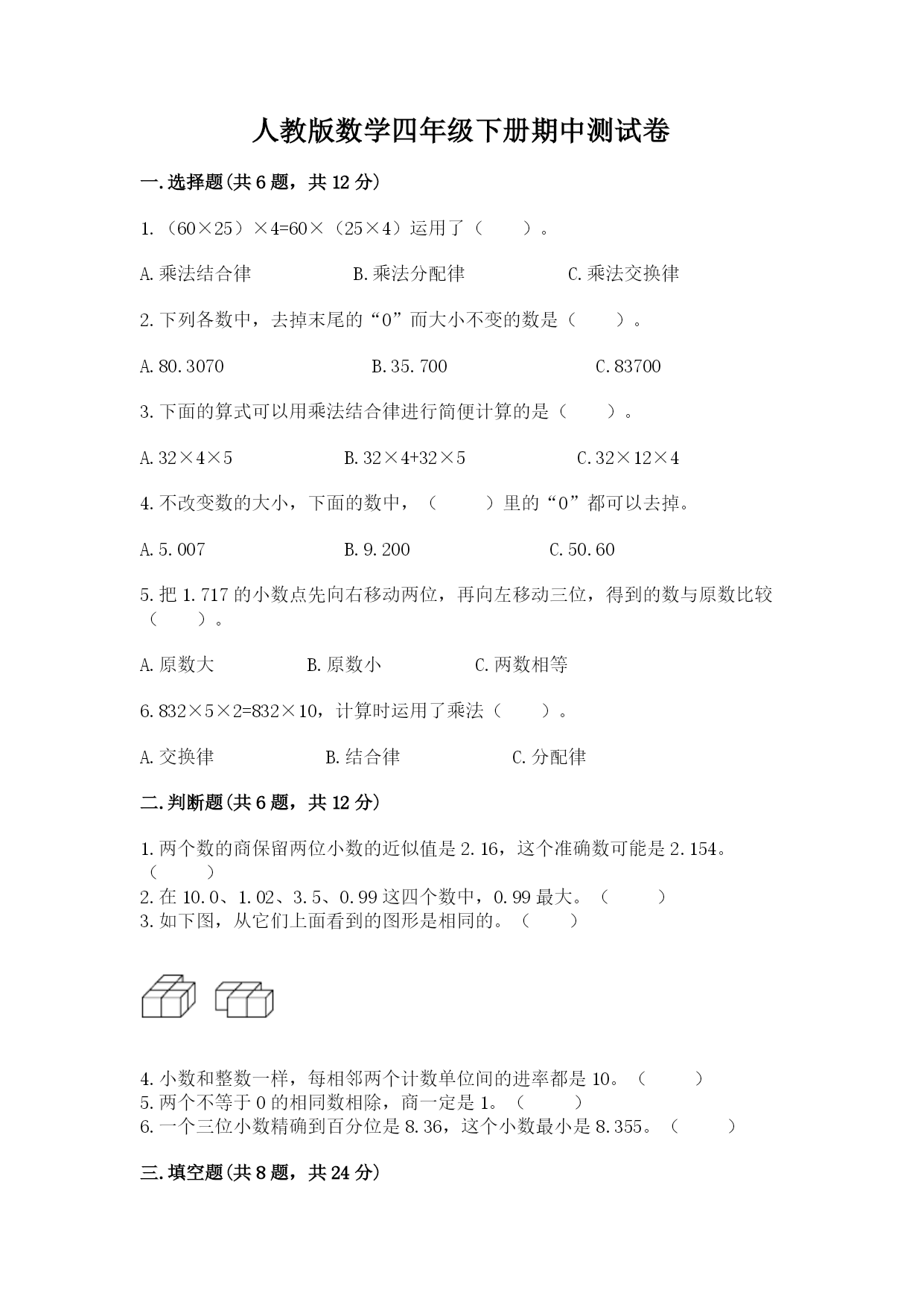 人教版数学四年级下册期中测试卷一.选择题(共6题,共12分)1.(60×25)×4=60×(25×4)运用了()。A.乘法结合律B.乘法分配律C.乘法交换律2.下列各数中,去掉末尾的“0”而大小不变的数是()。A.80.3070B.35.700C.837003.下面的算式可以用乘法结合律进行简便计算的是()。A.32×4×5B.32×4+32×5C.32×12×44.不改变数的大小,下面的数中,()里的“0”都可以去掉。A.5.007B.9.200C.50.605.把1.717的小数点先向右移动两位,再向
