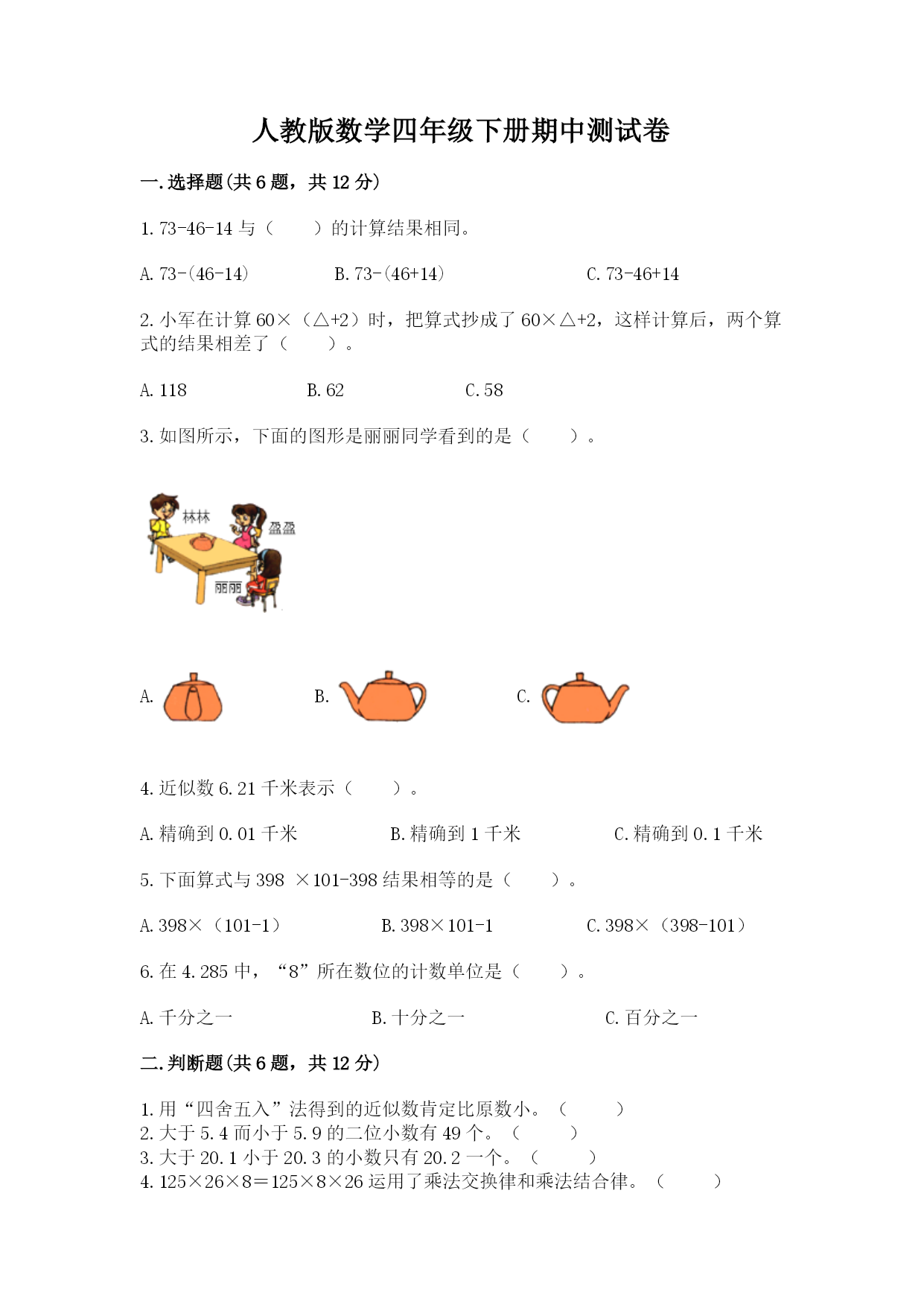 人教版数学四年级下册期中测试卷一.选择题(共6题,共12分)1.73-46-14与()的计算结果相同。A.73-(46-14)B.73-(46+14)C.73-46+142.小军在计算60×(△+2)时,把算式抄成了60×△+2,这样计算后,两个算式的结果相差了()。A.118B.62C.583.如图所示,下面的图形是丽丽同学看到的是()。A.B.C.4.近似数6.21千米表示()。A.精确到0.01千米B.精确到1千米C.精确到0.1千米5.下面算式与398×101-398结果相等的是()。A.398×