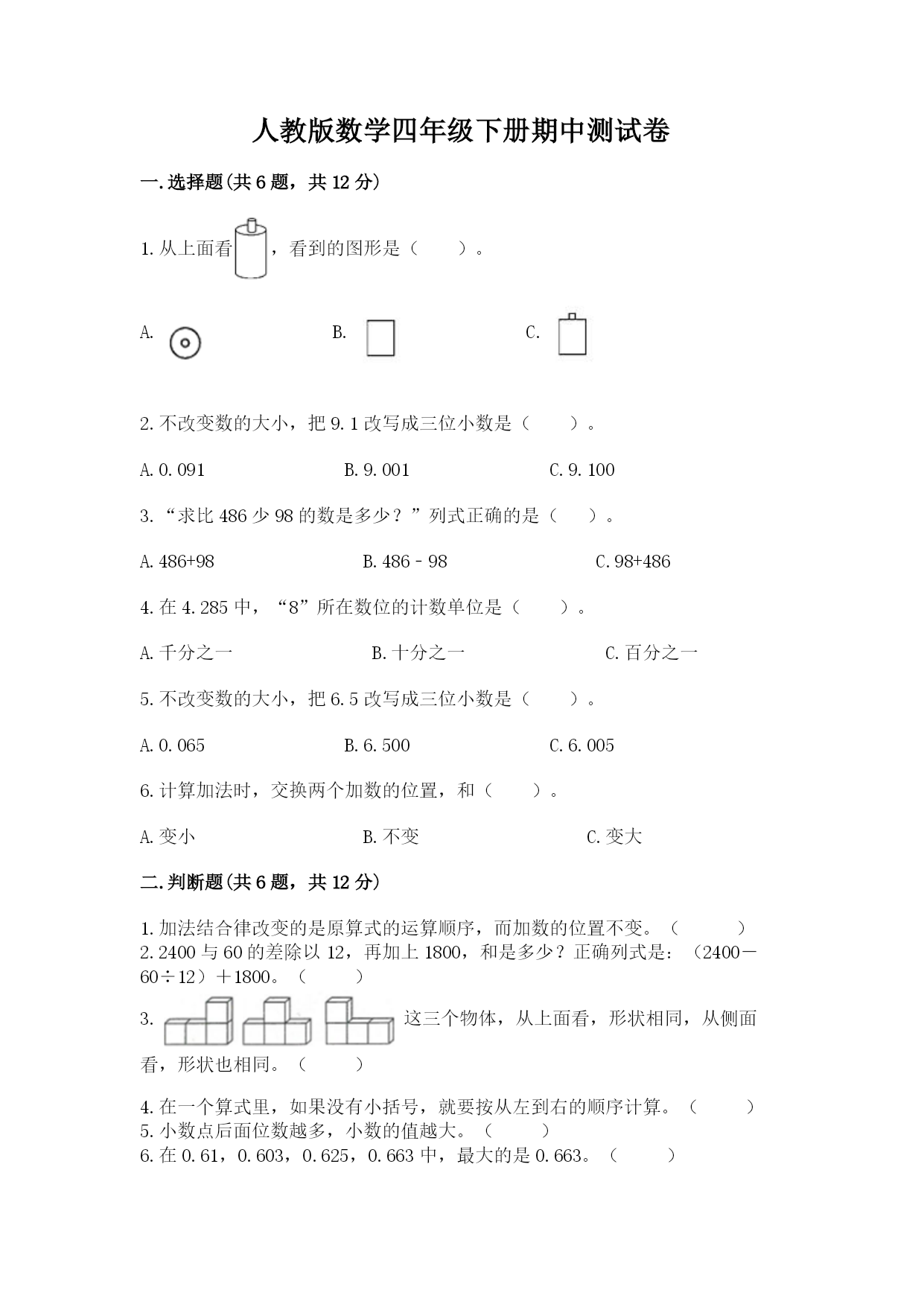 人教版数学四年级下册期中测试卷一.选择题(共6题,共12分)1.从上面看,看到的图形是()。A.B.C.2.不改变数的大小,把9.1改写成三位小数是()。A.0.091B.9.001C.9.1003.“求比486少98的数是多少?”列式正确的是()。A.486+98B.486﹣98C.98+4864.在4.285中,“8”所在数位的计数单位是()。A.千分之一B.十分之一C.百分之一5.不改变数的大小,把6.5改写成三位小数是()。A.0.065B.6.500C.6.0056.计算加法时,交换两个加数的位