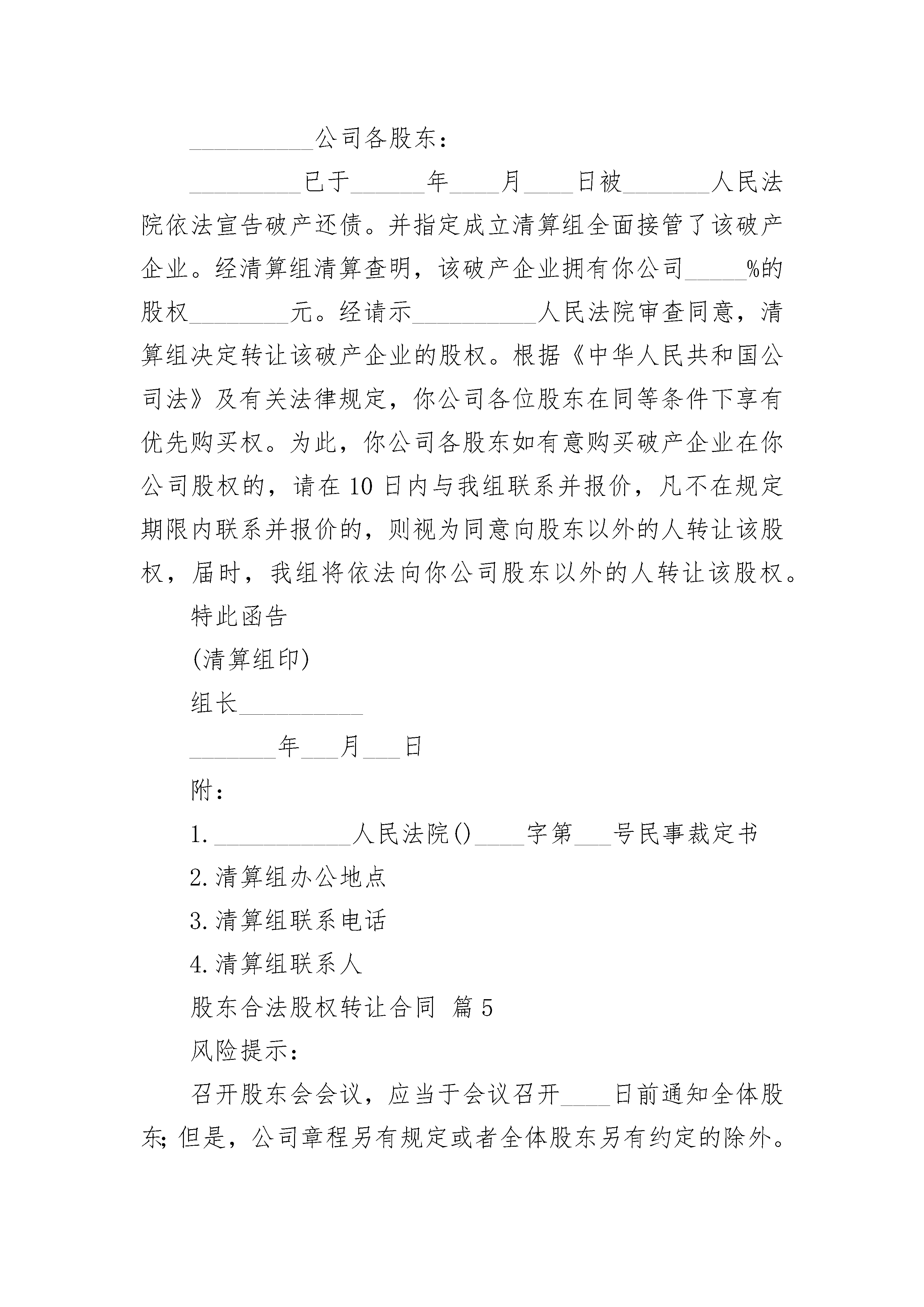 股东合法股权转让合同股东合法股权转让合同(精选21篇)股东合法股权转让合同篇1出让方:住址:法定代表人:受让方:住址:法定代表人:甲、乙双方根据有关法律、法规的规定,经友好协商,就甲方将其所持公司%的股权转让给乙方之相关事宜,达成一致,特签订本合同,以使各方遵照执行。一、转让标的甲方向乙方转让的标的为:甲方合法持有目标公司%的股权。二、各方的陈述与保证1、甲方的陈述与保证:甲方为依法成立并合法存续的公司法人,具有独立民事行为能力;甲方为目标公司的股东,合法持有该公司%的股权;甲方承诺本次向乙方转让其所
