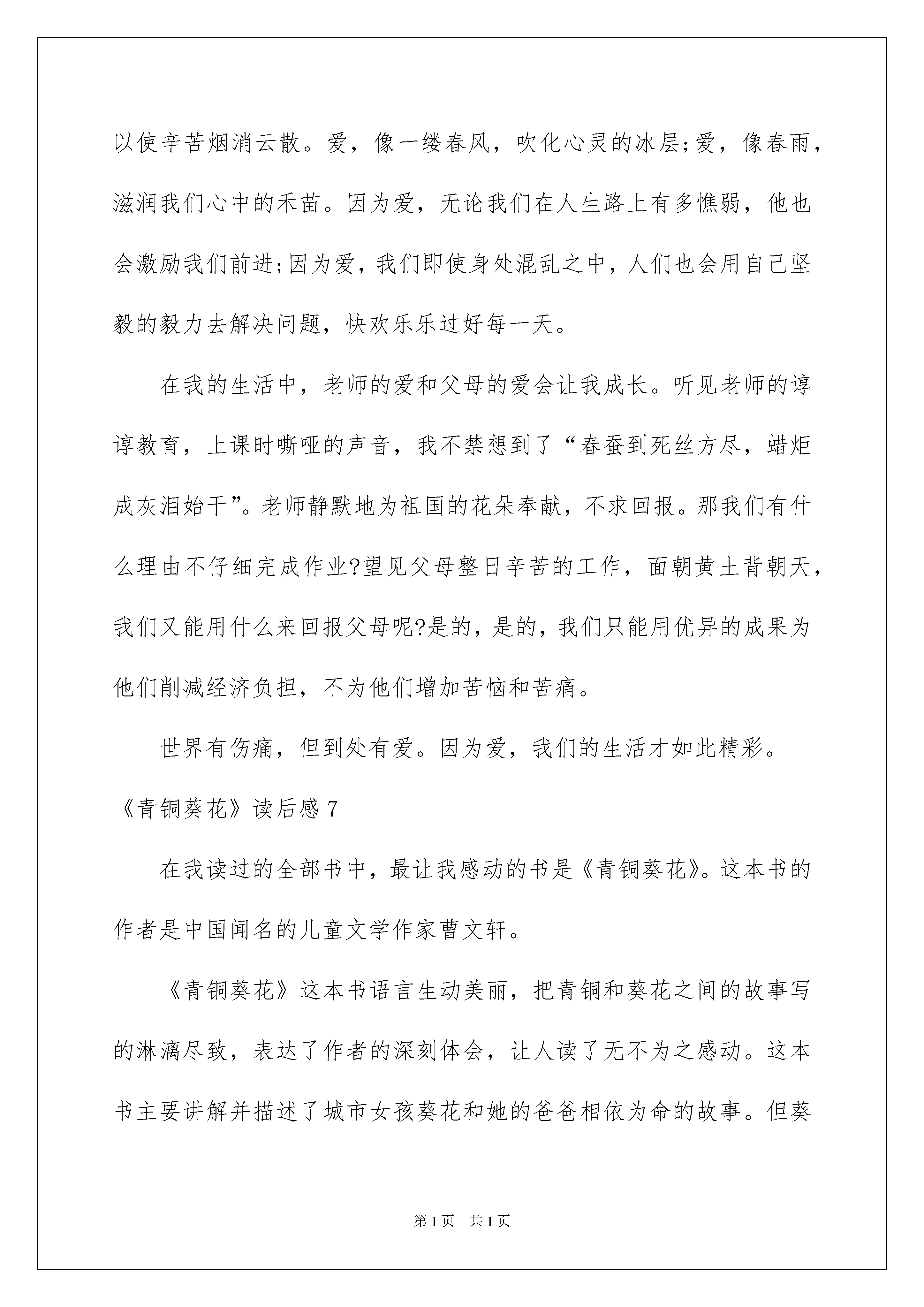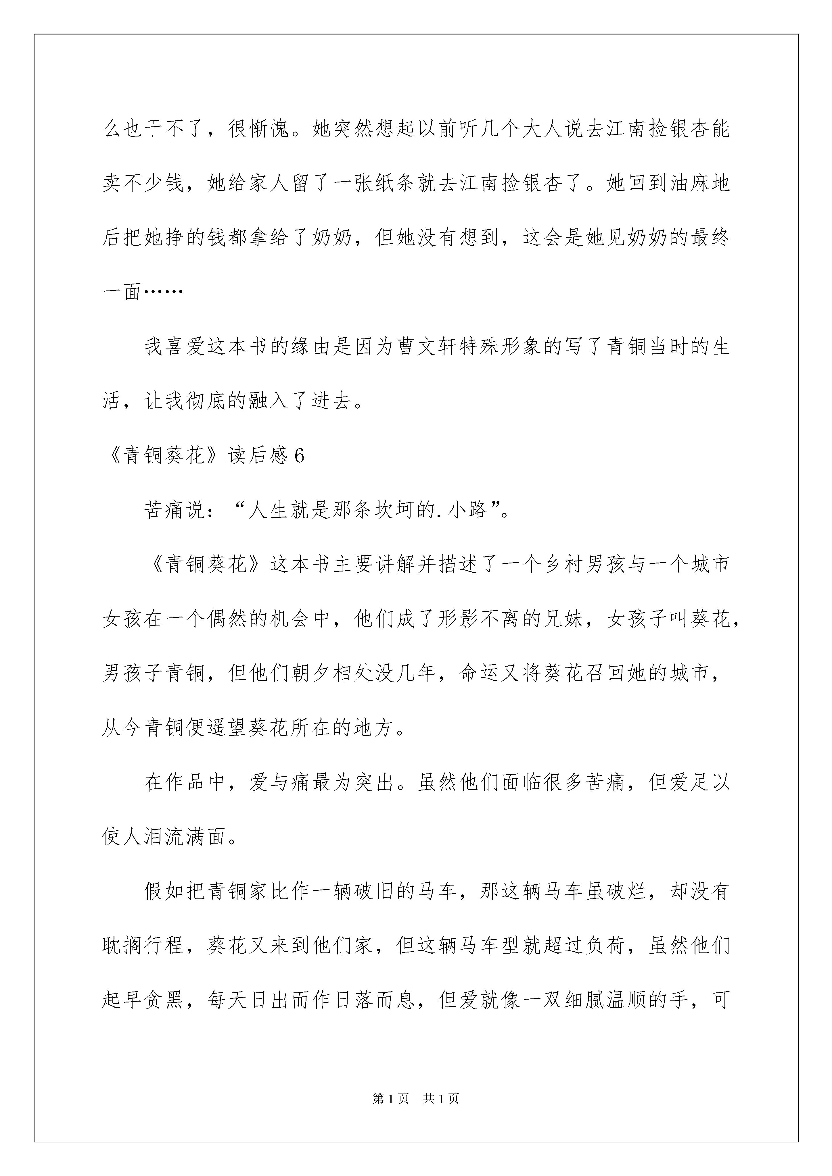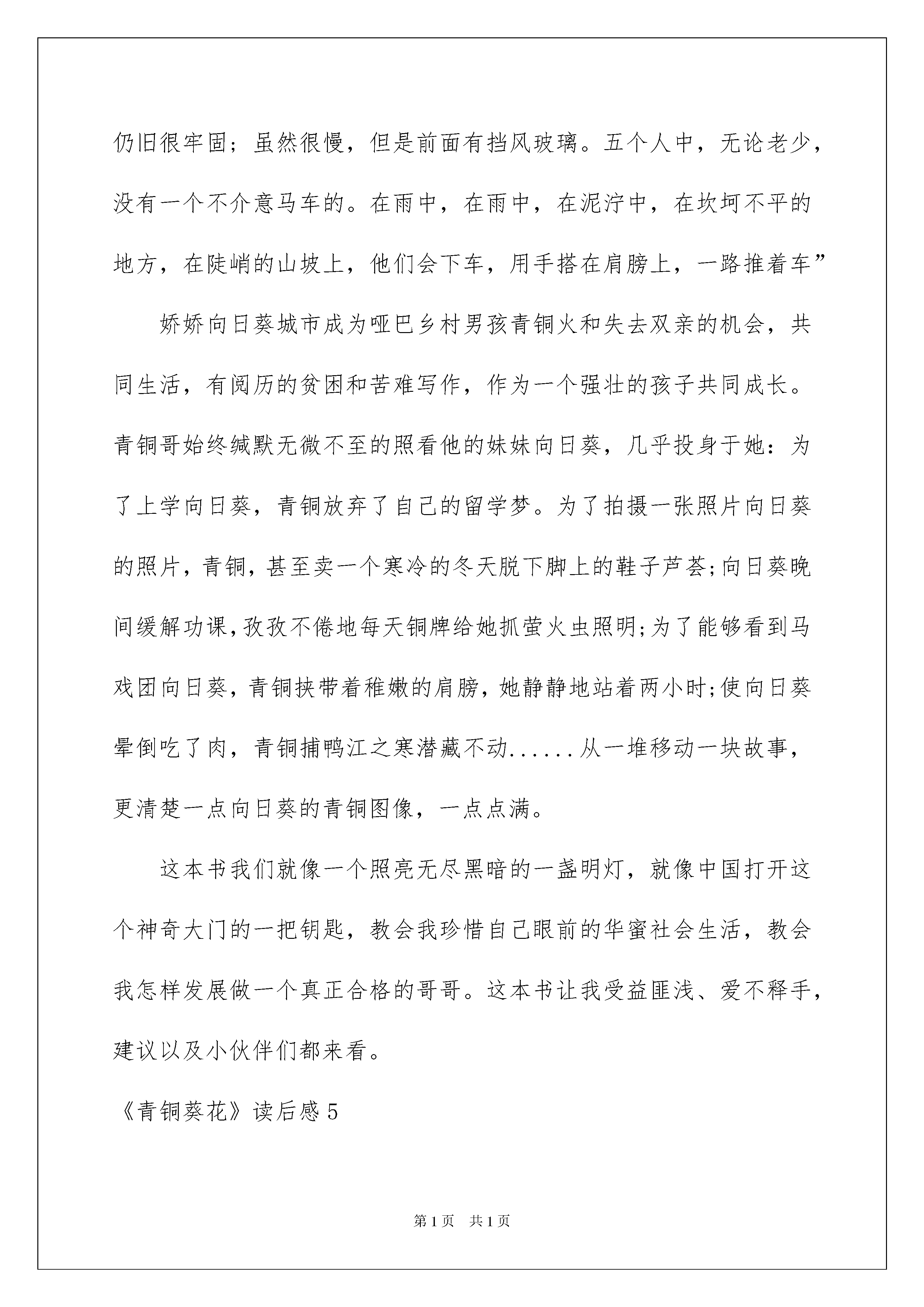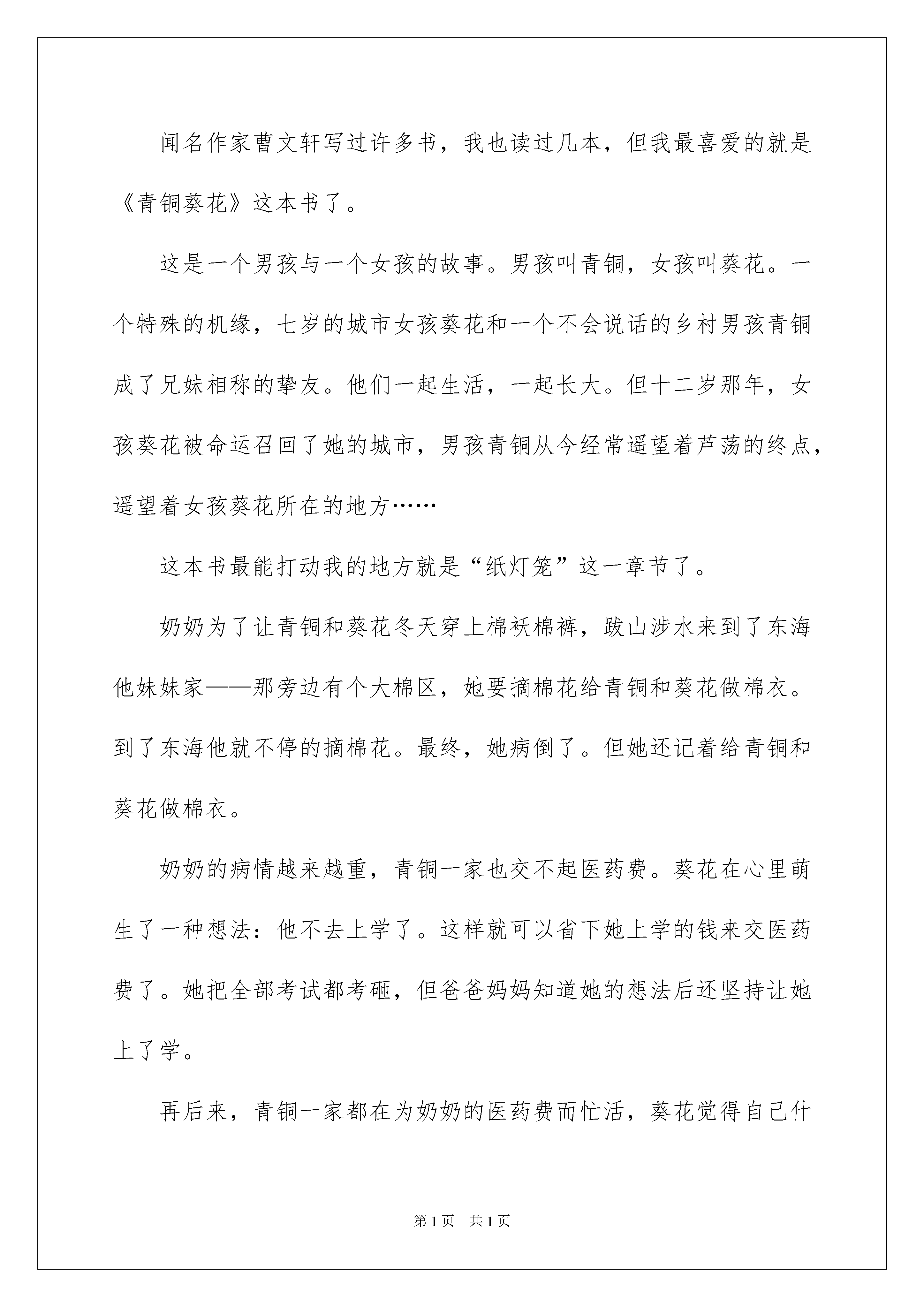 2022《青铜葵花》读后感《青铜葵花》读后感(15篇)当仔细看完一本名著后信任大家都有许多值得共享的东西此时须要仔细思索读后感如何写了哦。那么读后感究竟应当怎么写呢?下面是我为大家收集的《青铜葵花》读后感希望能够帮助到