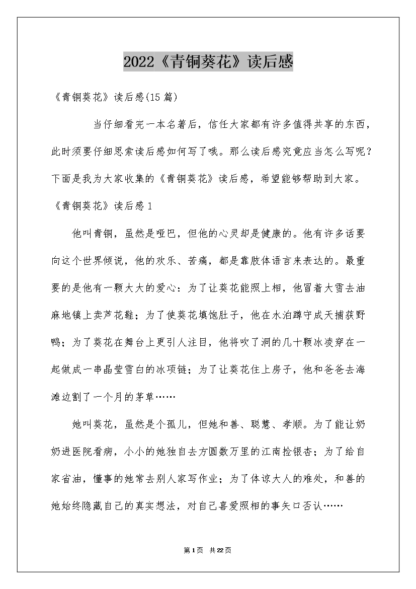 2022《青铜葵花》读后感《青铜葵花》读后感(15篇)当仔细看完一本名著后,信任大家都有许多值得共享的东西,此时须要仔细思索读后感如何写了哦。那么读后感究竟应当怎么写呢?下面是我为大家收集的《青铜葵花》读后感,希望能够帮助到大家。《青铜葵花》读后感1他叫青铜,虽然是哑巴,但他的心灵却是健康的。他有许多话要向这个世界倾说,他的欢乐、苦痛,都是靠肢体语言