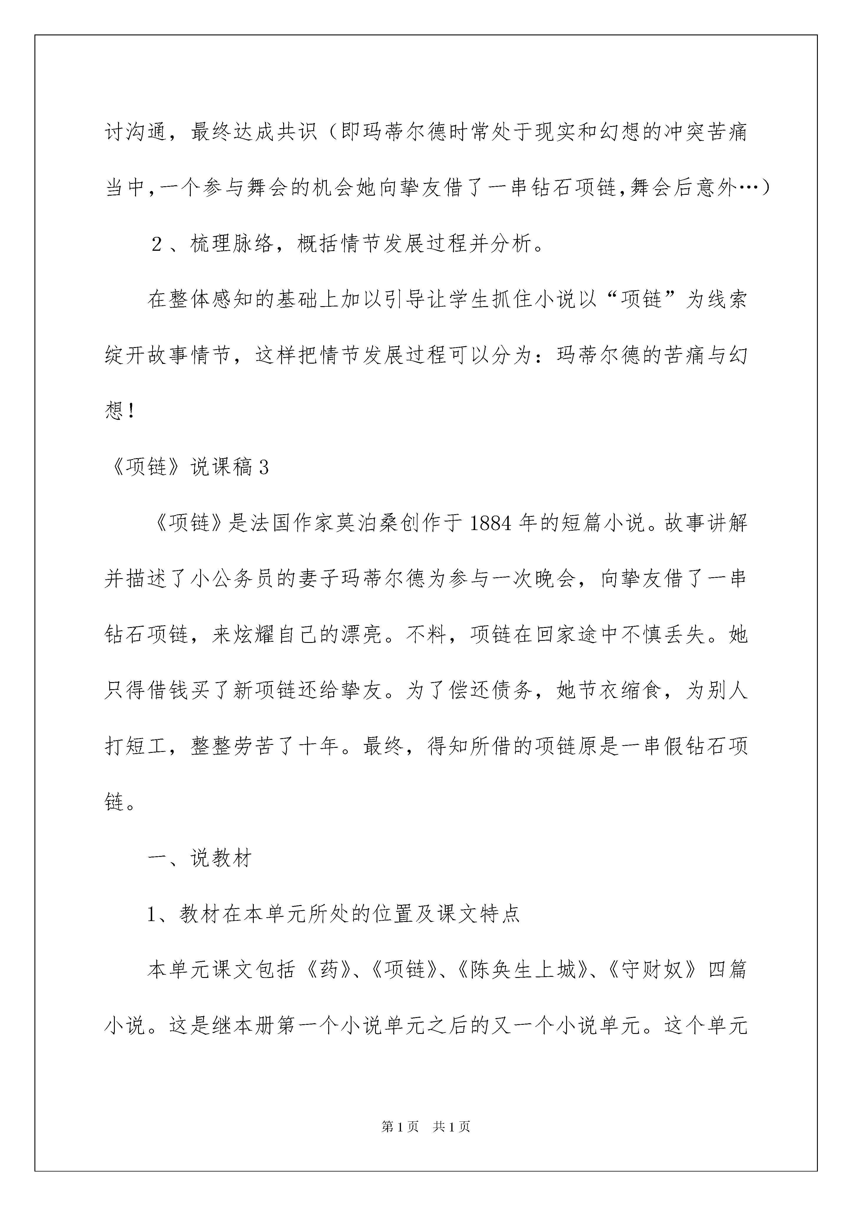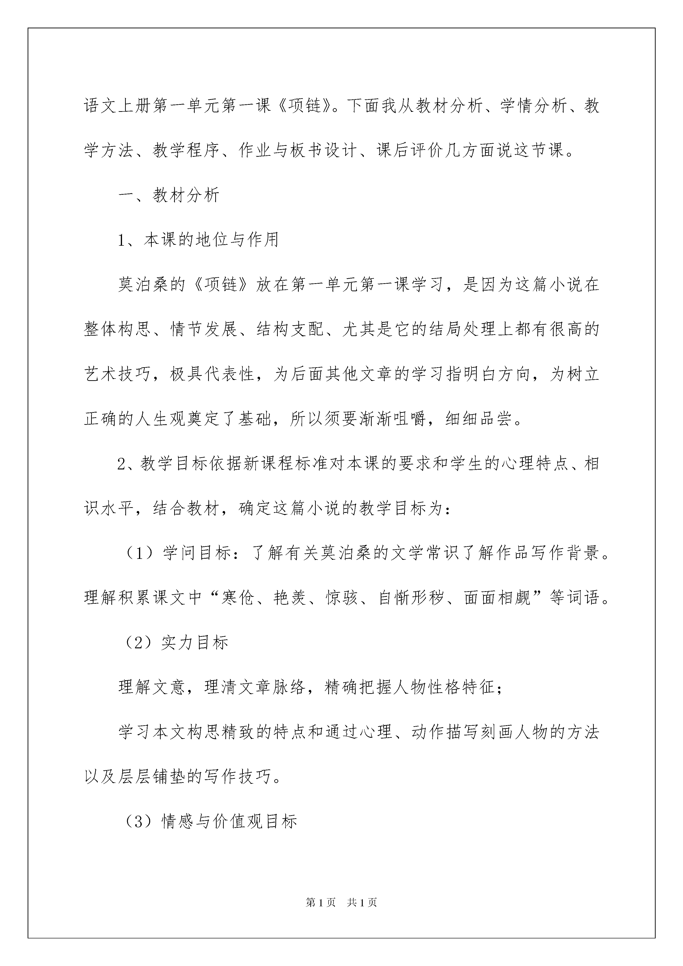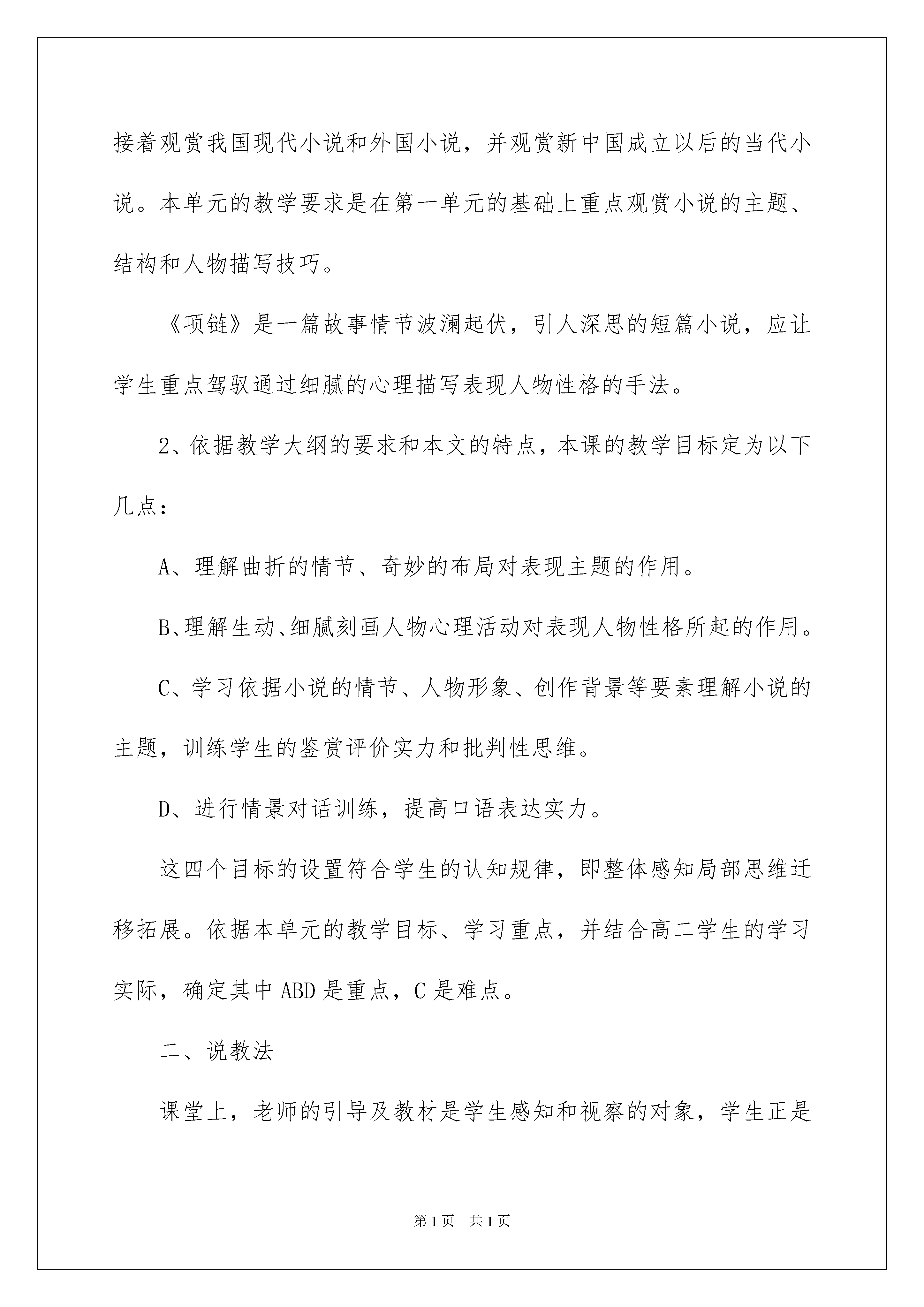 2022《项链》说课稿《项链》说课稿8篇作为一名教职工很有必要细心设计一份说课稿说课稿有助于提高老师理论素养和驾驭教材的实力。说课稿应当怎么写才好呢?以下是我为大家收集的《项链》说课稿希望对大家有所帮助。《项链》说课
