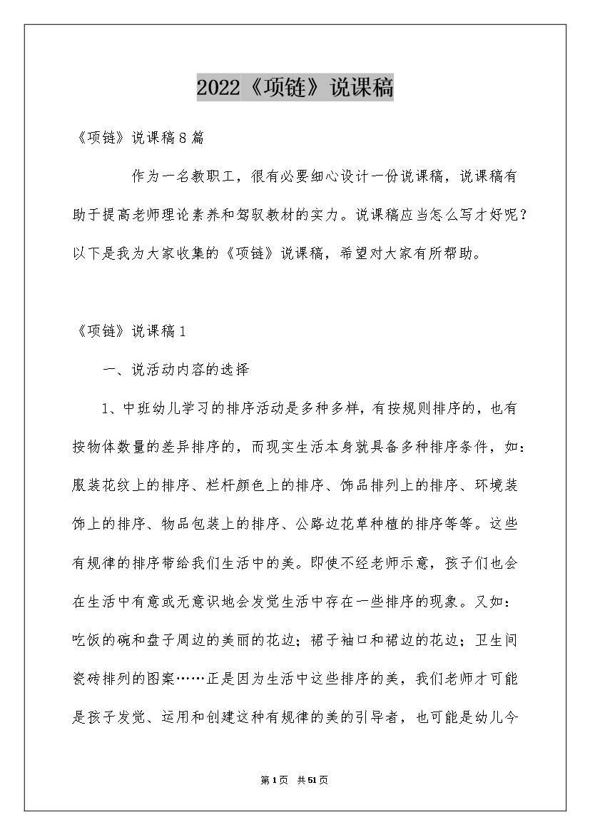 2022《项链》说课稿《项链》说课稿8篇作为一名教职工,很有必要细心设计一份说课稿,说课稿有助于提高老师理论素养和驾驭教材的实力。说课稿应当怎么写才好呢?以下是我为大家收集的《项链》说课稿,希望对大家有所帮助。《项链》说课稿1一、说活动内容的选择1、中班幼儿学习的排序活动是多种多样,有按规则排序的,也有按物体数量的差异排序的,而现实生活本身就具备多种