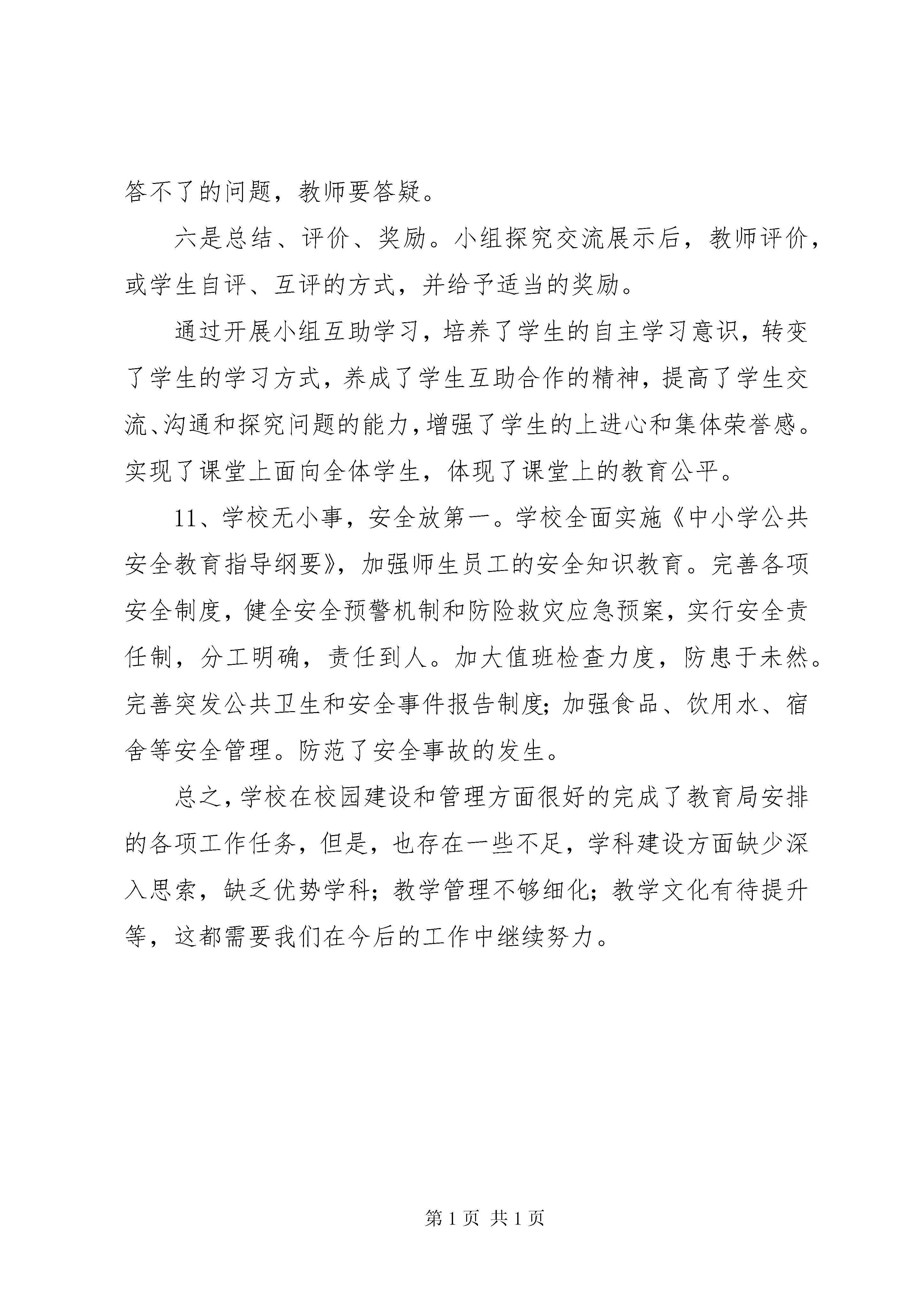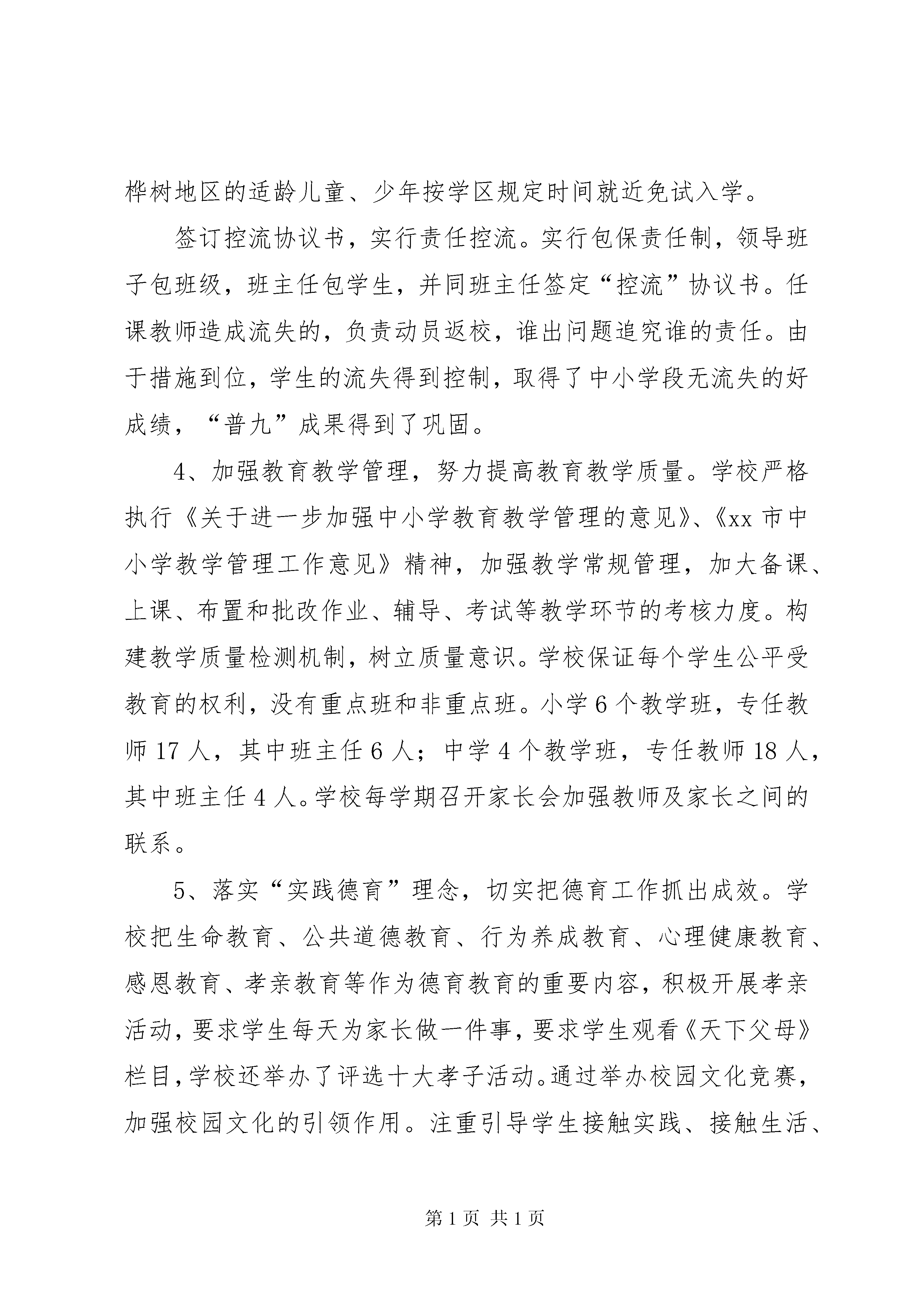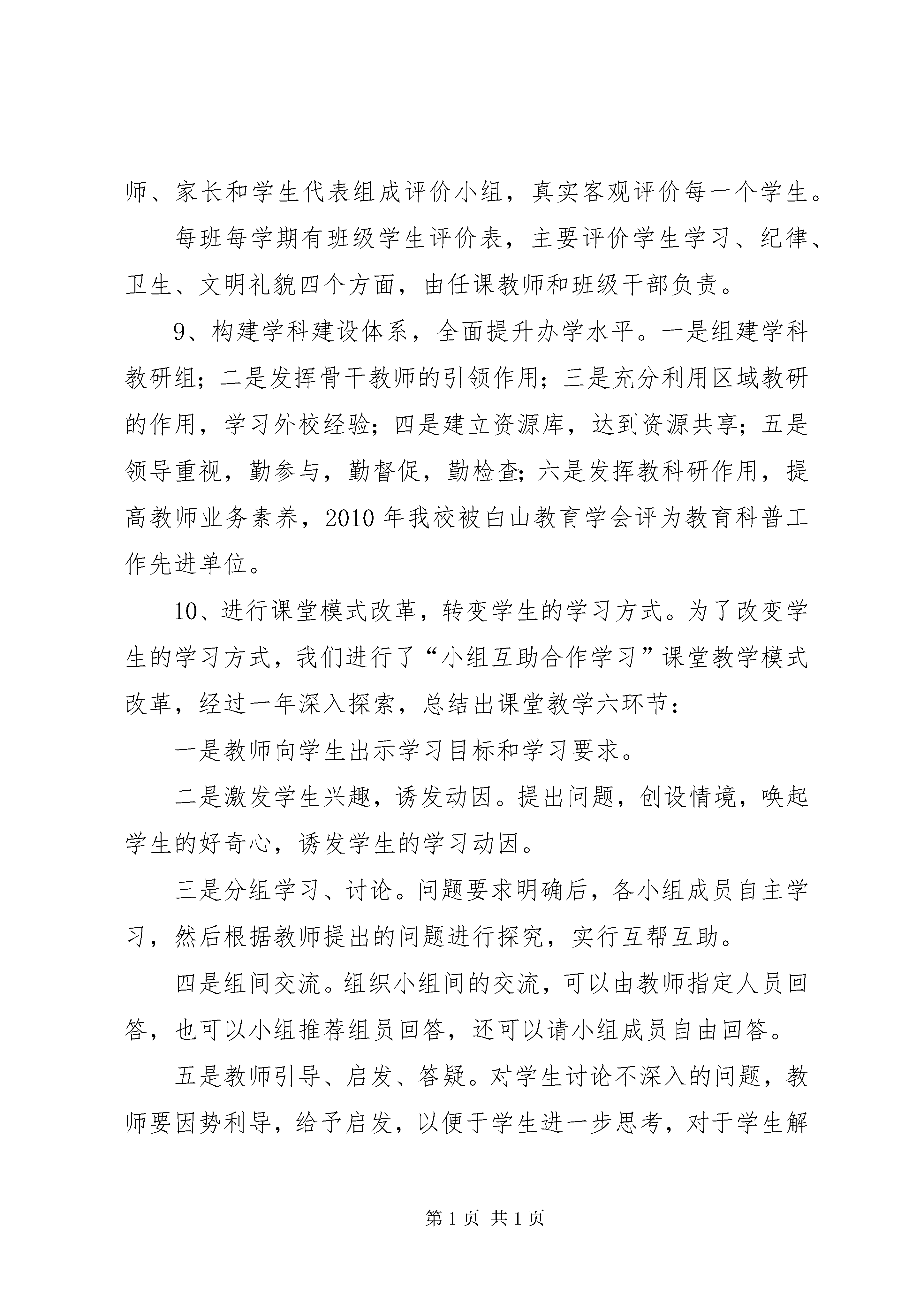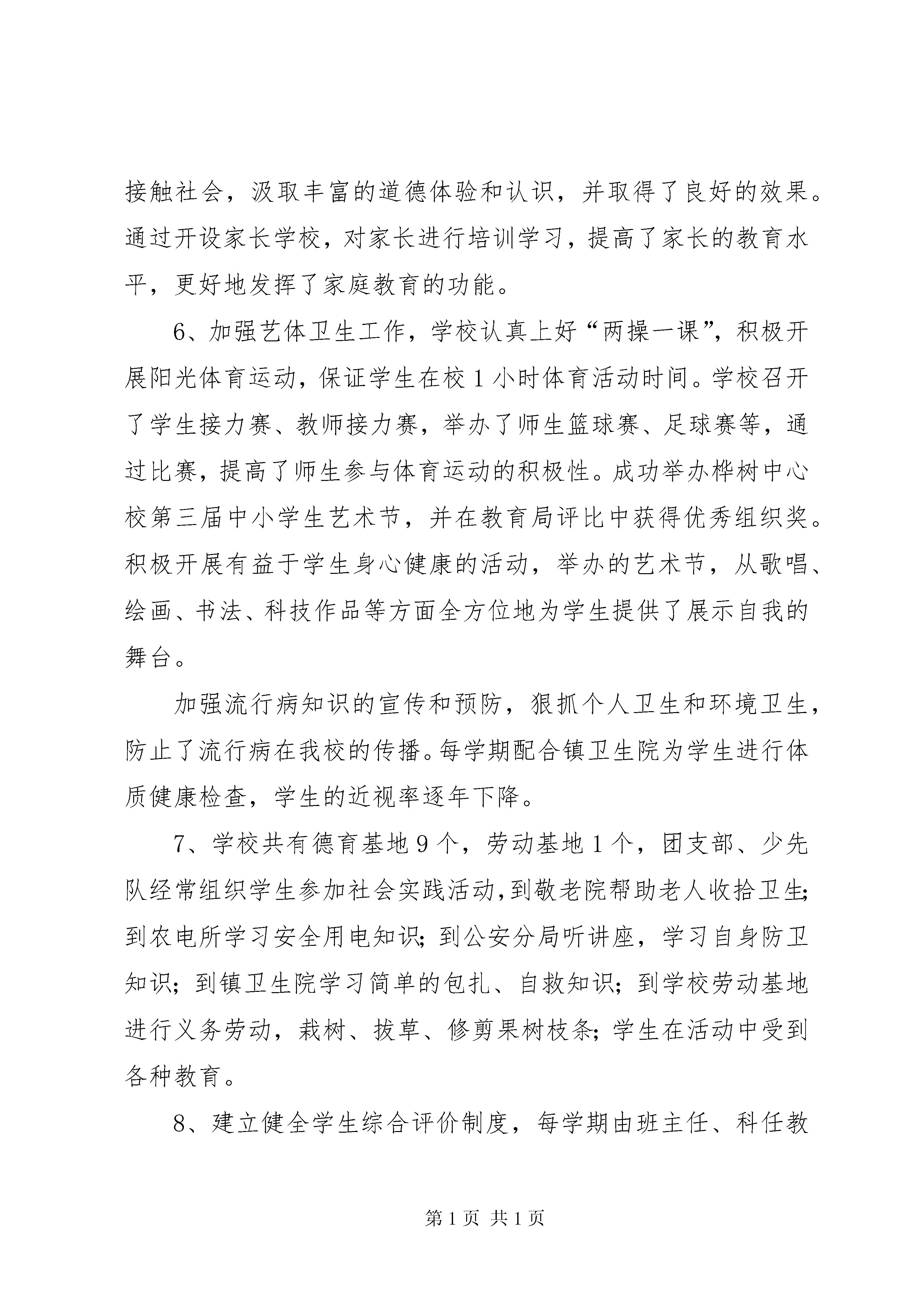 第PAGE\*Arabic\*MERGEFORMAT9页共NUMPAGES\*MERGEFORMAT9页学校达标校汇报材料一、学校概况:桦树中心学校位于桦树镇西大川村,是一所九年一贯制学校,学校占地面积12500平方米,建筑面积4119平方米。学校经过两年的努力,新建工程均已完成,教学楼、宿舍食堂及幼儿园、塑胶跑道的操场及各种塑胶球场均投入了使用。绿地、草坪、花园、景点面积为1200平方米,校园宽敞,环境宜人。学校“新老三室”齐全,仪器装备率100%,图书配备生均40册。学校各项设施全部更新,