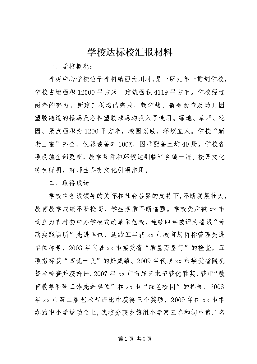 学校达标校汇报材料一、学校概况:桦树中心学校位于桦树镇西大川村,是一所九年一贯制学校,学校占地面积12500平方米,建筑面积4119平方米。学校经过两年的努力,新建工程均已完成,教学楼、宿舍食堂及幼儿园、塑胶跑道的操场及各种塑胶球场均投入了使用。绿地、草坪、花园、景点面积为1200平方米,校园宽敞,环境宜人。学校“新老三室”齐全,仪器装备率100%,图书配备生均40册。学校各项设施全部更新,教学条件和环境达到临江乡镇一流。校园文化特色鲜明,对师生具有文化引领作用。二、取得成绩学校在各级领导的关怀和社会各界