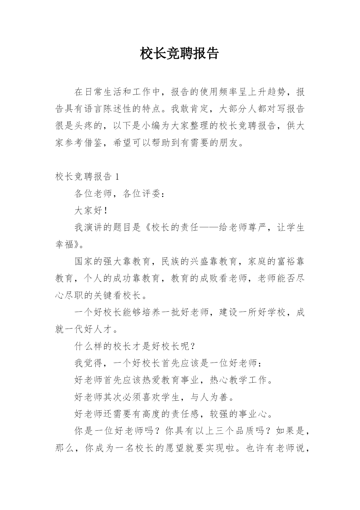 校长竞聘报告校长竞聘报告在日常生活和工作中,报告的使用频率呈上升趋势,报告具有语言陈述性的特点。我敢肯定,大部分人都对写报告很是头疼的,以下是小编为大家整理的校长竞聘报告,供大家参考借鉴,希望可以帮助到有需要的朋友。校长竞聘报告1各位老师,各位评委:大家好!我演讲的题目是《校长的责任——给老师尊严,让学生幸福》。国家的强大靠教育,民族的兴盛靠教育,家庭的富裕靠教育,个人的成功靠教育,教育的成败看老师,老师能否尽心尽职的关键看校长。一个好校长能够培养一批好老师,建设一所好学校,成就一代好人才。什么样的校长才