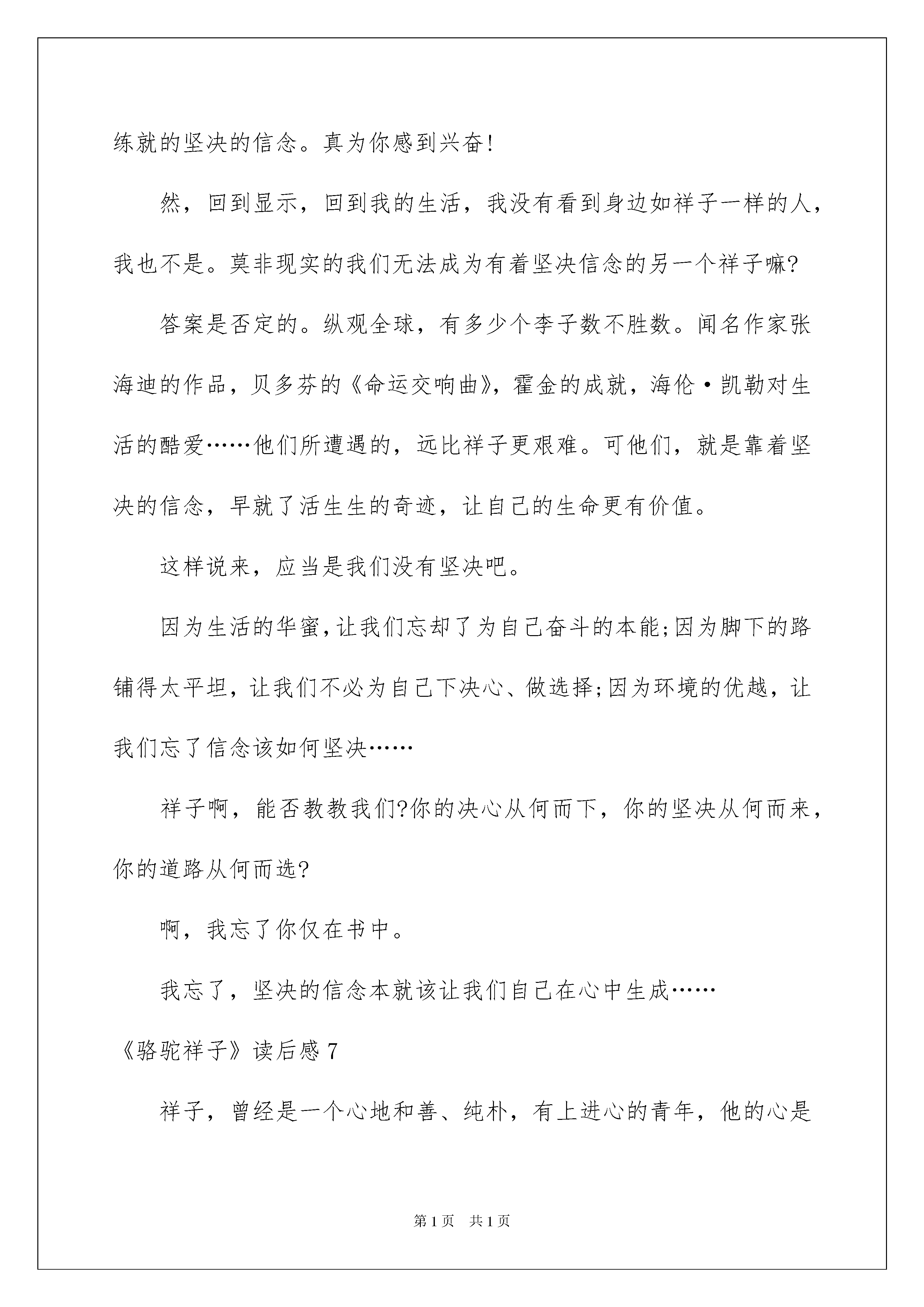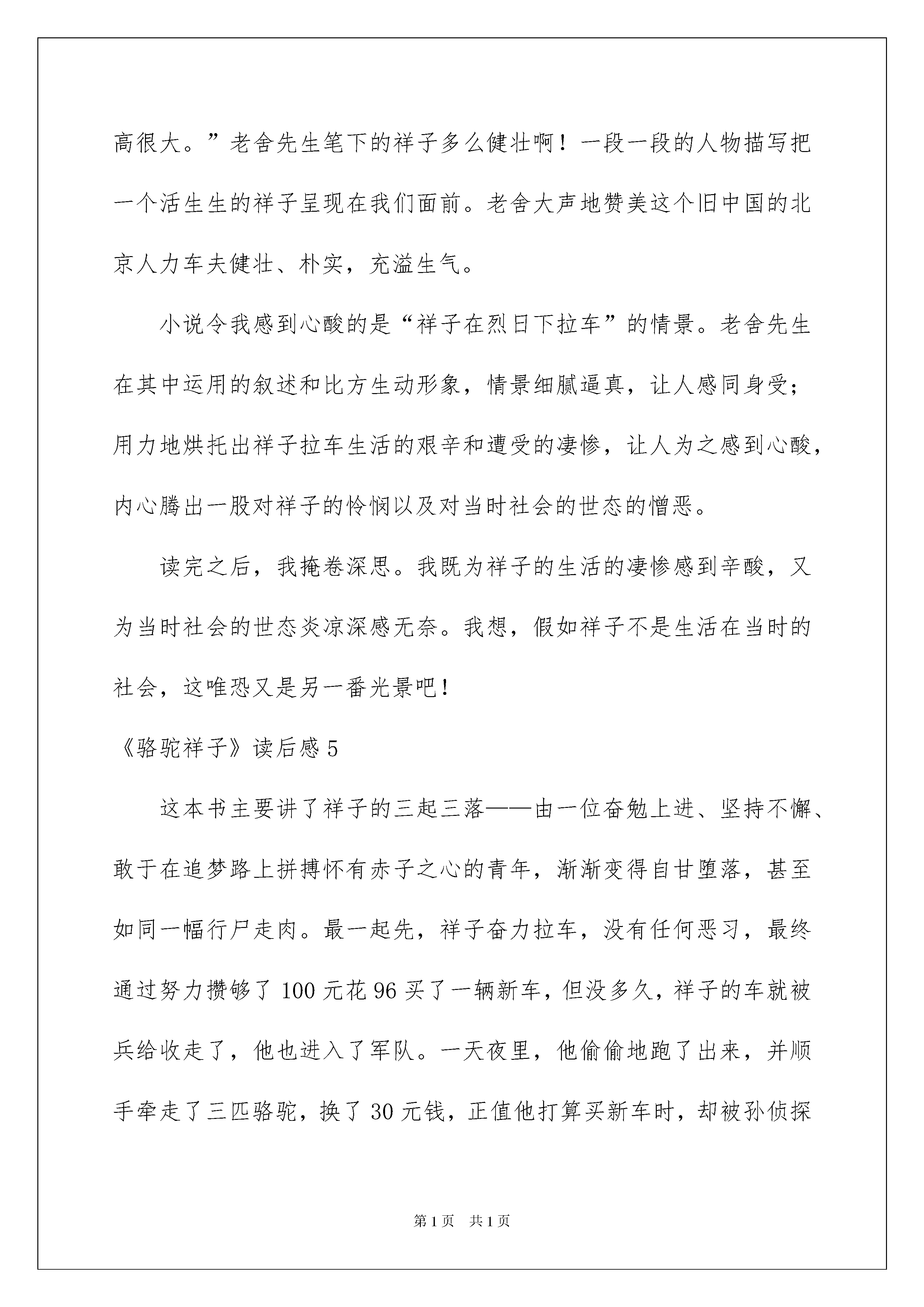 2022《骆驼祥子》读后感《骆驼祥子》读后感(汇编15篇)读完一本书以后,信任大家都增长了不少见闻,何不写一篇读后感记录下呢?那么如何写读后感才能更有感染力呢?以下是我收集整理的《骆驼祥子》读后感,仅供参考,大家一起来看看吧。《骆驼祥子》读后感1这本书中的主子公——一个要强好胜但却又醇厚,富有幻想的乡下人——祥子。他来到北平后,干起了拉车这一职业。他