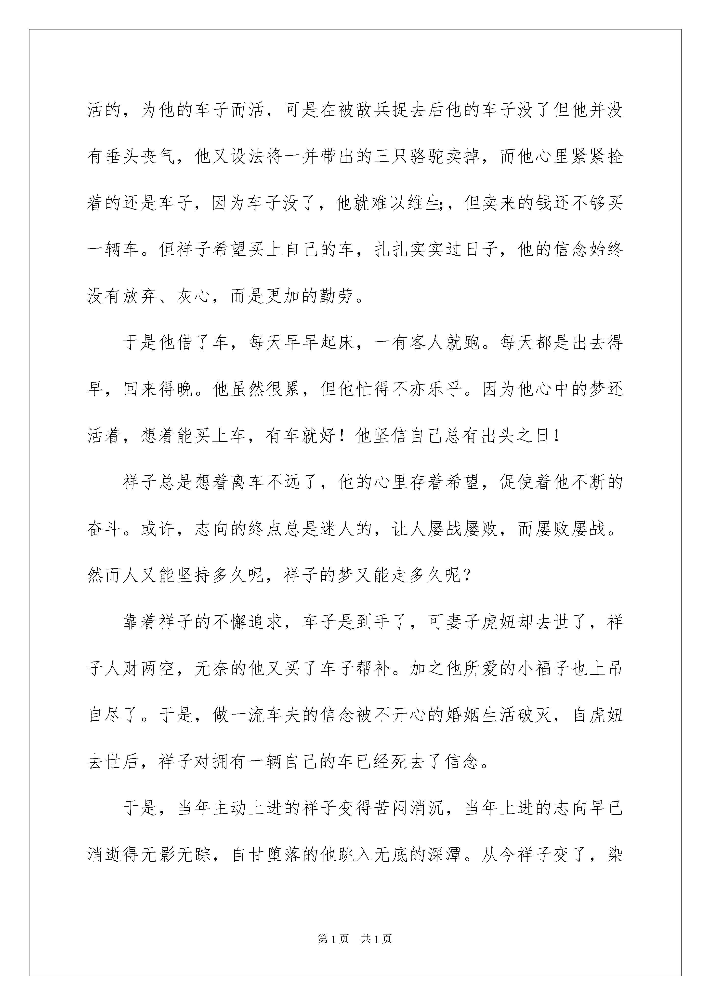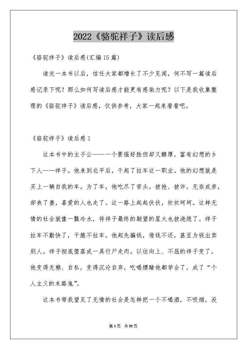 2022《骆驼祥子》读后感《骆驼祥子》读后感(汇编15篇)读完一本书以后信任大家都增长了不少见闻何不写一篇读后感记录下呢?那么如何写读后感才能更有感染力呢?以下是我收集整理的《骆驼祥子》读后感仅供参考大家一起来看看吧。《骆驼祥