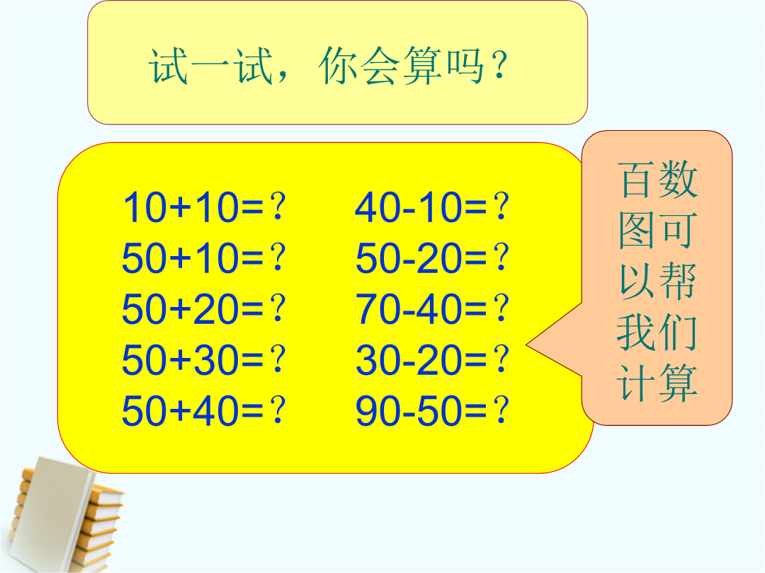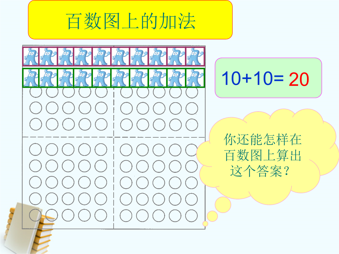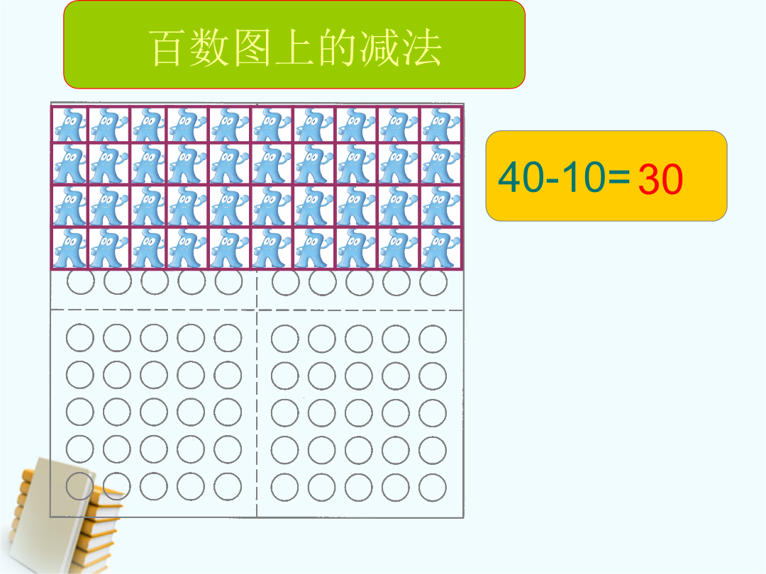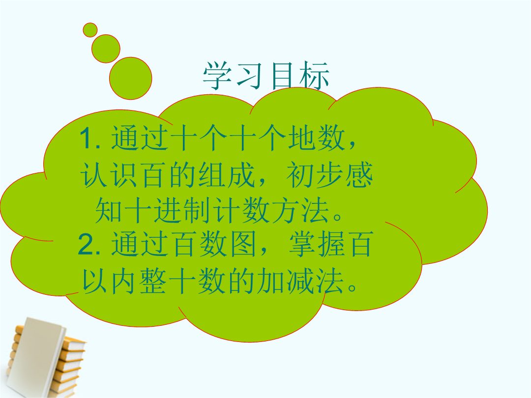 沪教版一年级数学下册学习目标袋子里有多少个小夹子?一共有多少个夹子?这里一共有多少个小圆圈?试一试,你会算吗?百数图上的加法百数图上的加法百数图上的加法百数图上的减法百数图上的减法我们使用百数图学习了整十数的加减法的计算方法,你学会了吗?